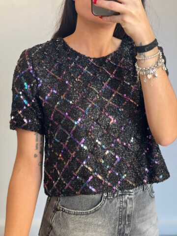 Il prezzo originale era: € 78,00.€ 39,00Il prezzo attuale è: € 39,00.Blusa paillettes cangianti – Vicolo17 Maggio 2024 -