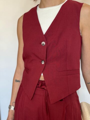 Il prezzo originale era: € 95,00.€ 47,50Il prezzo attuale è: € 47,50.Vicolo – gilet in lino con arriccio sul retro ribes29 Maggio 2025 -