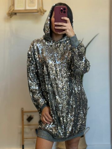 Il prezzo originale era: € 199,00.€ 99,50Il prezzo attuale è: € 99,50.Abito felpa in paiette – Vicolo1 Dicembre 2024