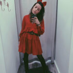 Abito asimmetrico in georgette a pois con fiocco al collo, manica a trombetta e rouches finale, vestibilità morbida