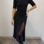 Maxi abito in maglia rasata scollo madonna con pizzo sulla schiena, fit aderente