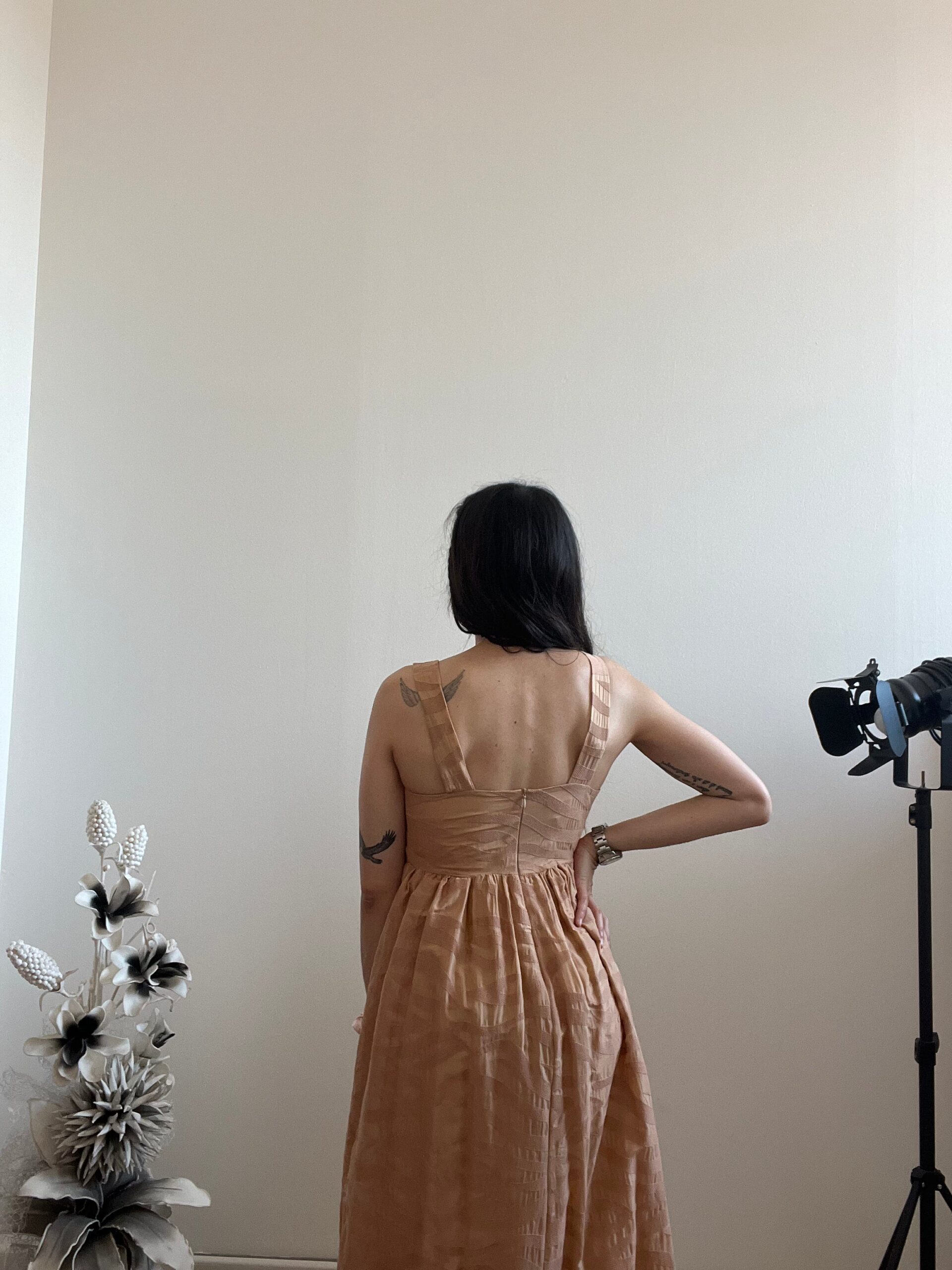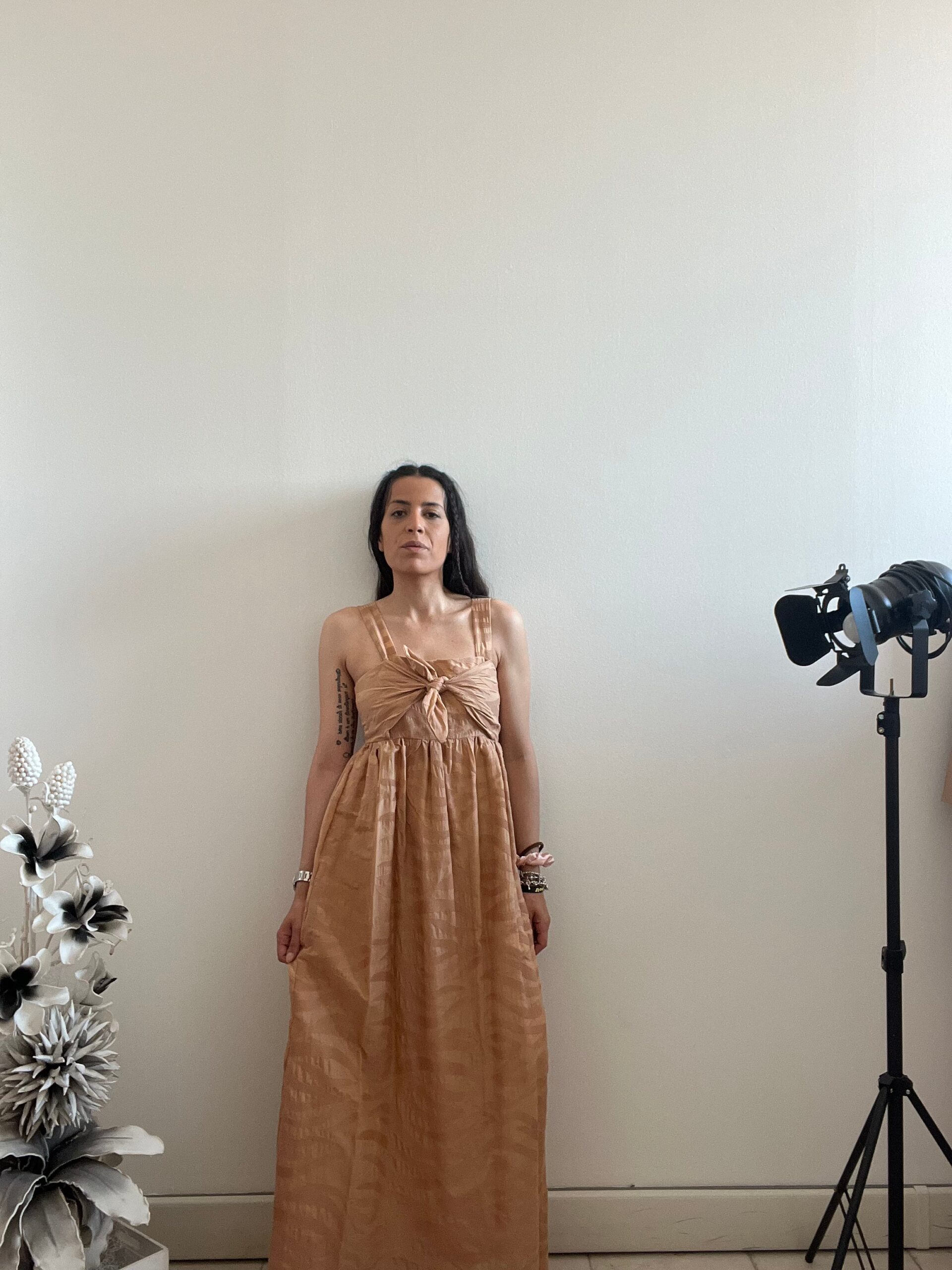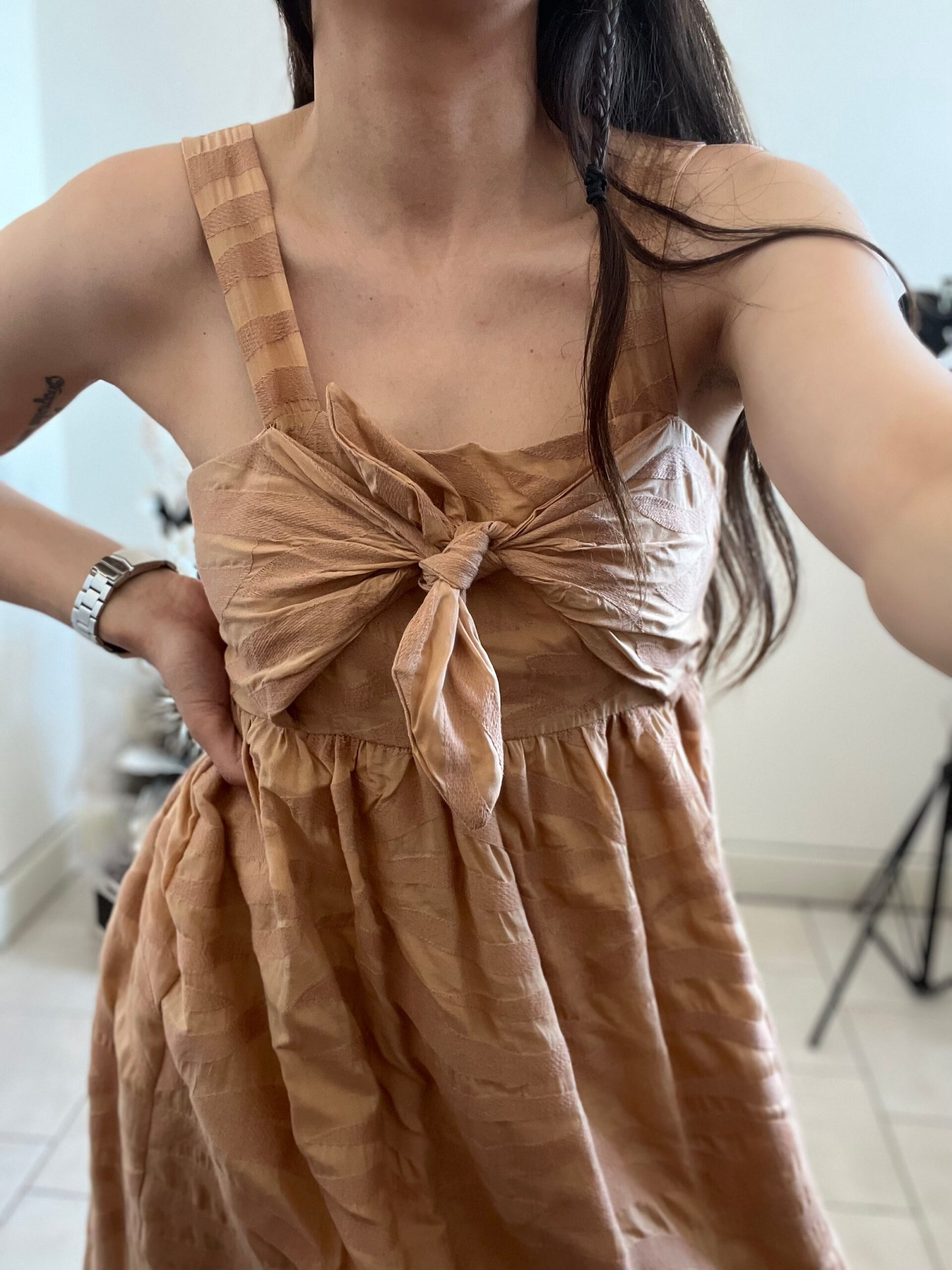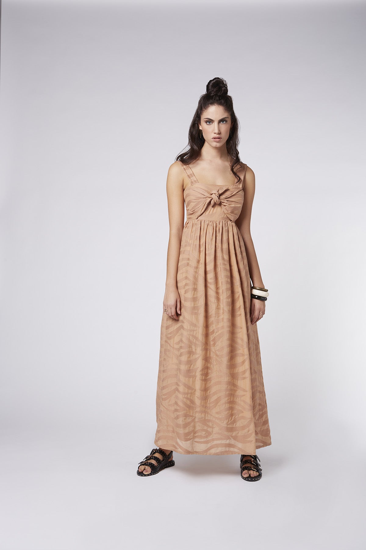 Abito lungo in tessuto ricamato con fiocco al seno