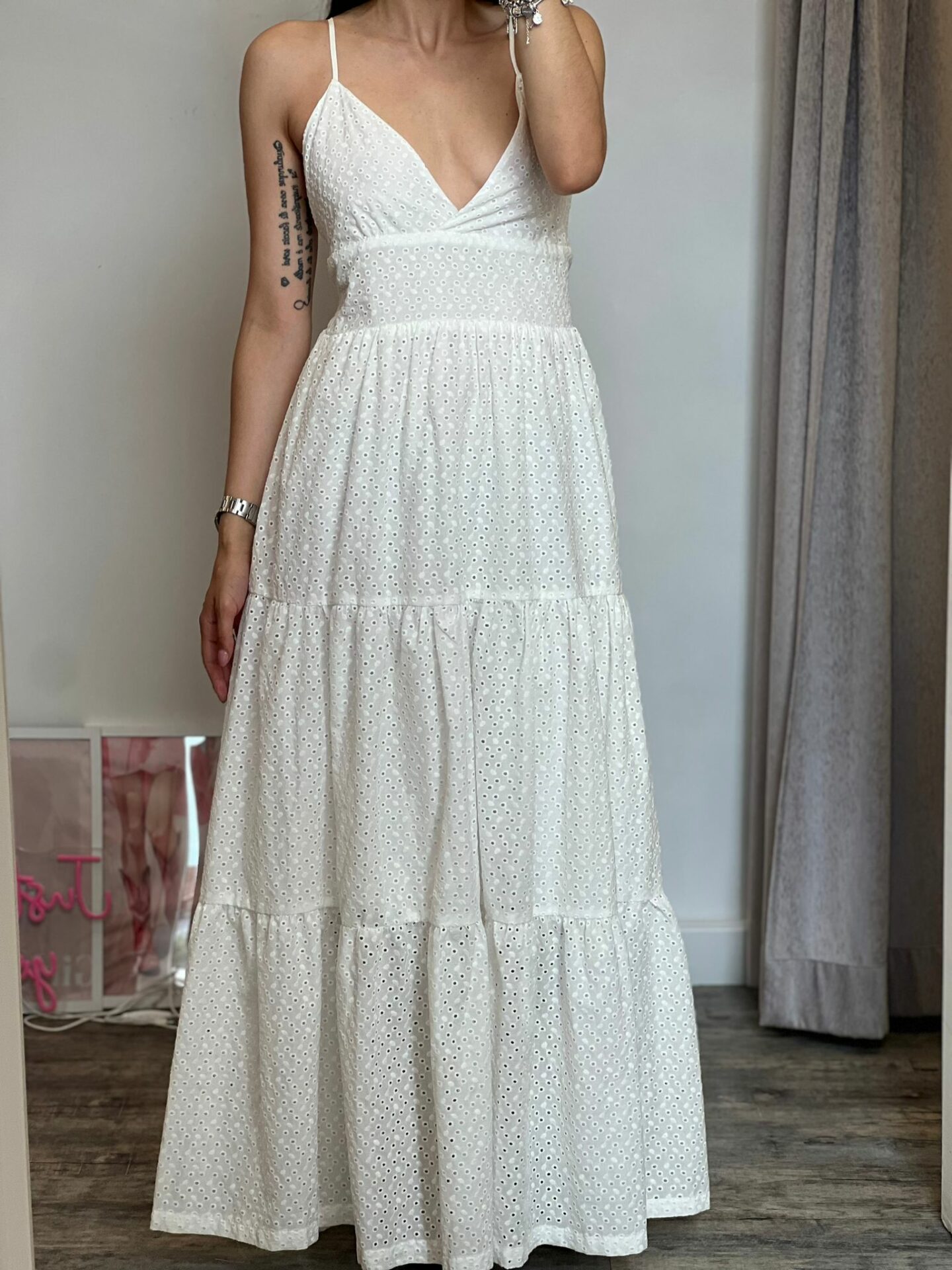 Maxi abito in sangallo con coppe triangolari e spallina sottile regolabile, schiena scoperta con banda elastica arricciata al centro, gonna strutturata su balze con fodera interna