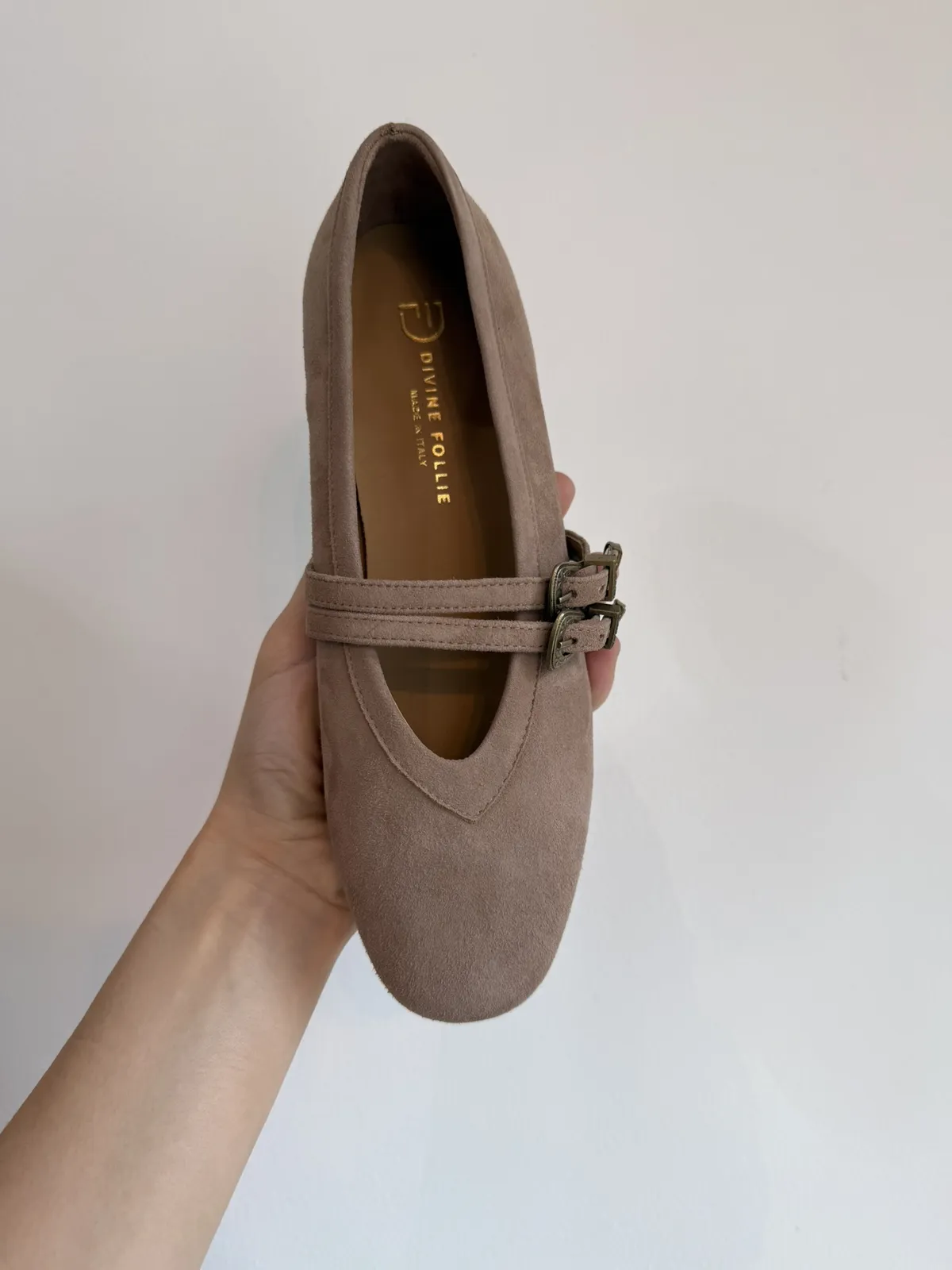 Ballerina punta squadrata con doppia fibbia regolabile sul collo del piede, modello rivestito in vera pelle scamosciata nude con fodera e suola sintetici