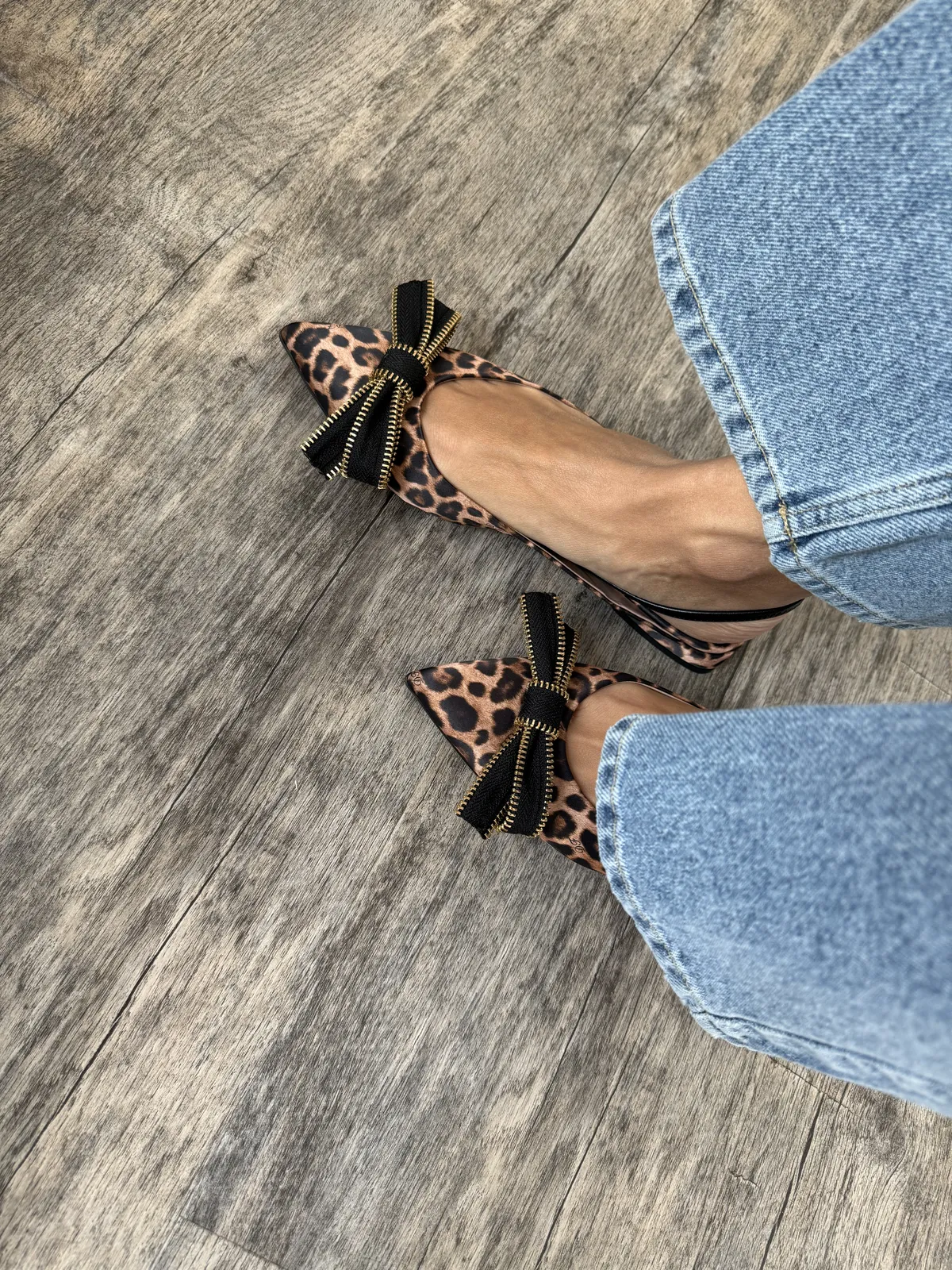 Ballerina in ecopelle ricoperta effetto raso macu logato con rialzo di 1 cm, elastico su caviglia e applicazione maxi fiocco con rifiniture effetto zip, suola in vera pelle