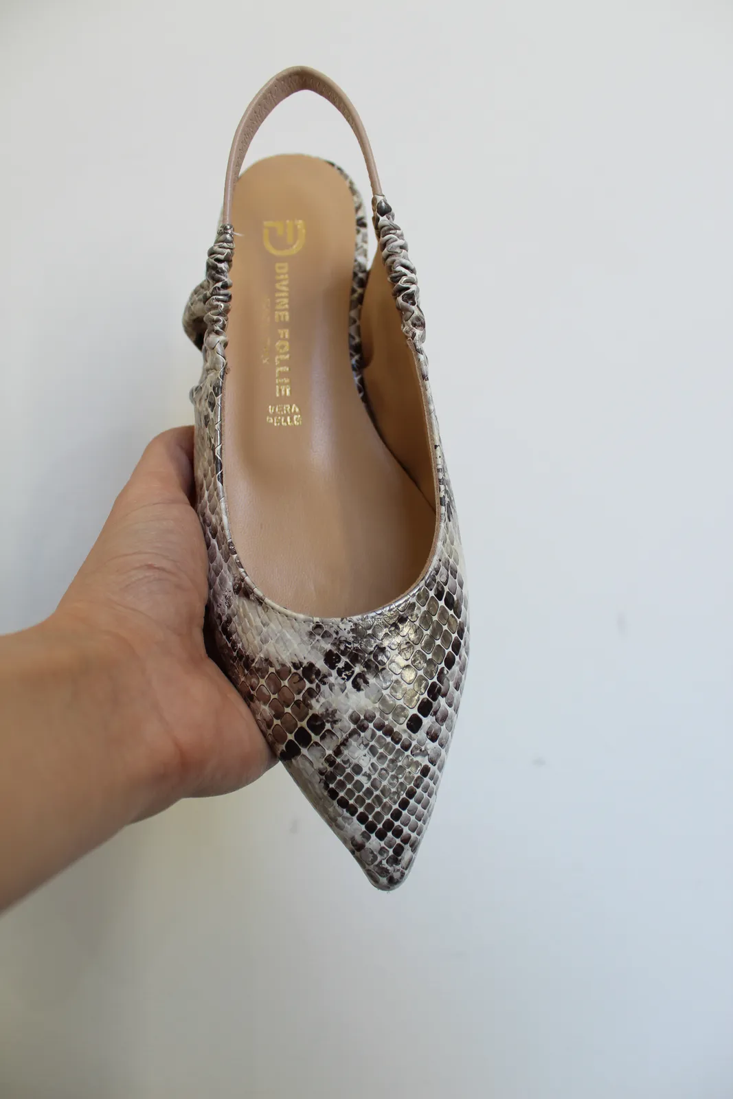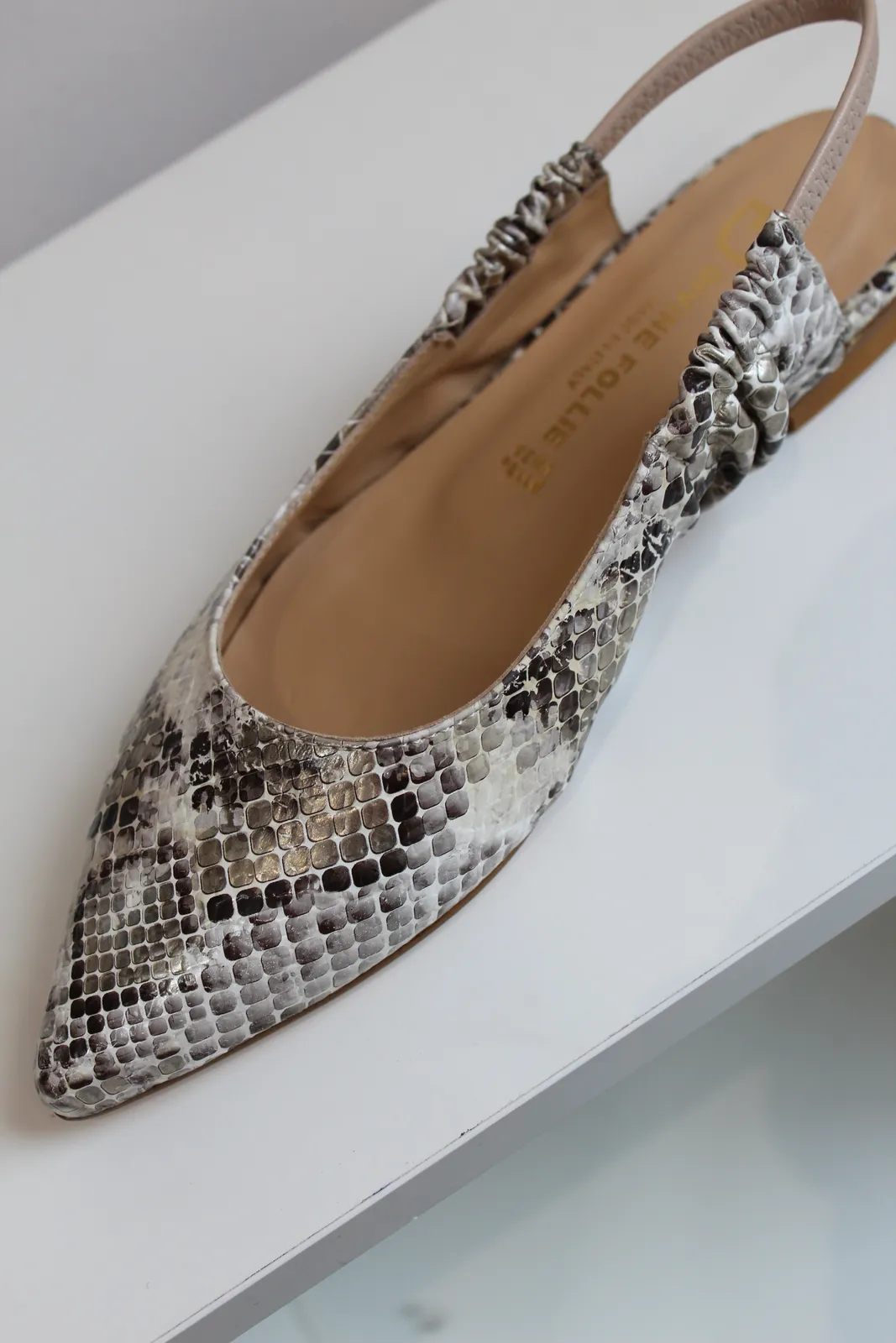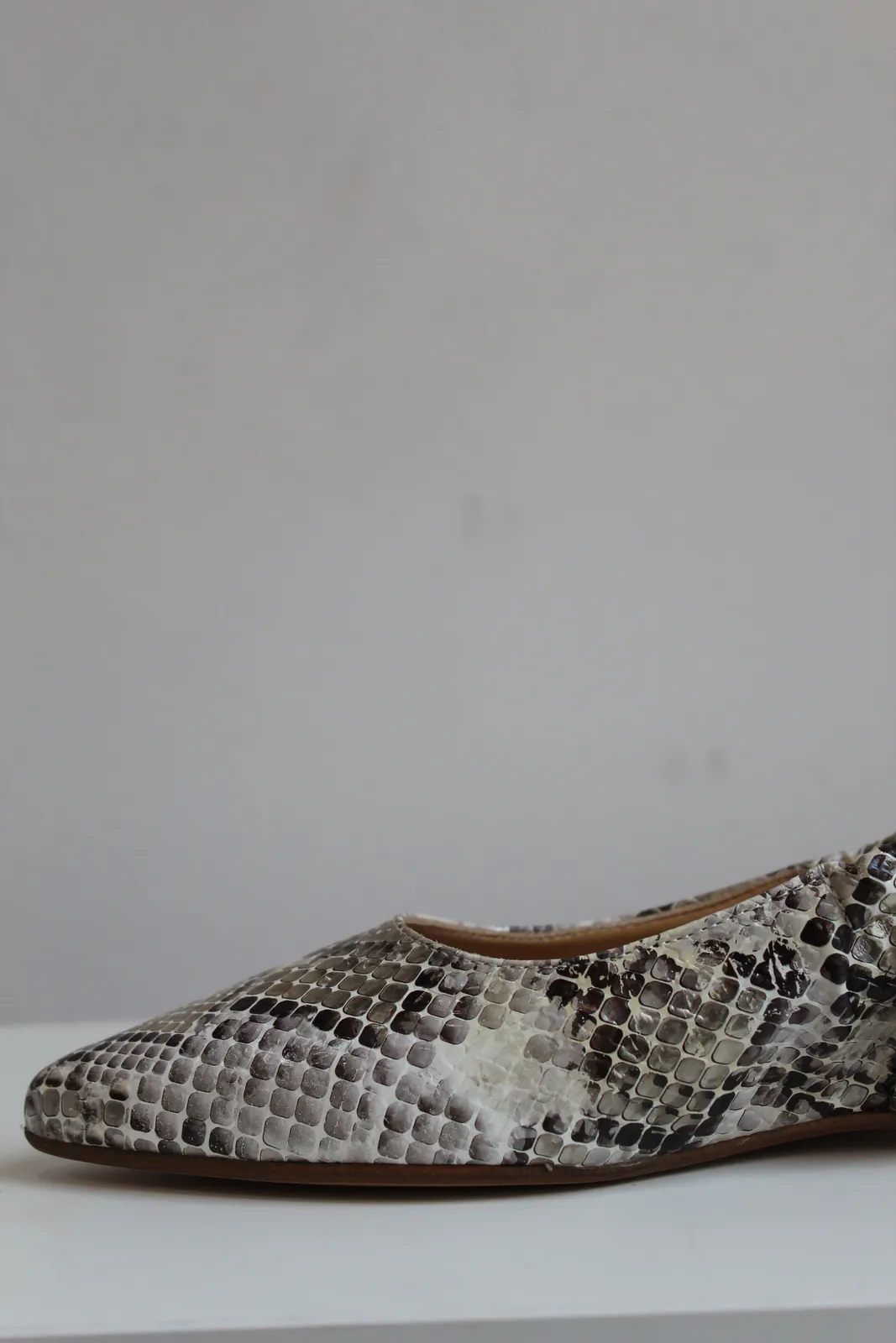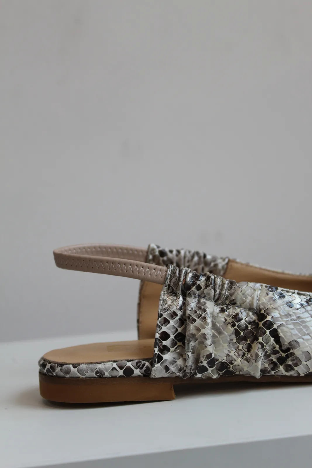 Ballerina interamente in vera pelle, suola in cuoio rigenerato e lavorato artigianalmente, pitonata a punta con fibbia elastica sul retro e dettagli arricciati laterali