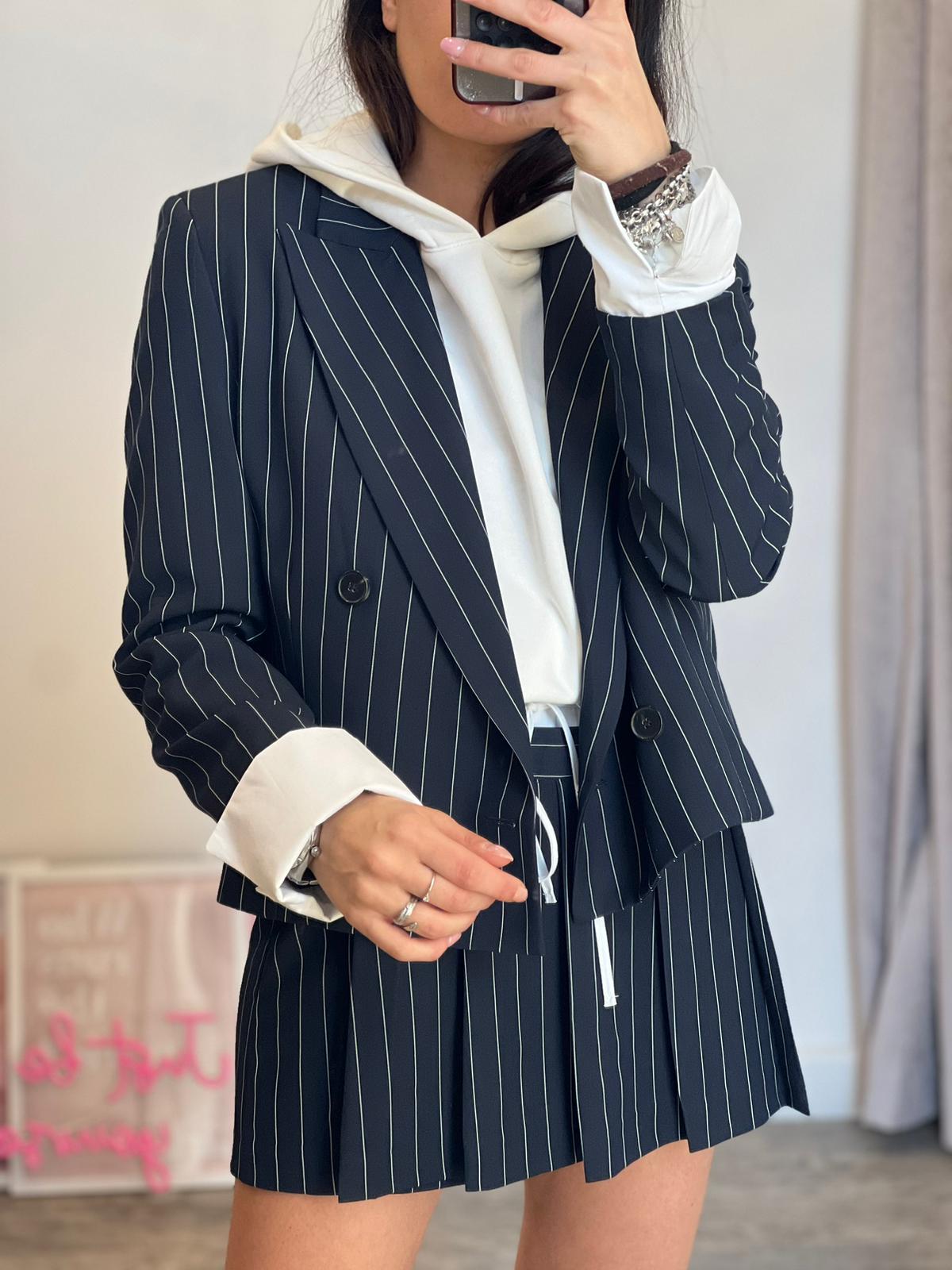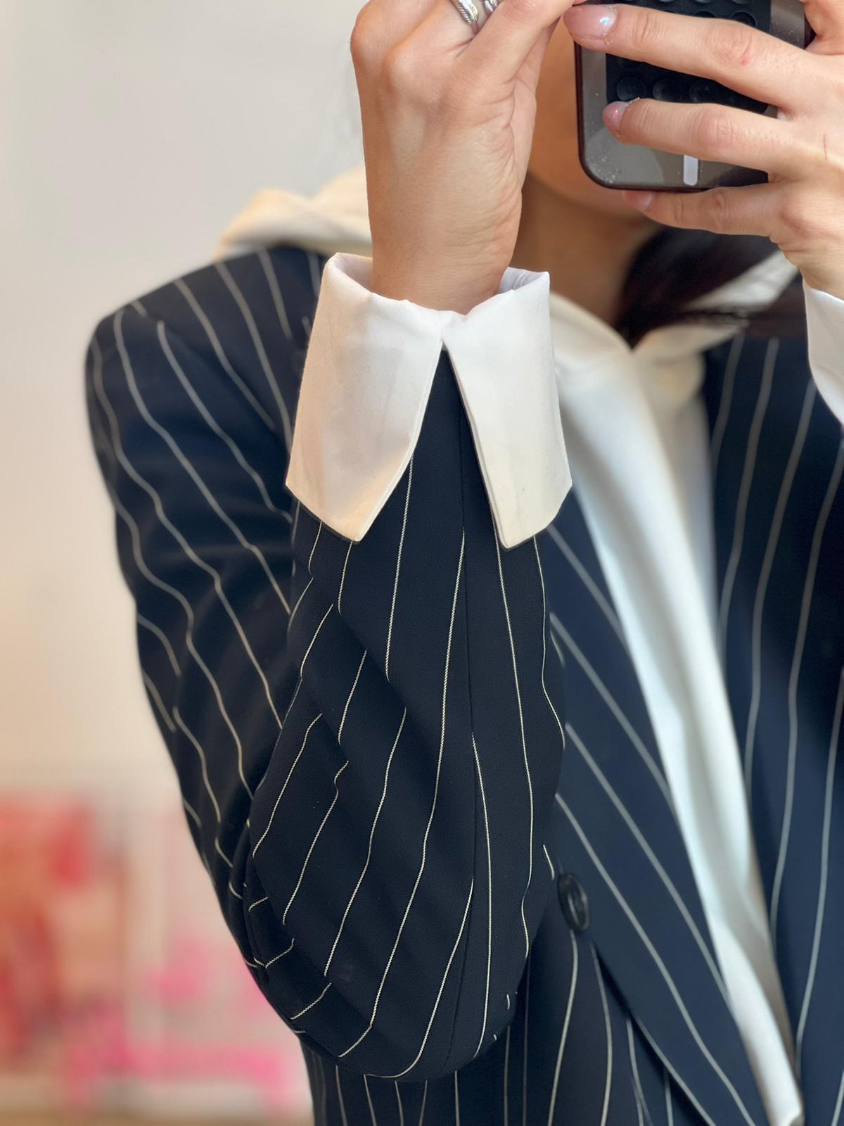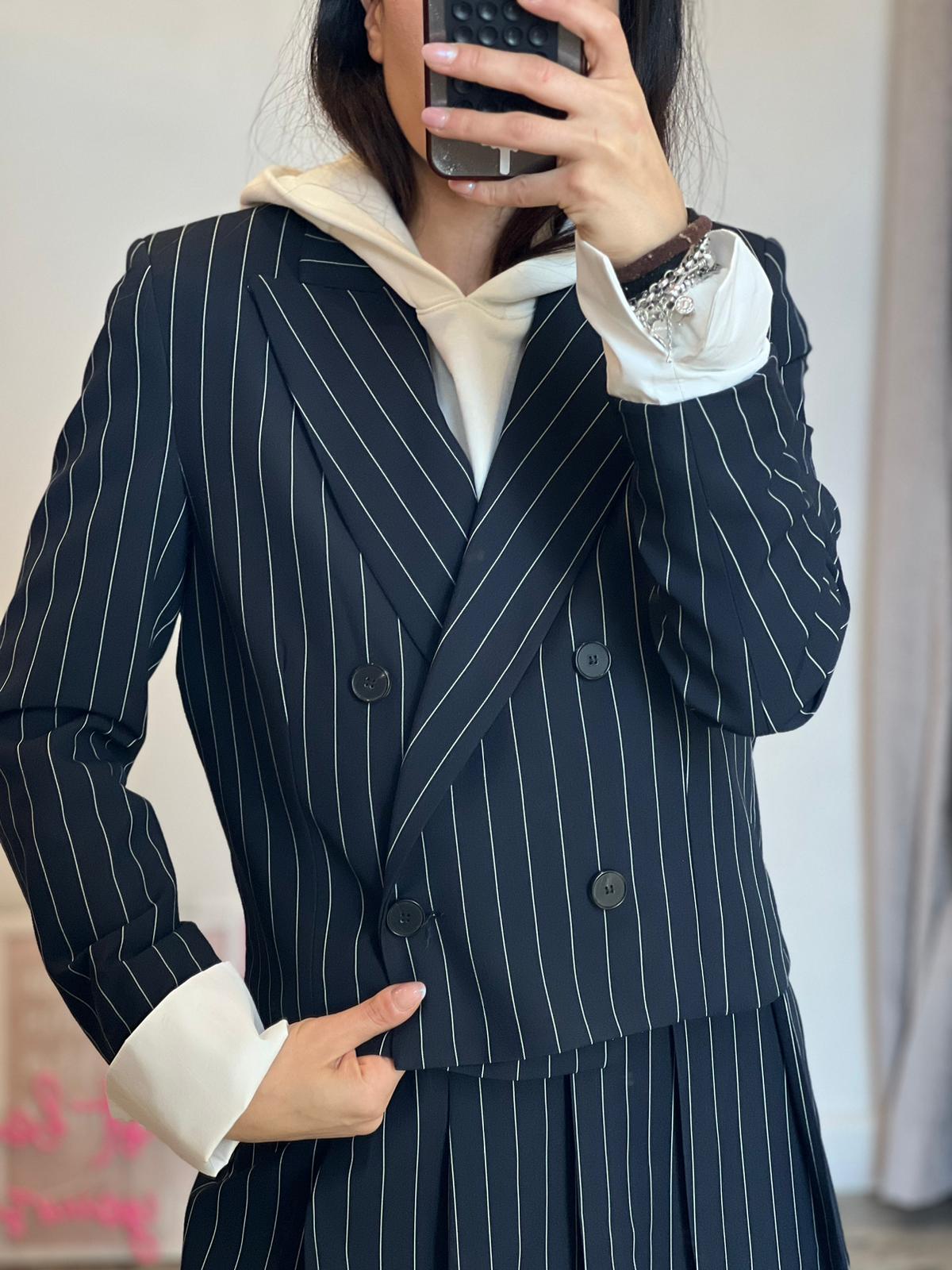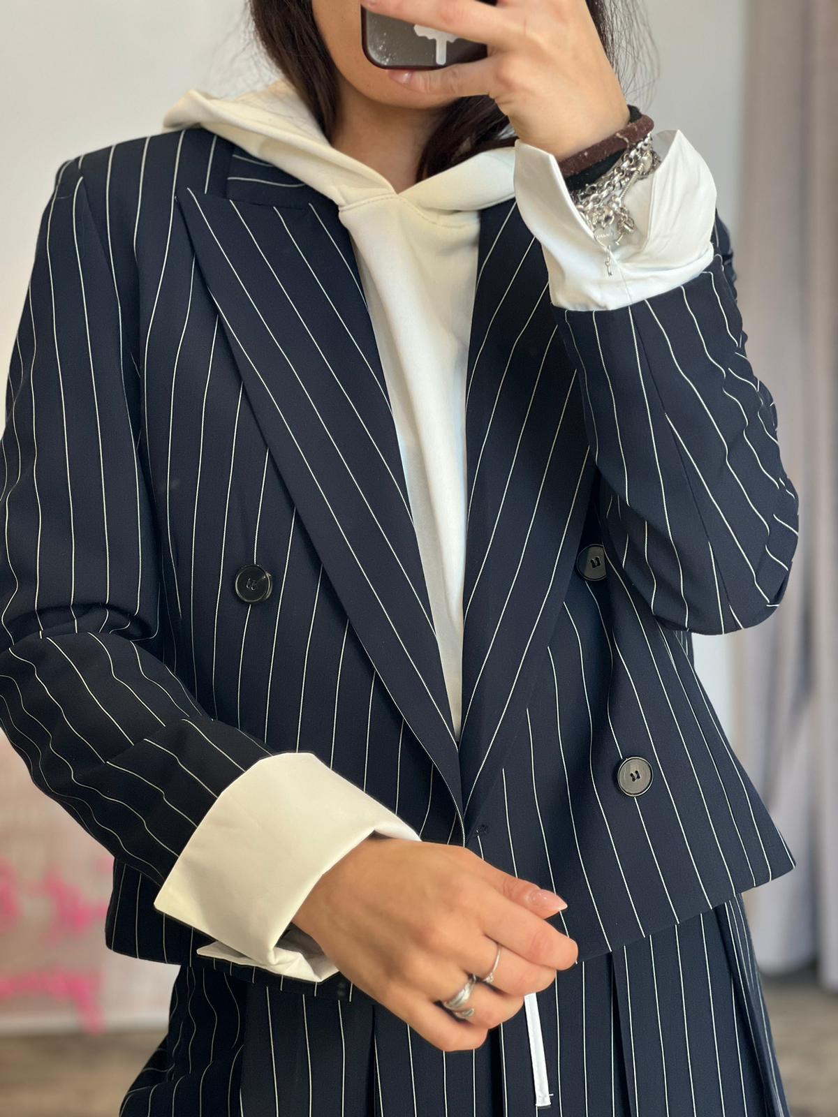 Blazer cropped gessato maniche lunghe con collo a revers. Chiusura frontale doppipetto. Dettaglio Manica effetto camicia con polsini removibili.