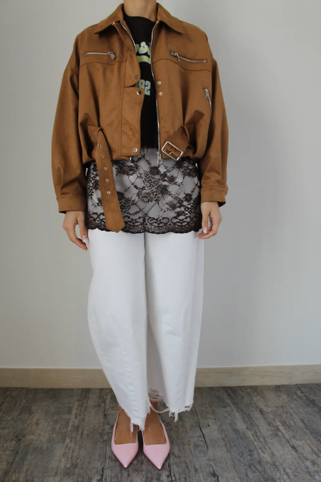 Bomber in alcantara taglio biker con arriccio sul fondo, chiusura con zip e doppia patta frontale, fibbia in tessuto sul fondo