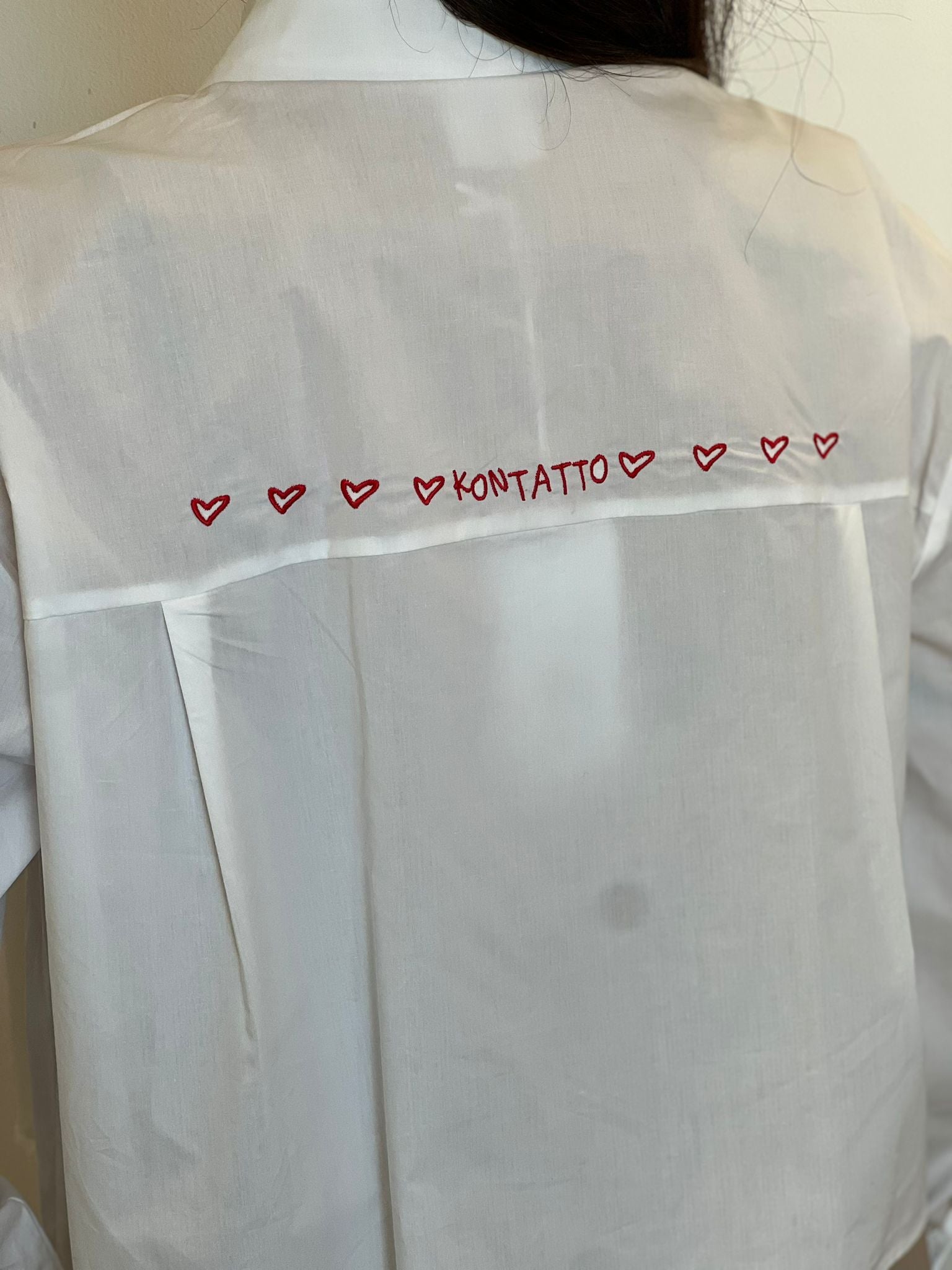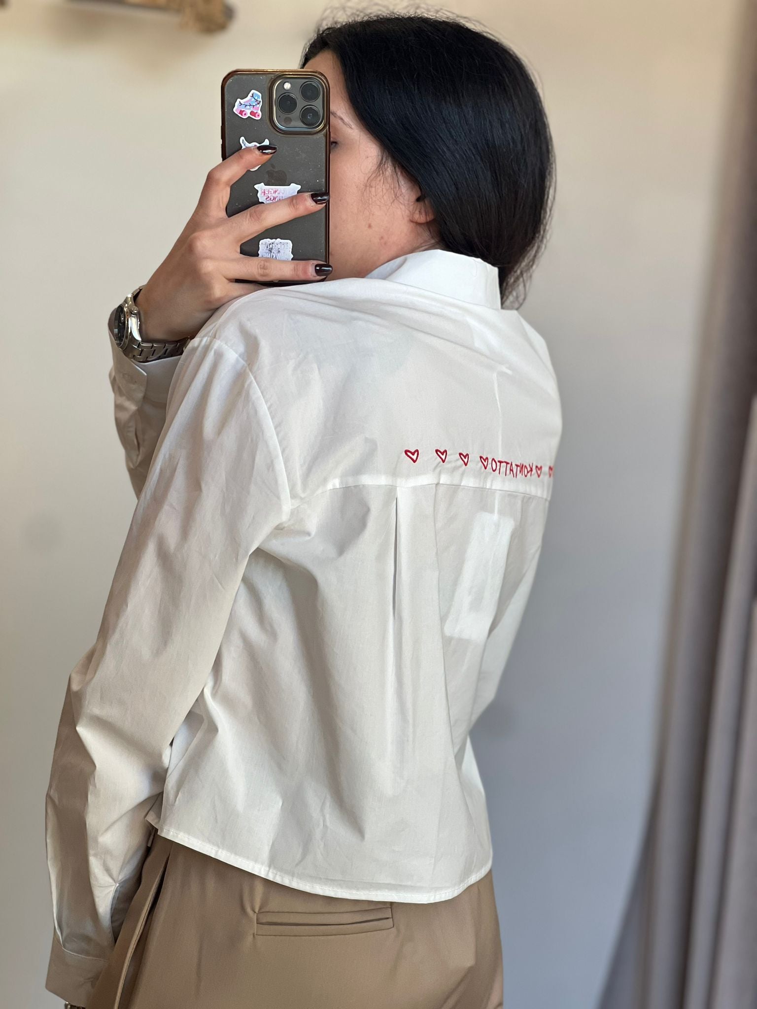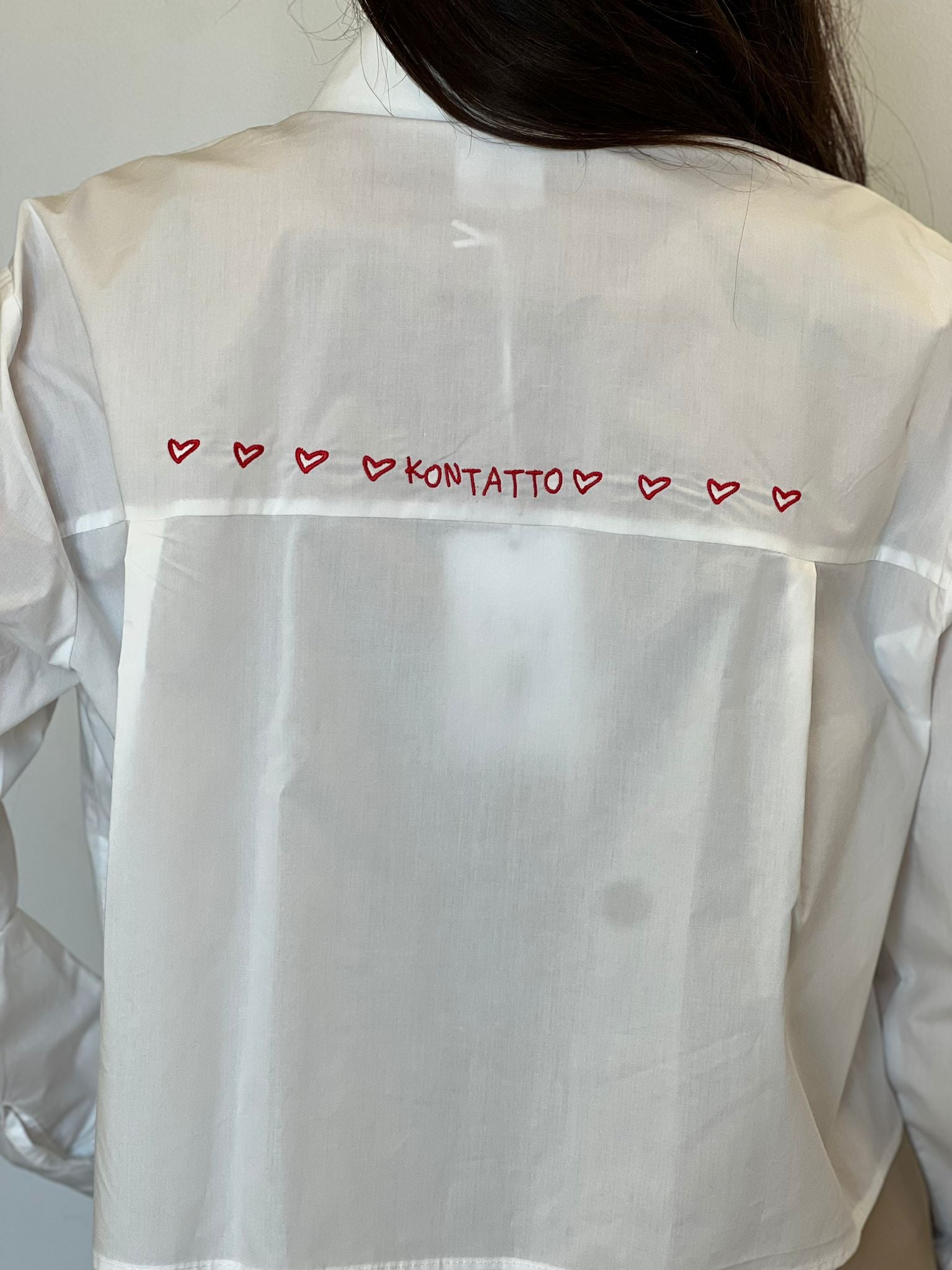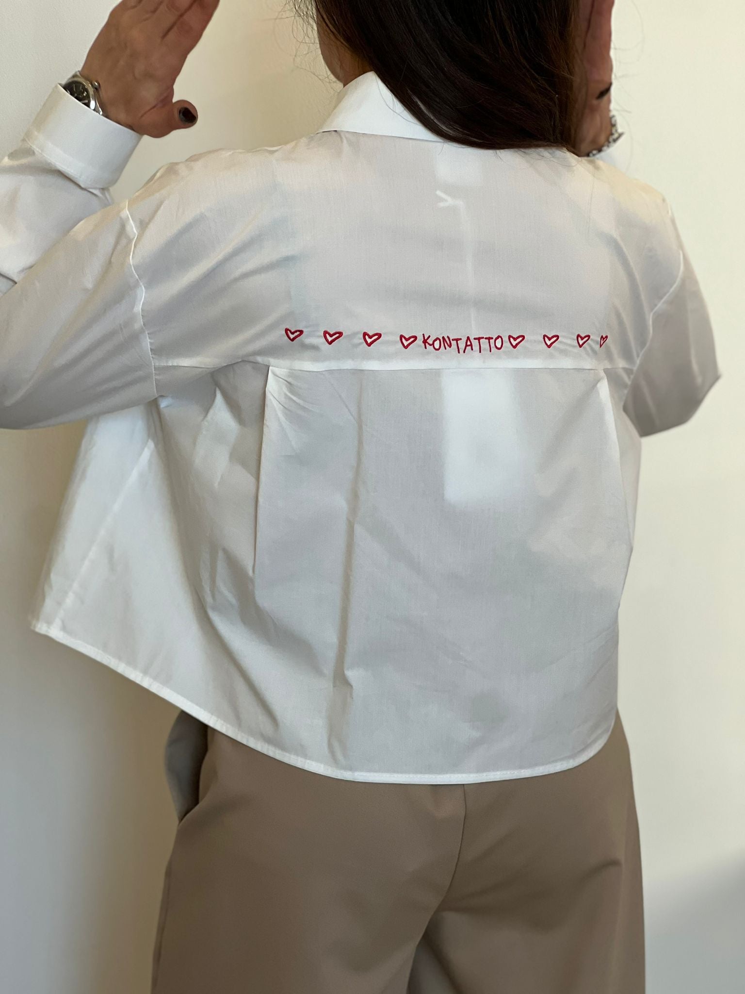 Camicia cropped taglio scatolina con ricamo a contrasto sulla schiena