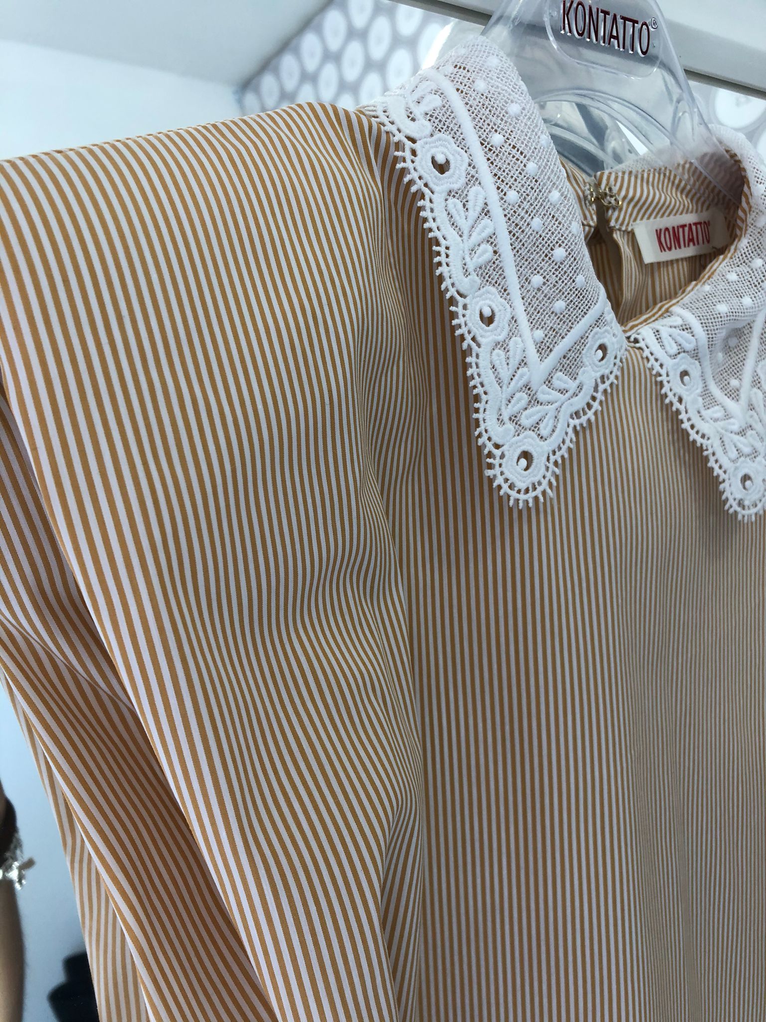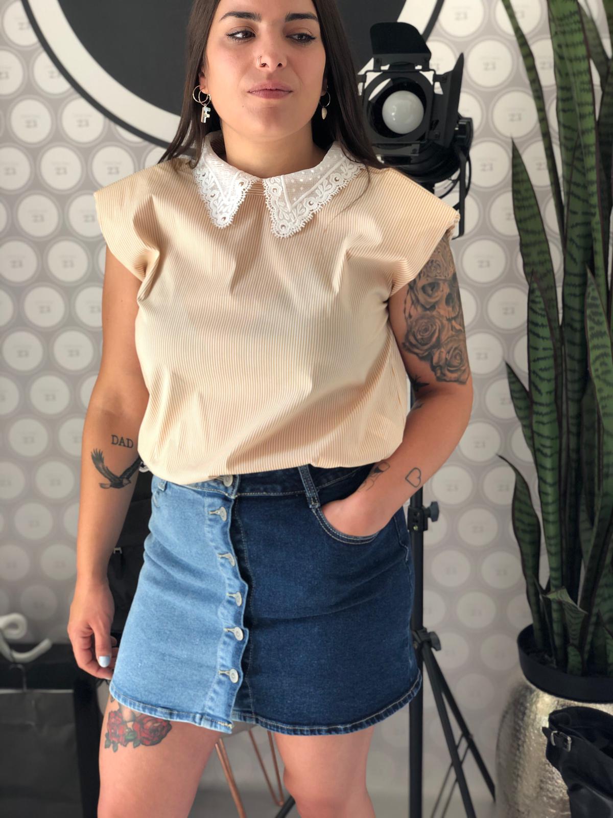 Camicetta smanicata in stampa microriga senape/panna, applicazione colletto ricamato fronte retro, spalline imbottite anni 80, taglio dritto, lunghezza regolare