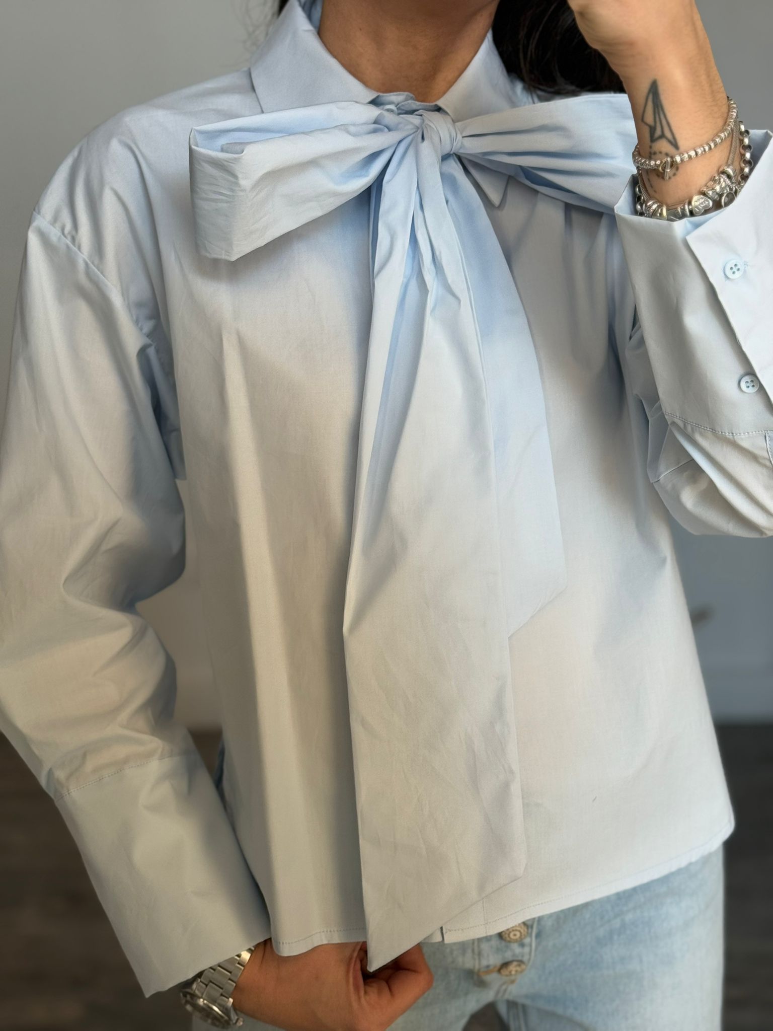 Camicia regular fit, lunghezza media con fusciacca da legare eventualmente al collo come fiocco, taglio asimmetrico laterale