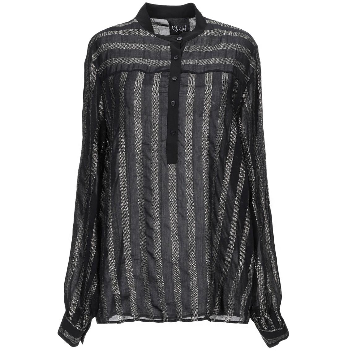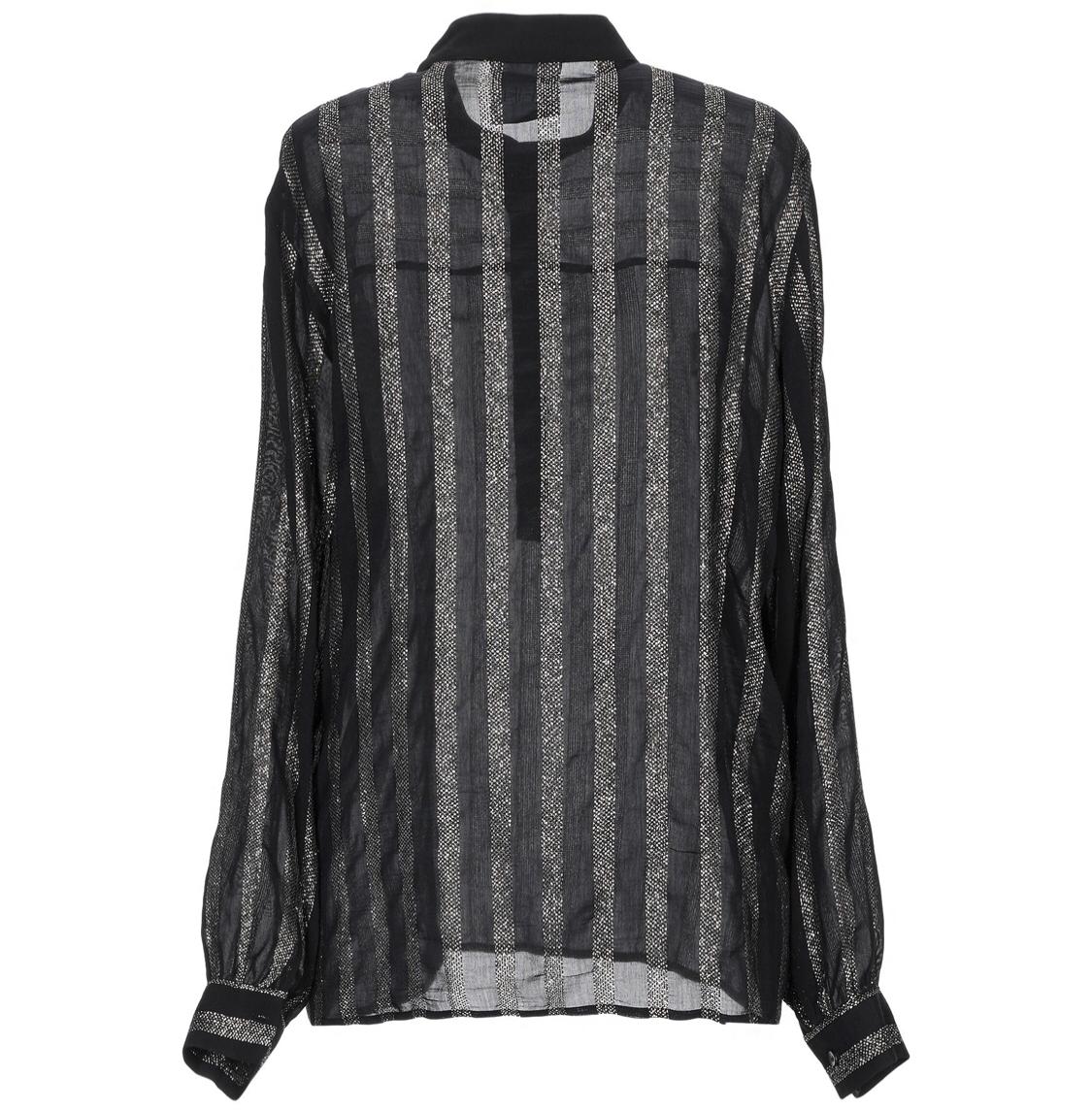 Camicia righe lurex effetto dorato, scolla alla coreana, manica lunga, bottoncini a metà, vestibilità morbida, lunghezza media