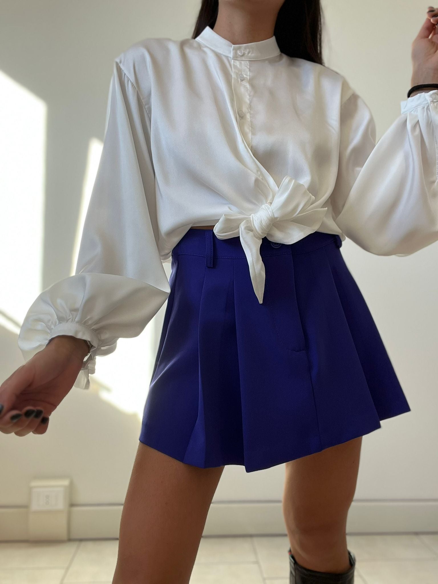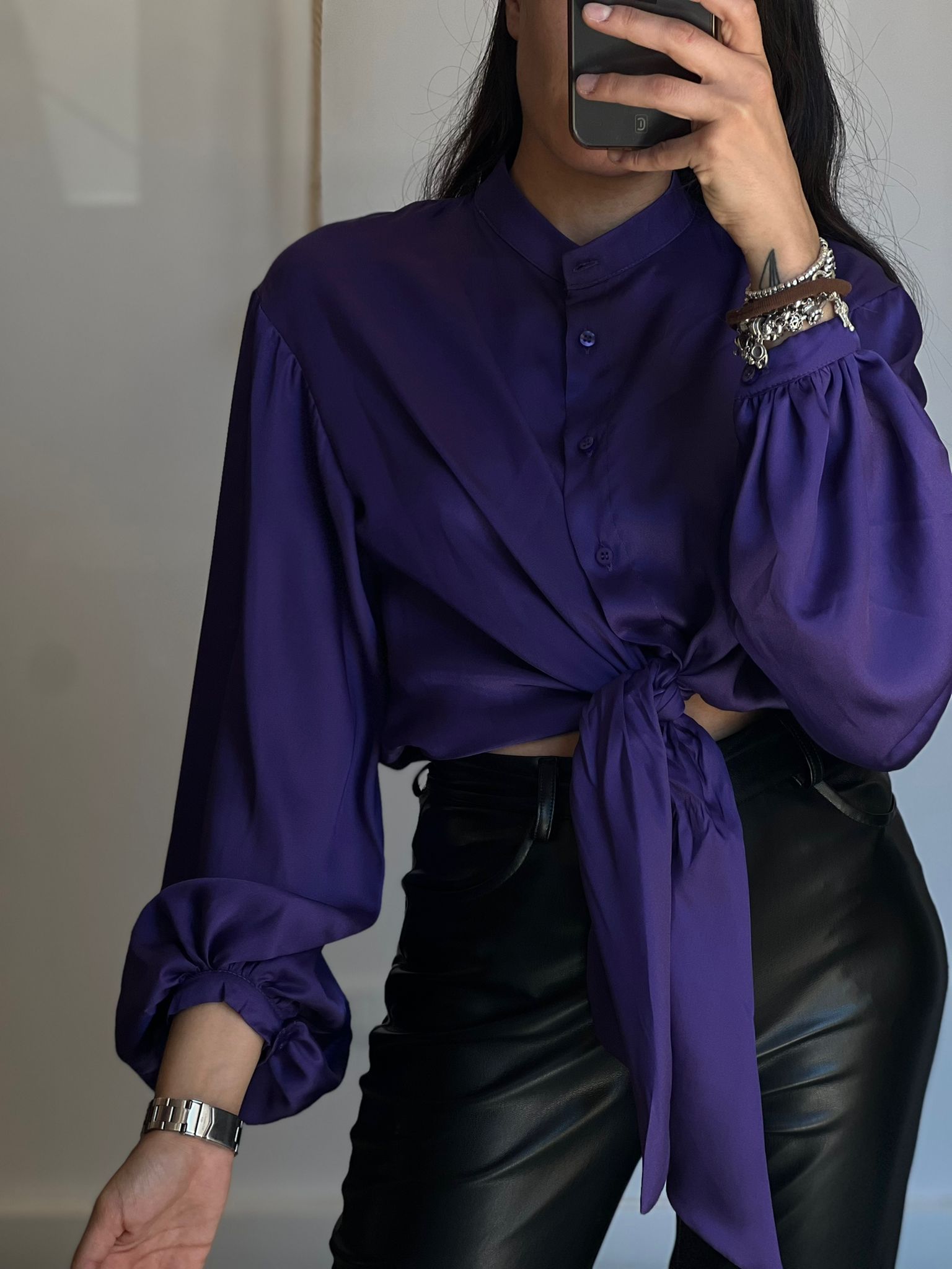 Camicia con colletto alla coreana, nodo centrale, simil seta, manica bombata, vestibilità morbida