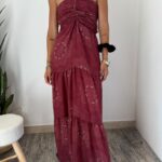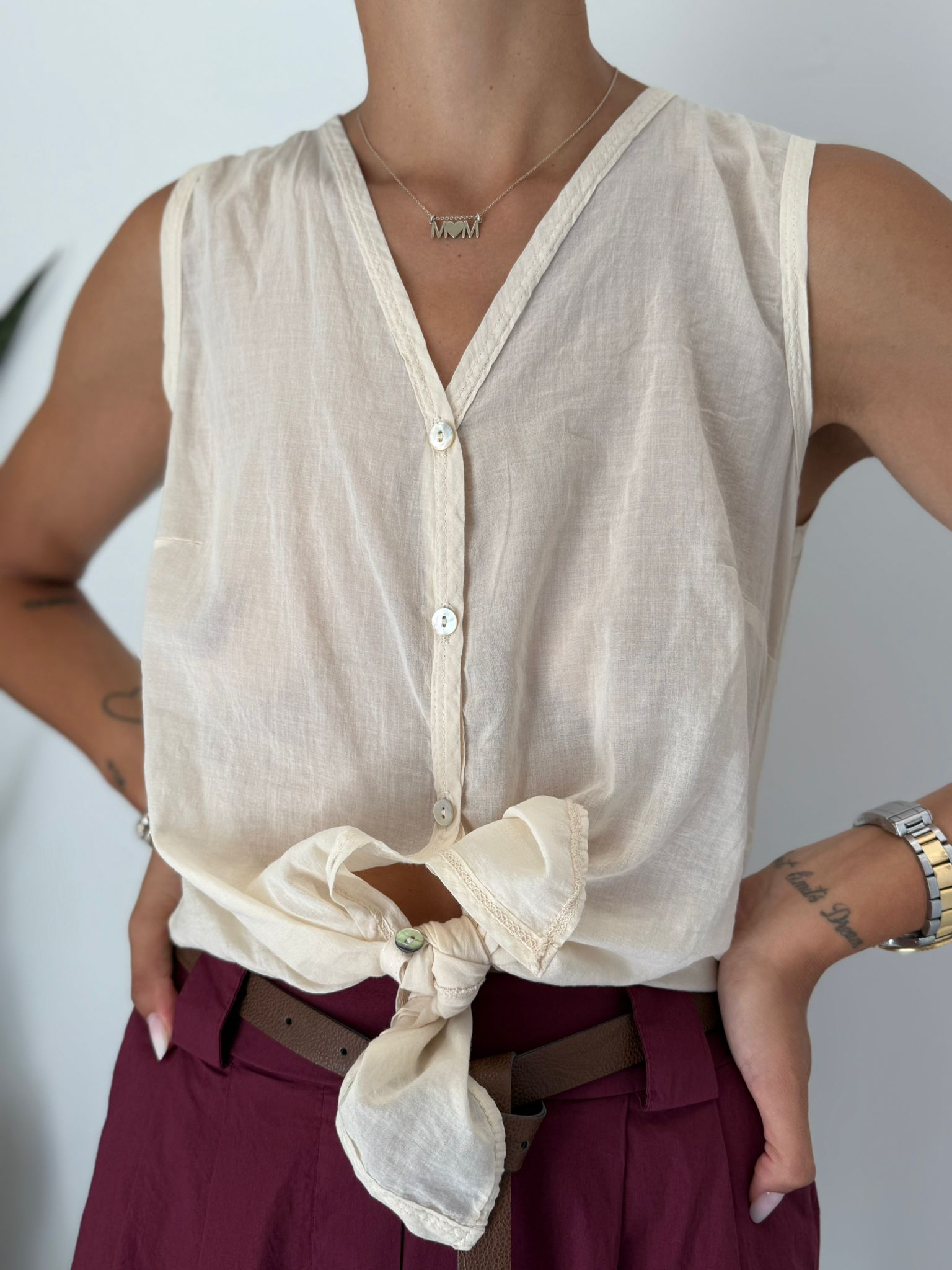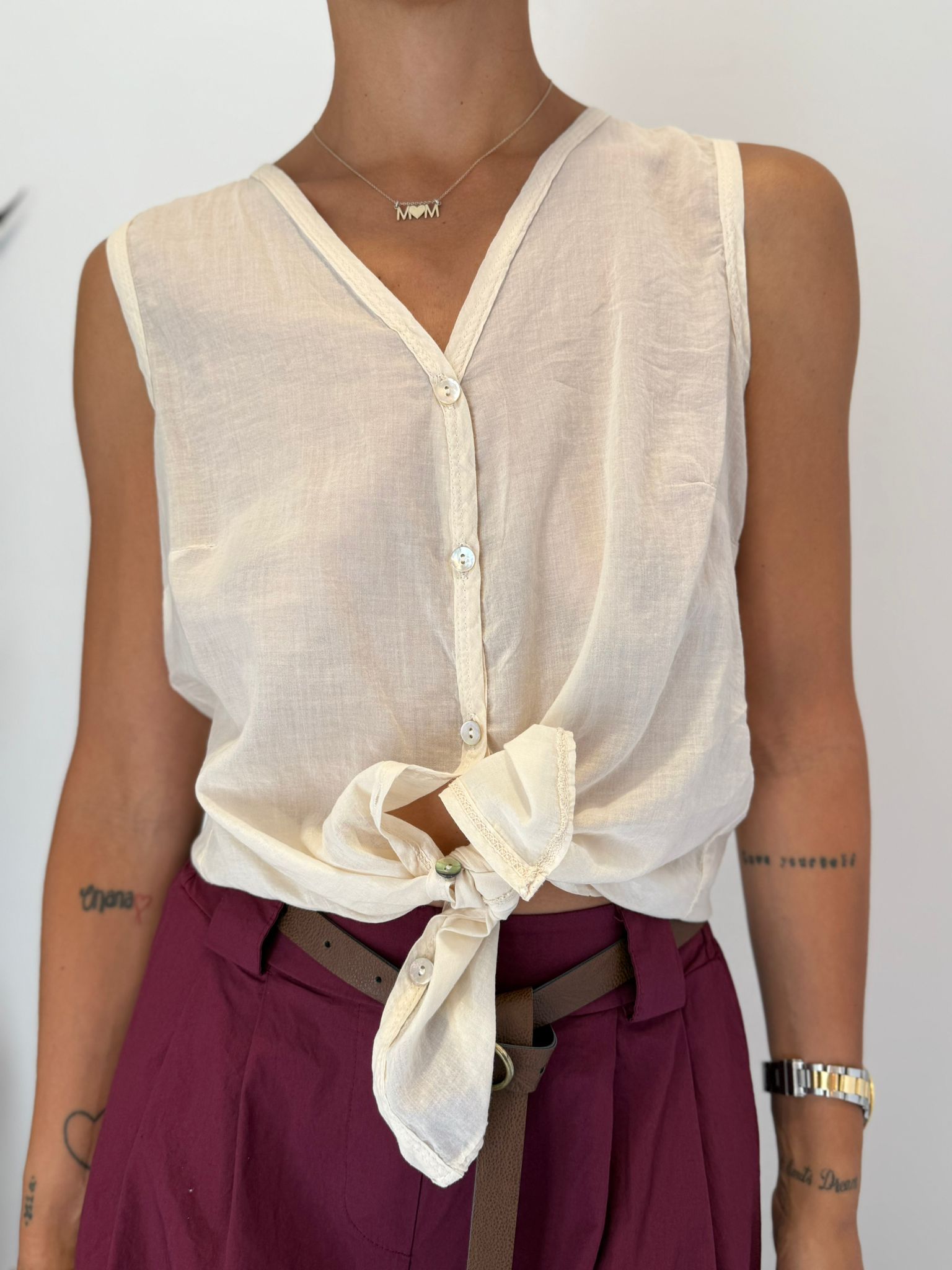 Blusa smanicata da portare con il nodino sul davanti. taglio regular in mussola con scollo a V e chiusura bottoncini