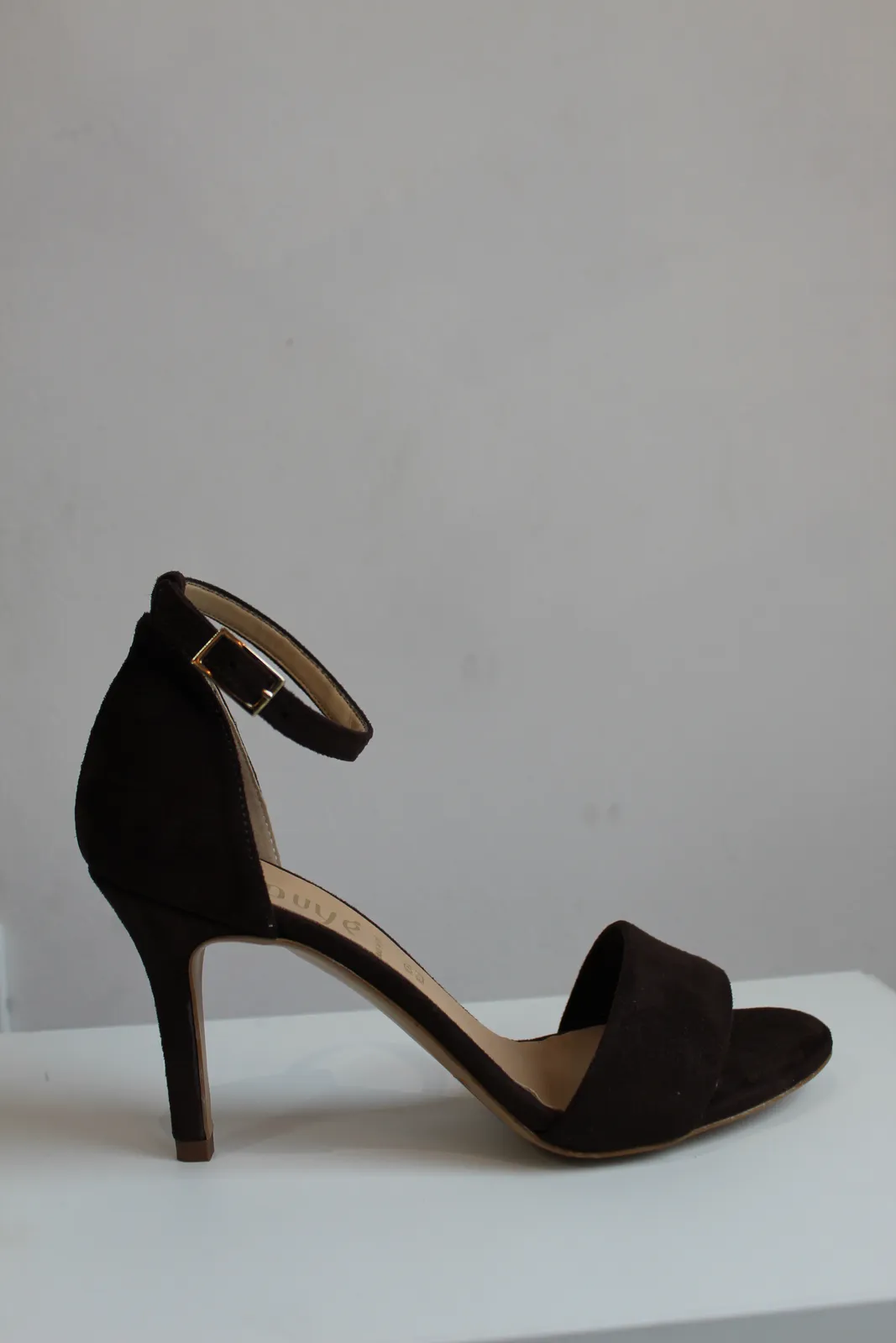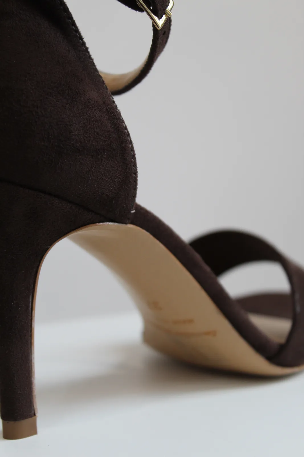 Decolletè in suede moro open toe con tacco 8 cm e cinturino alla caviglia regolabile, modello in ecopelle con suola in vera pelle