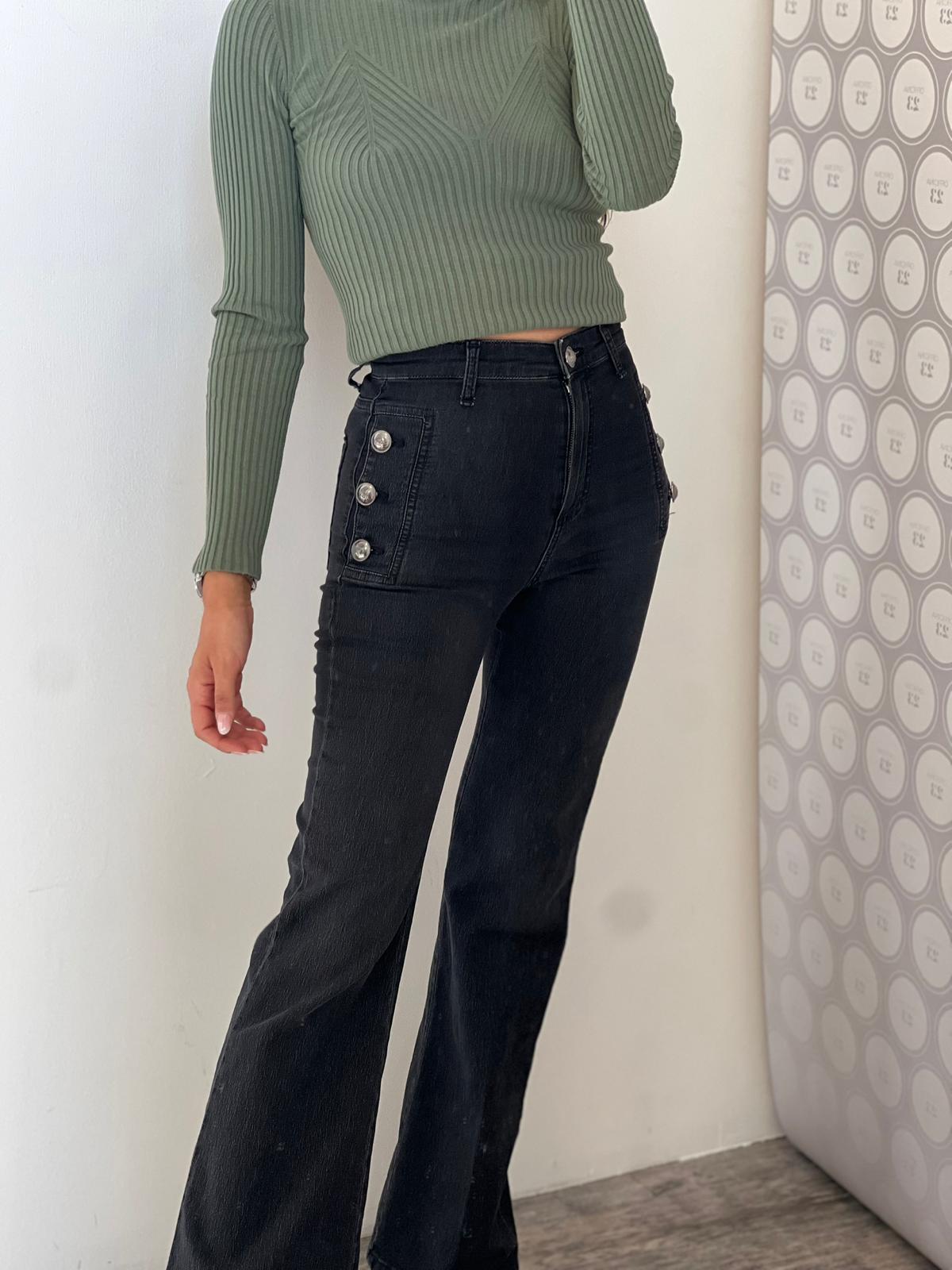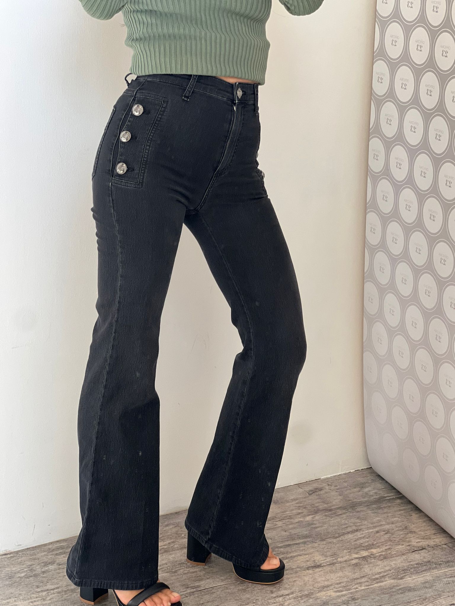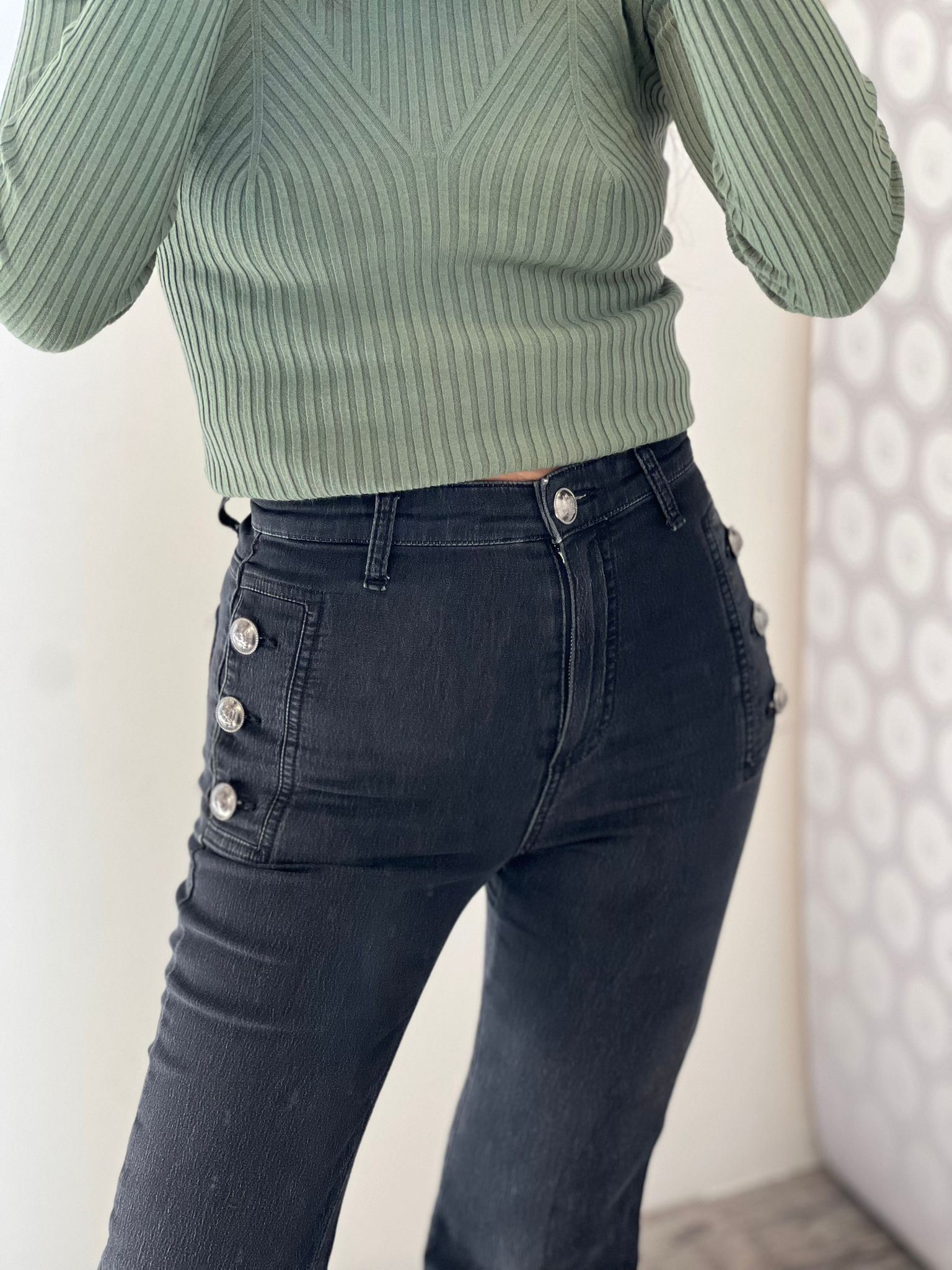Diana jeans flared fit, vita alta con bottoni decorativi laterali, gamba aderente e zampa finale