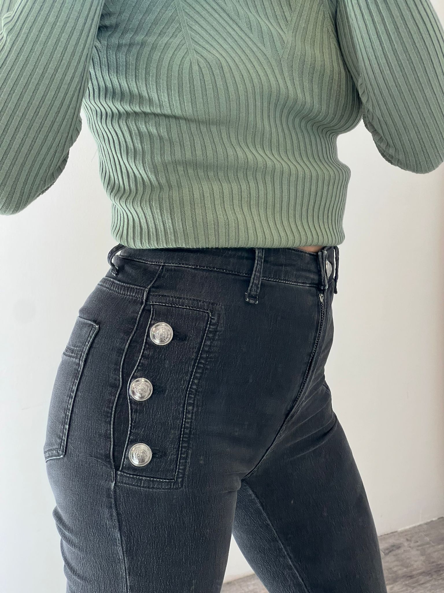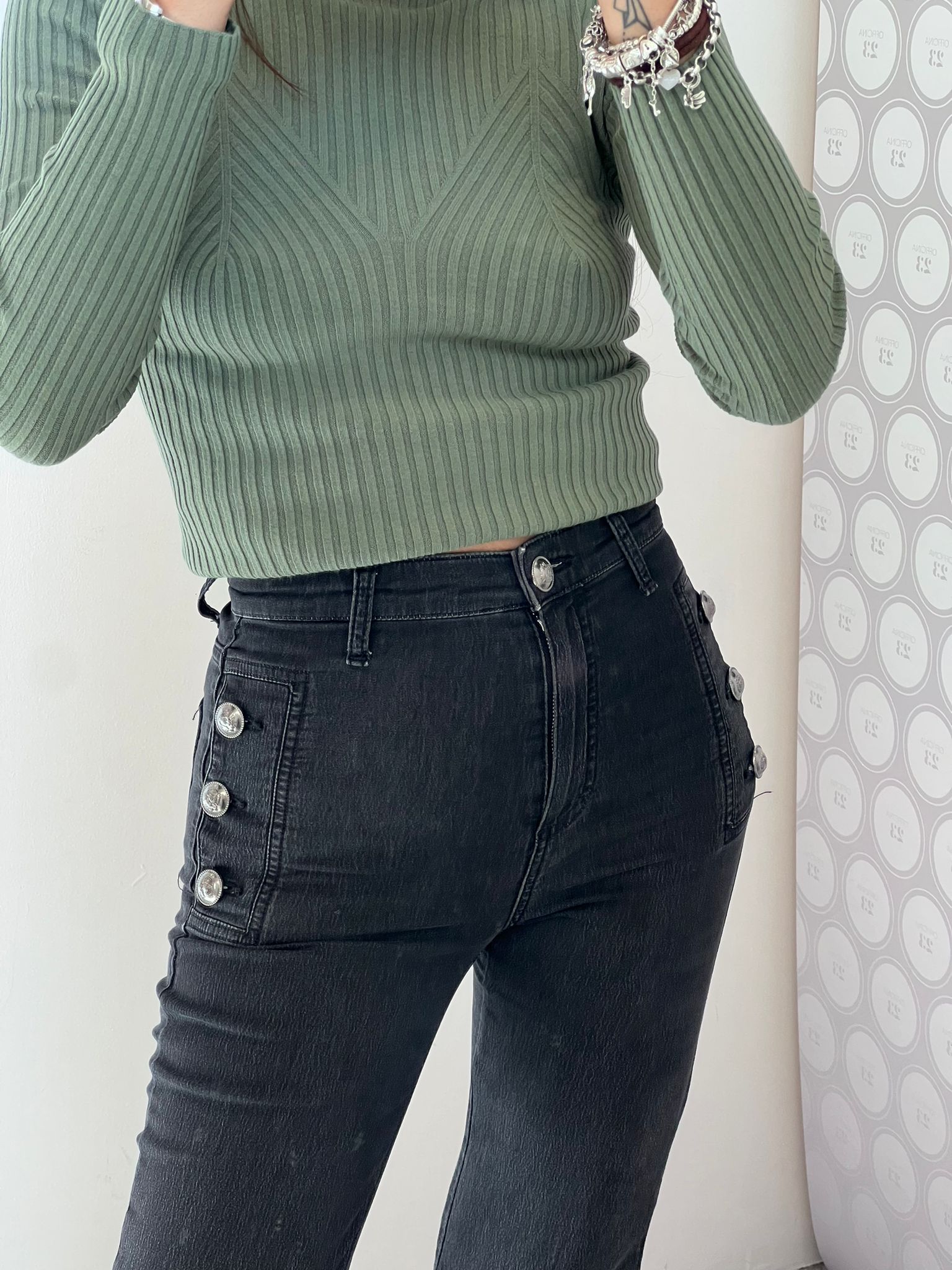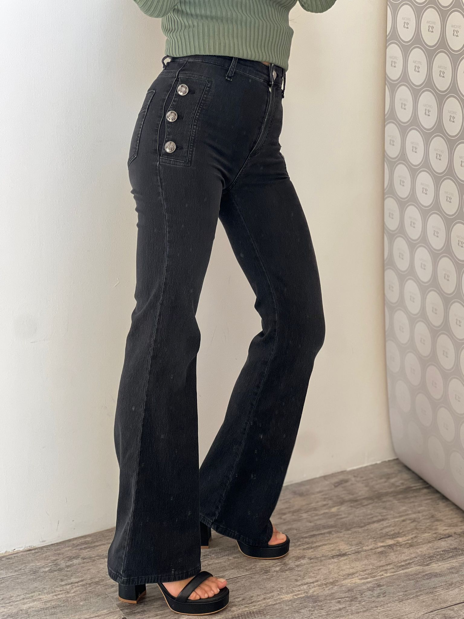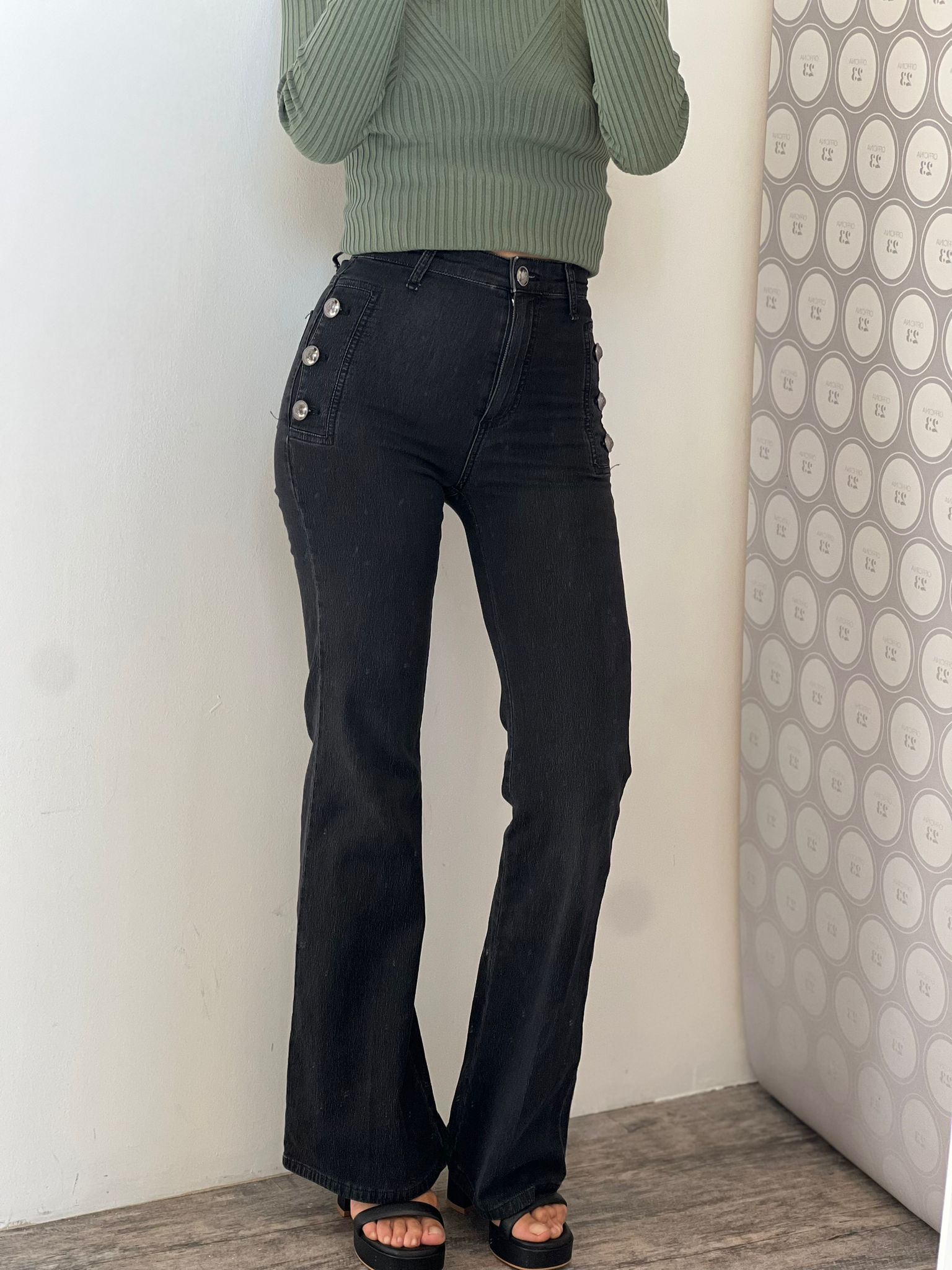 Diana jeans flared fit, vita alta con bottoni decorativi laterali, gamba aderente e zampa finale