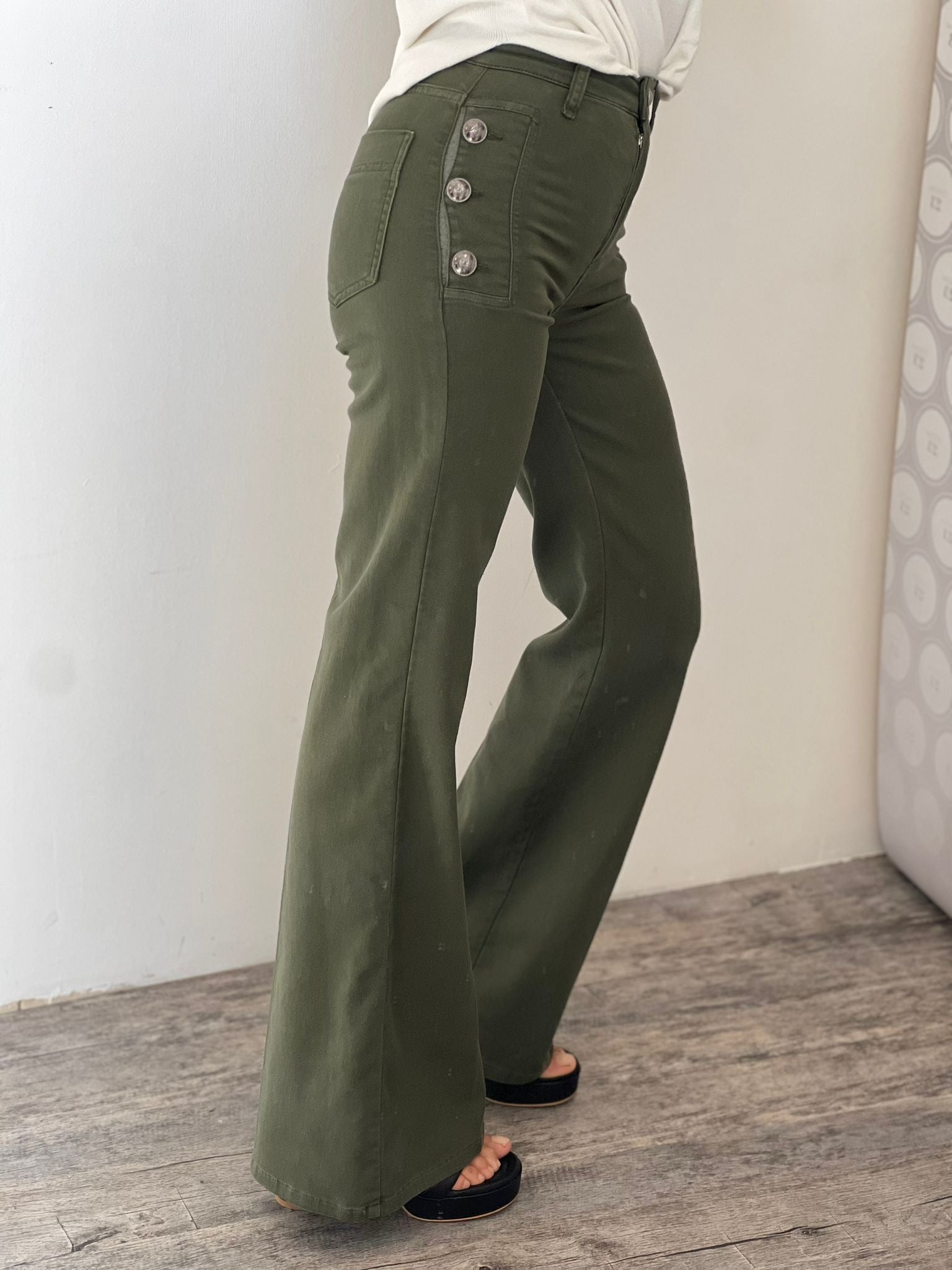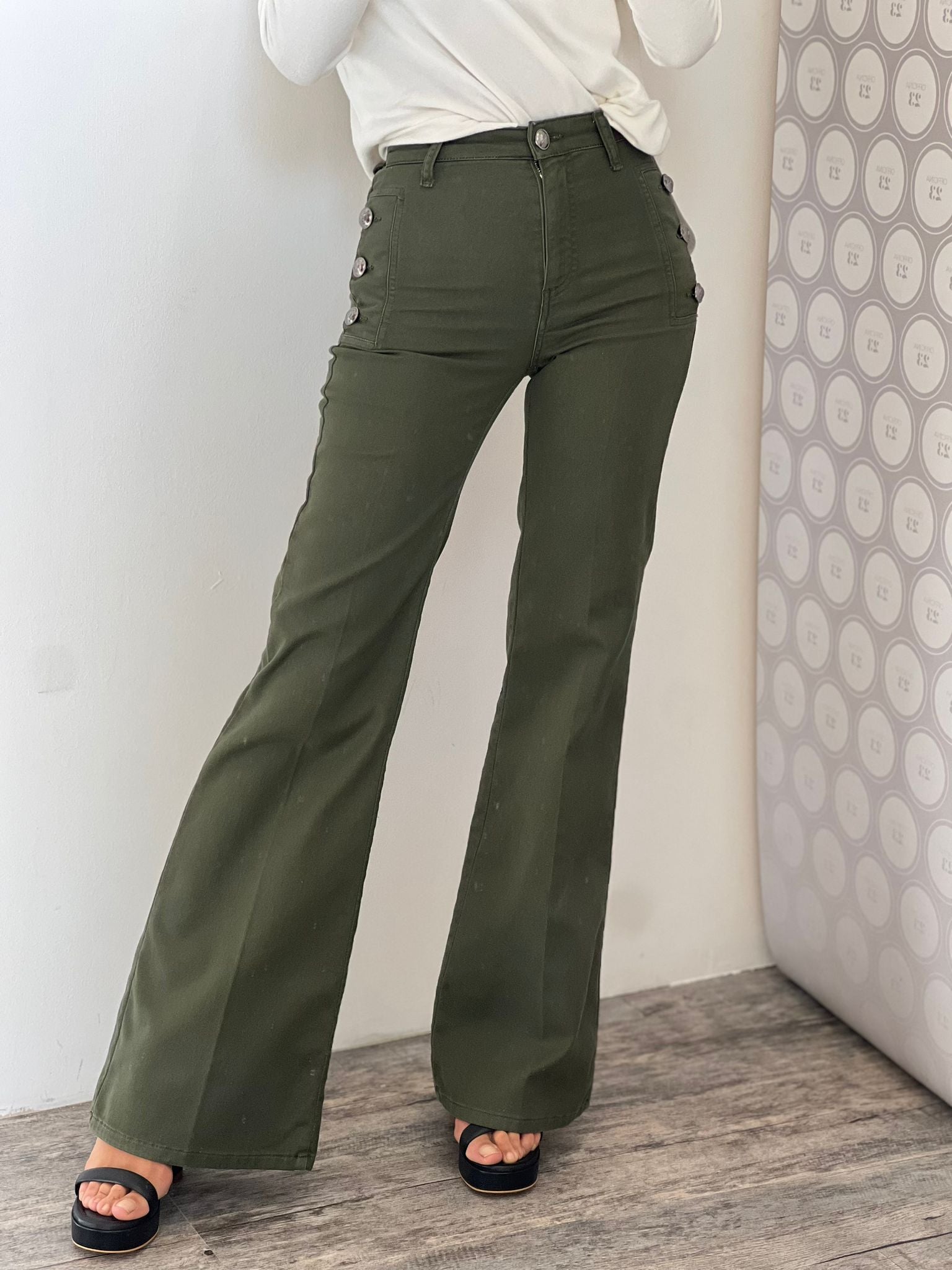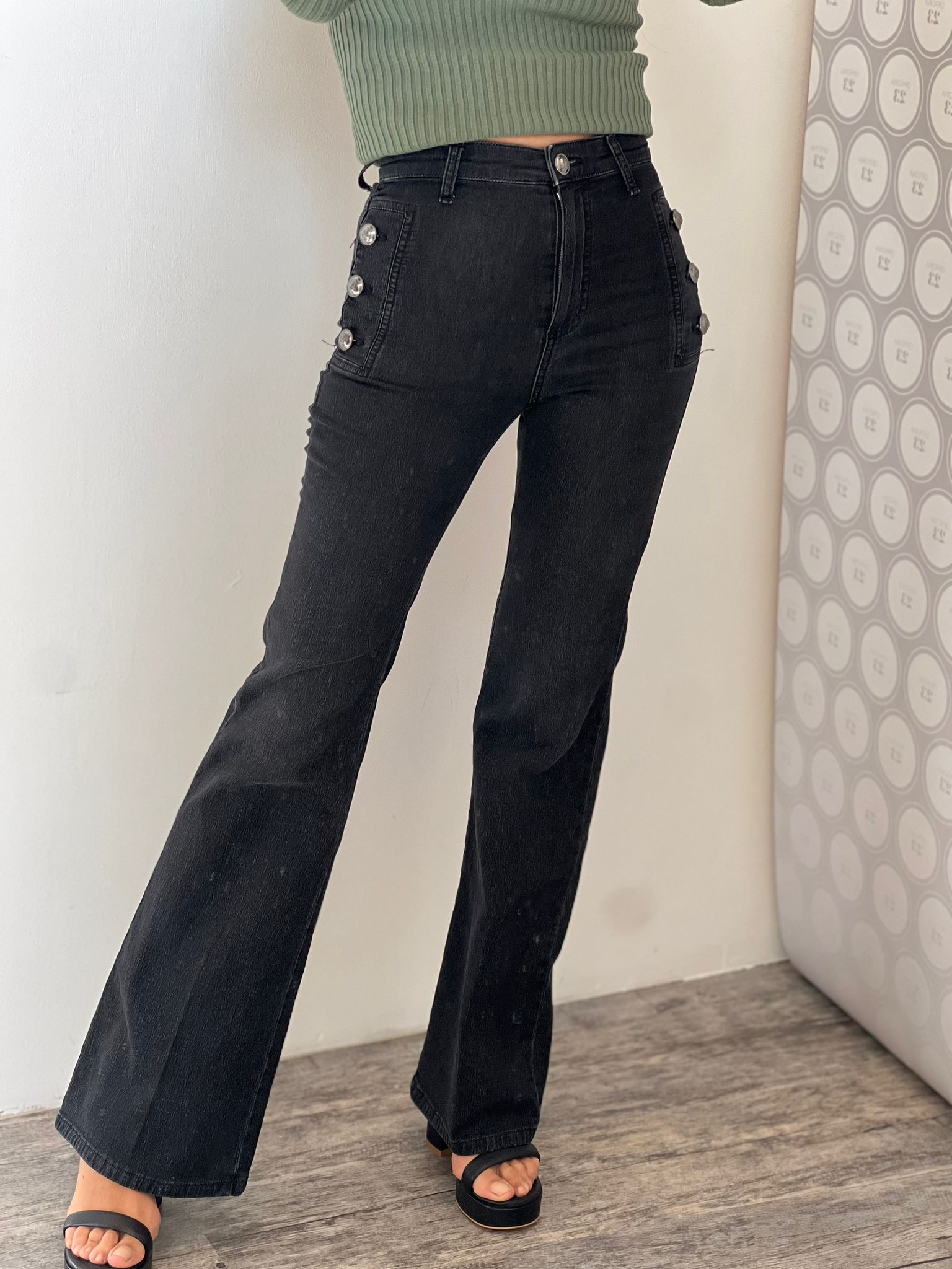 Diana jeans flared fit, vita alta con bottoni decorativi laterali, gamba aderente e zampa finale