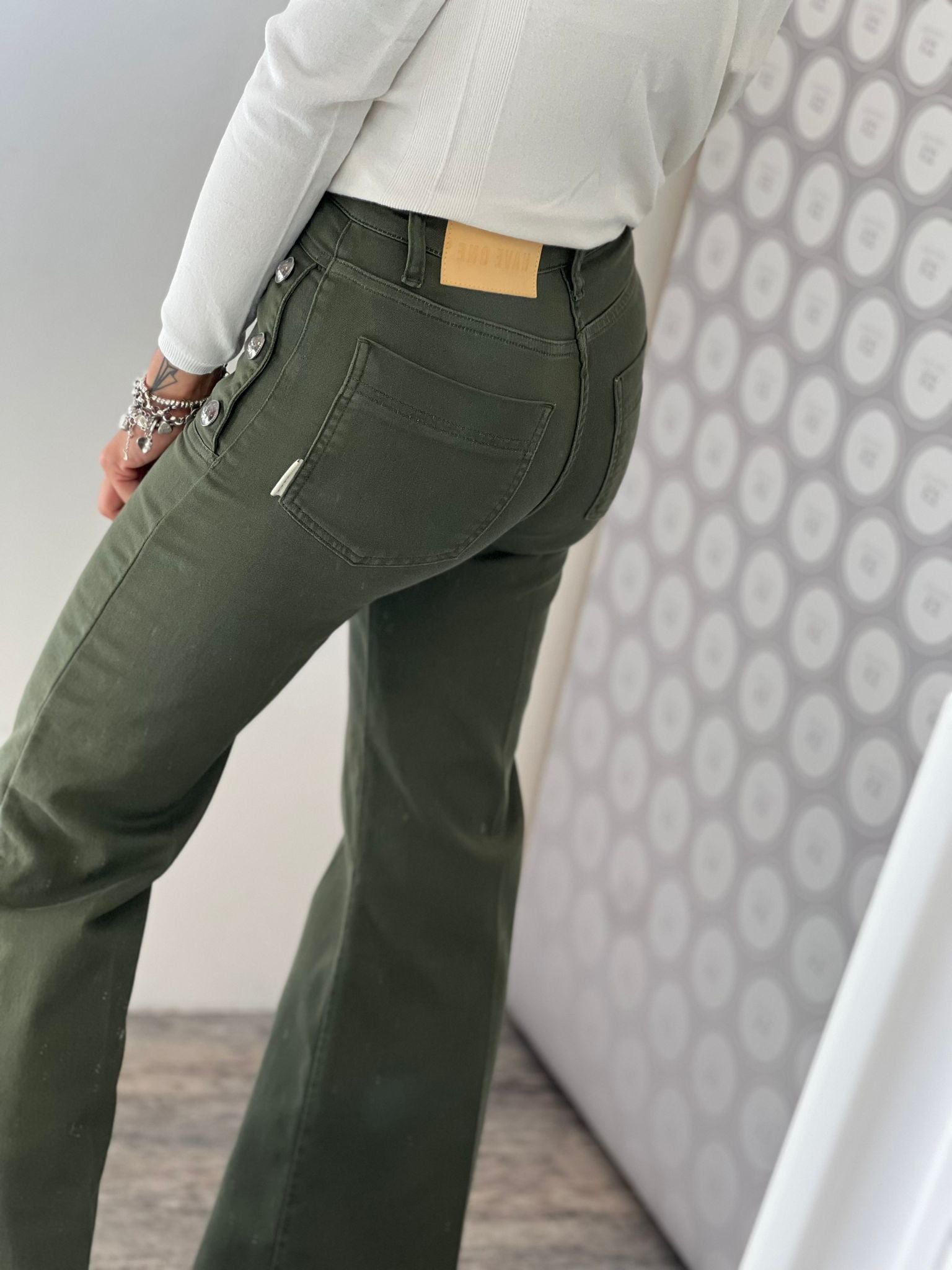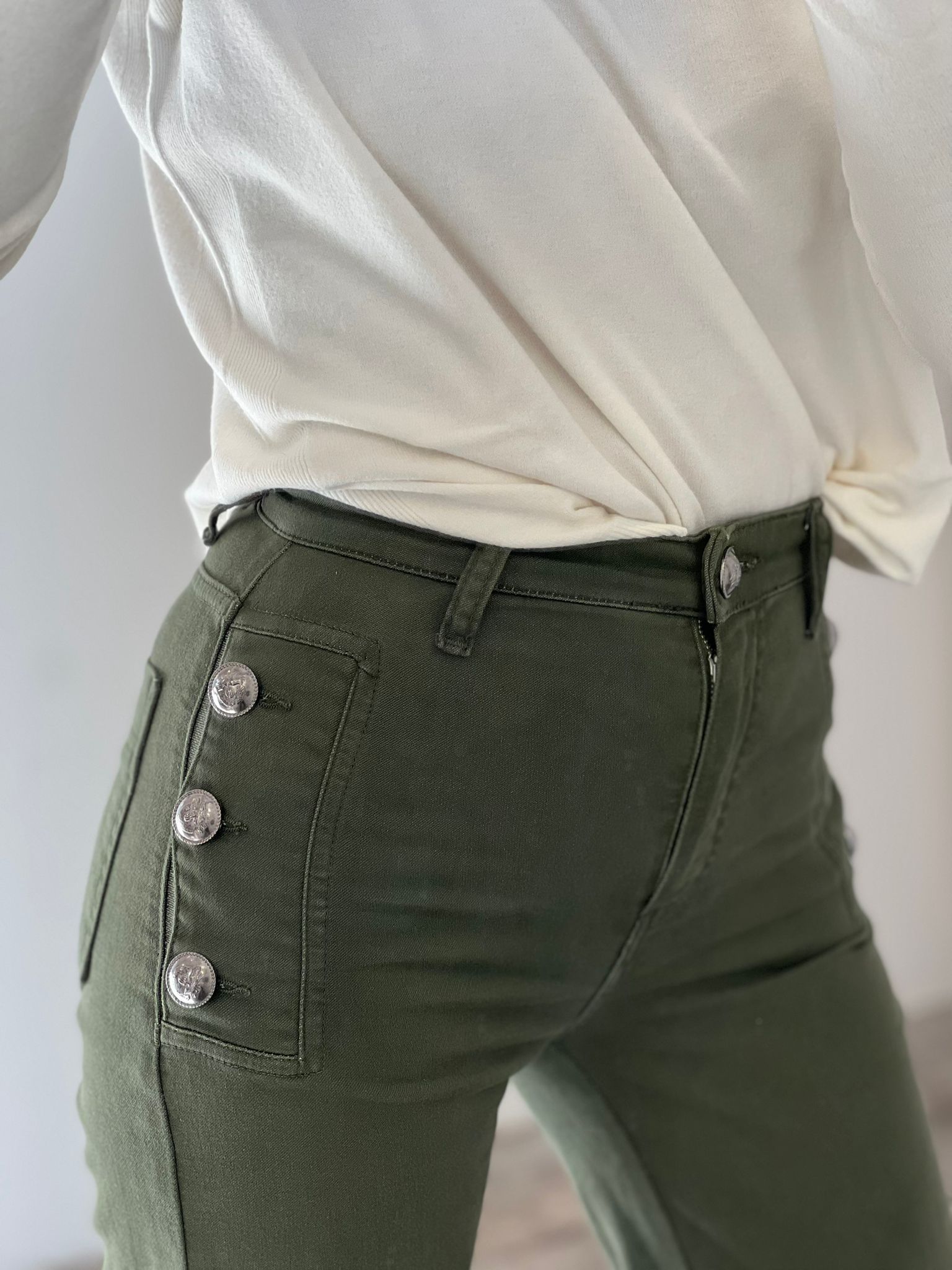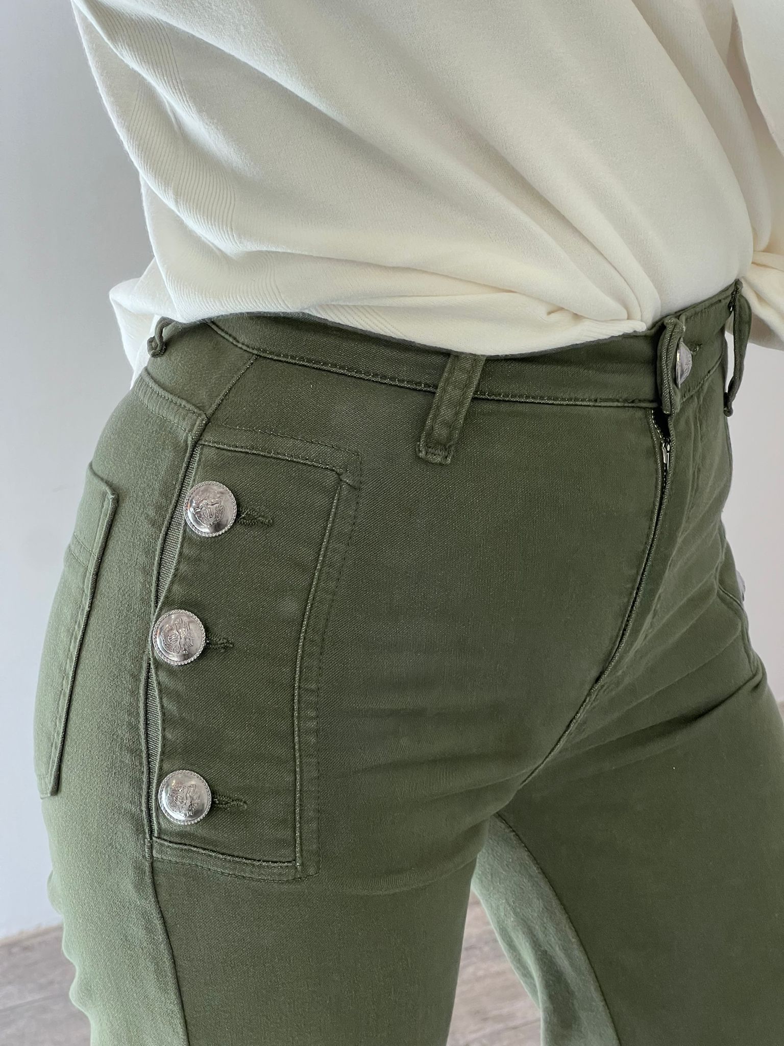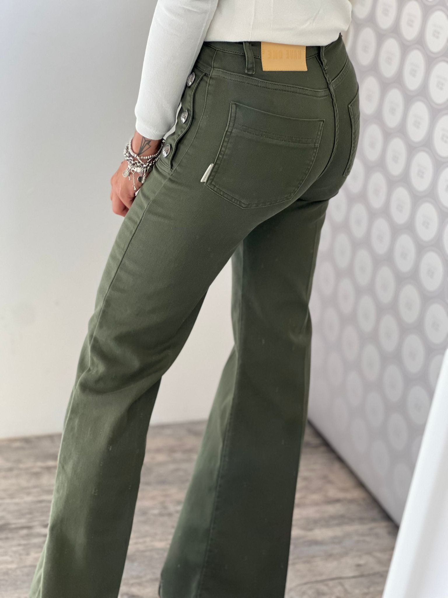 Diana jeans flared fit, vita alta con bottoni decorativi laterali, gamba aderente e zampa finale