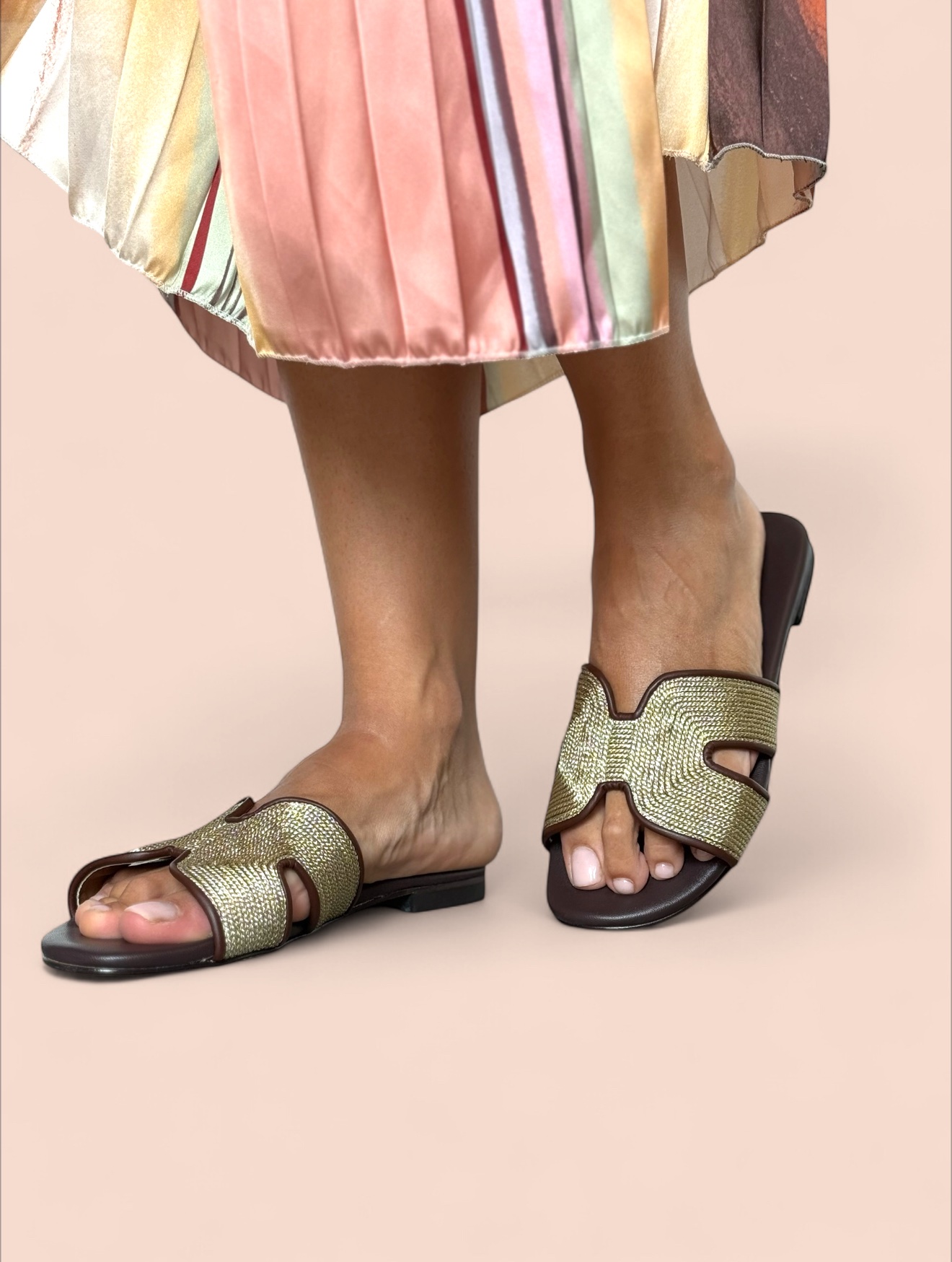 Ciabattina con fascia in rafia oro bordata moro e suola in pelle testa di moro, calzata regolare