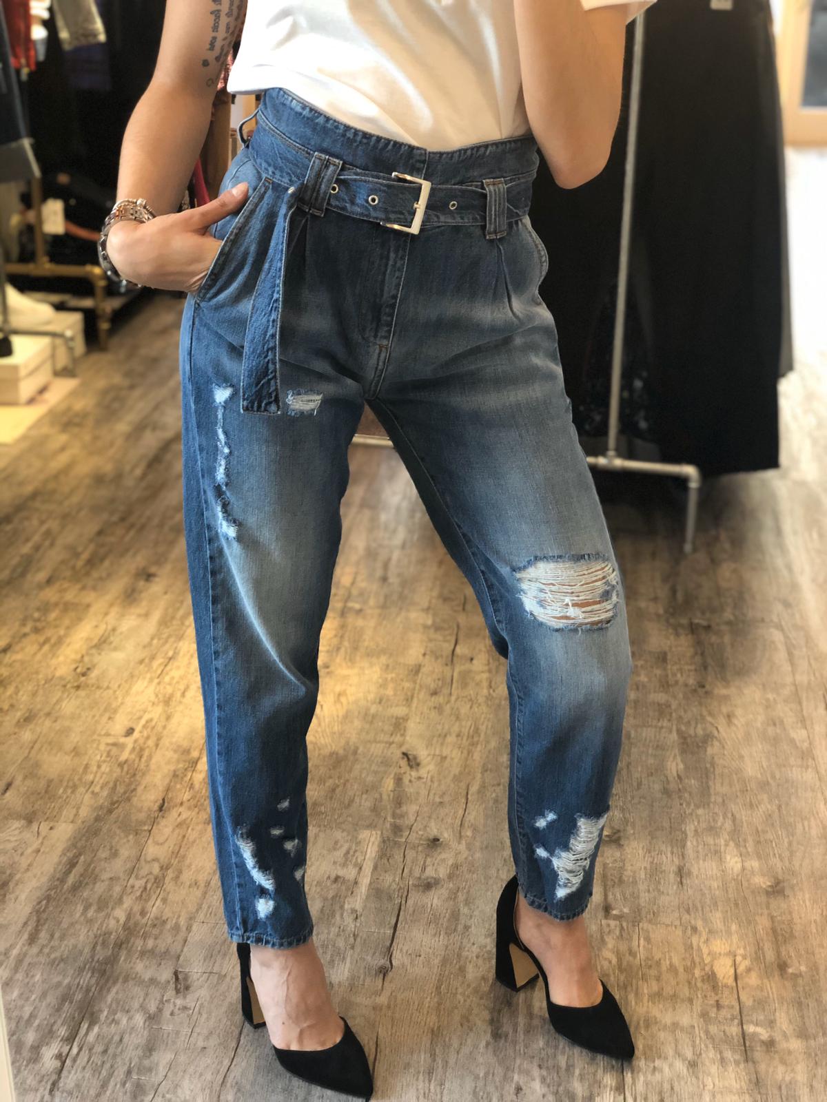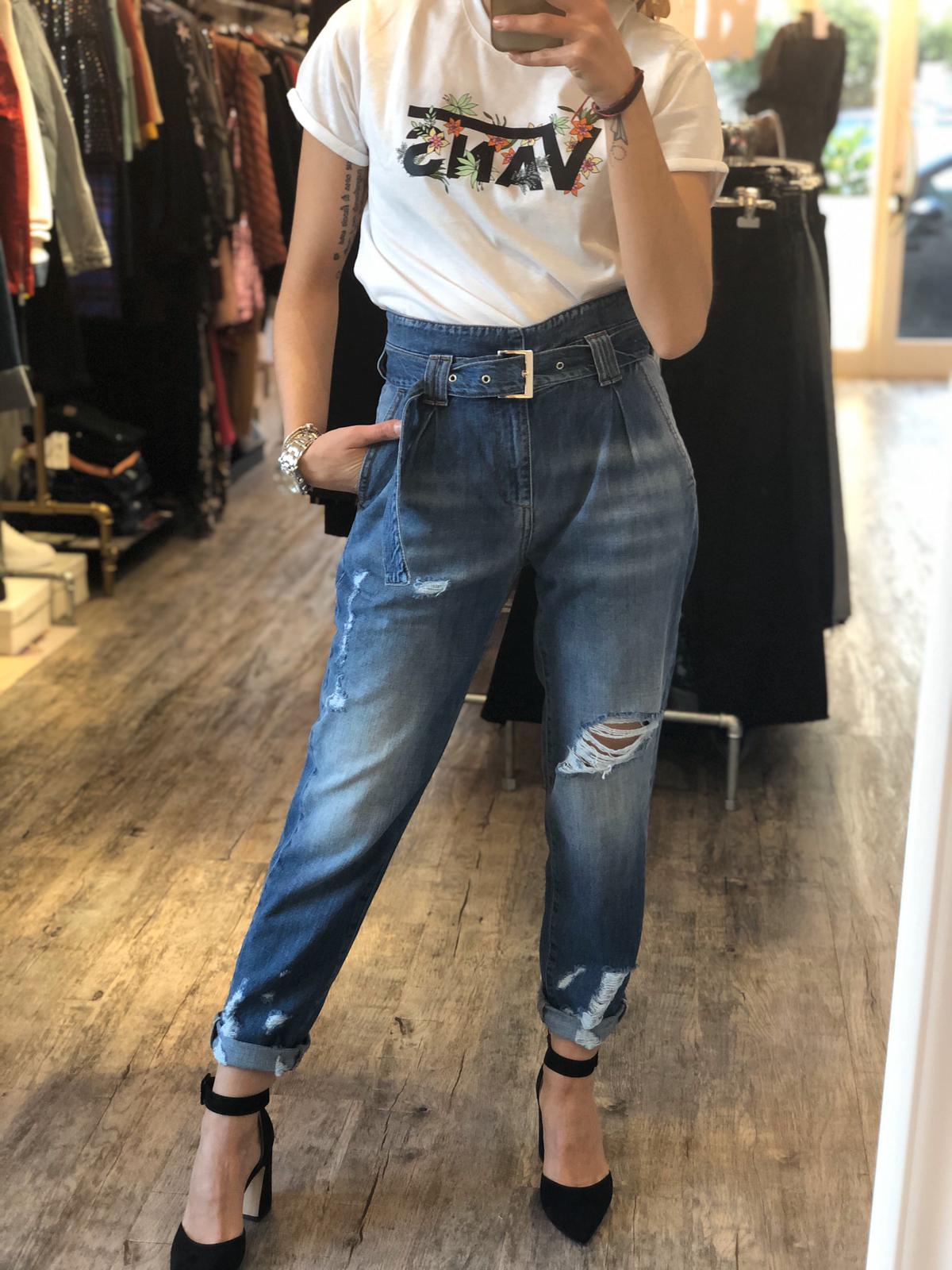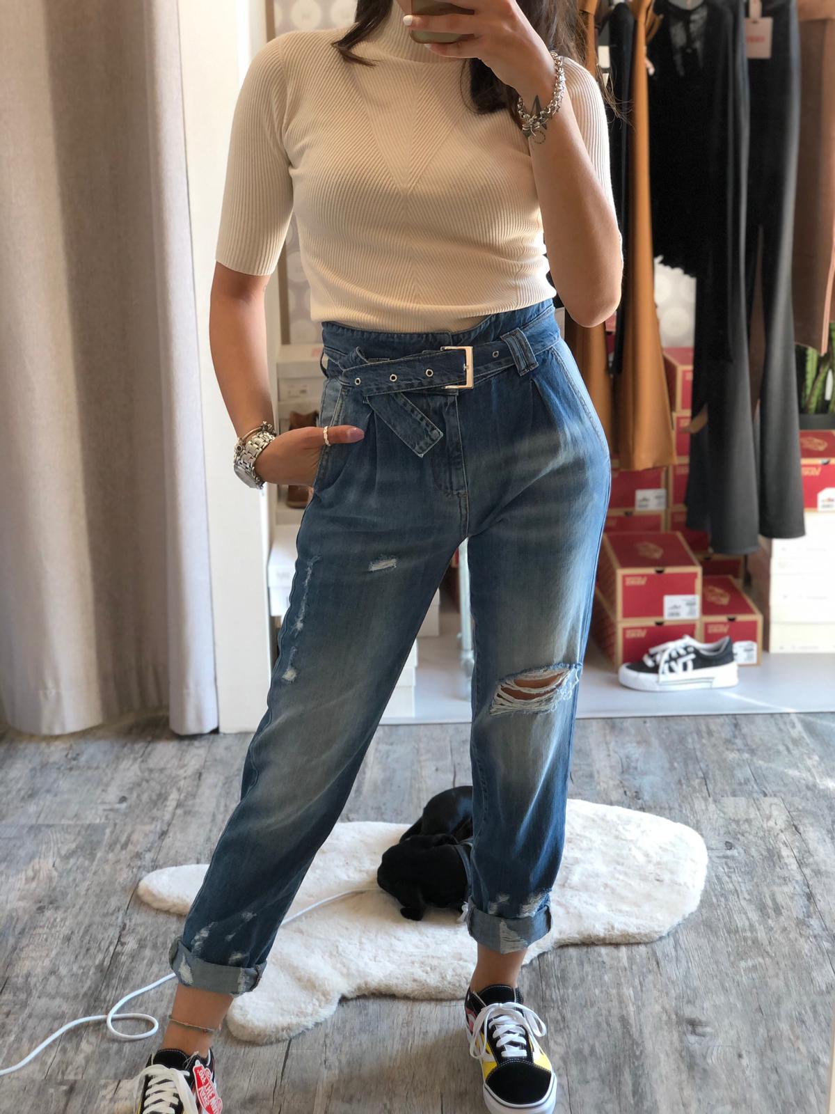 Jeans in 100% cotone taglio morbido e gamba dritta, vita molto alta con cinta in denim su denim bassa per effetto vita leggermente avvitata, vestibilità regolare