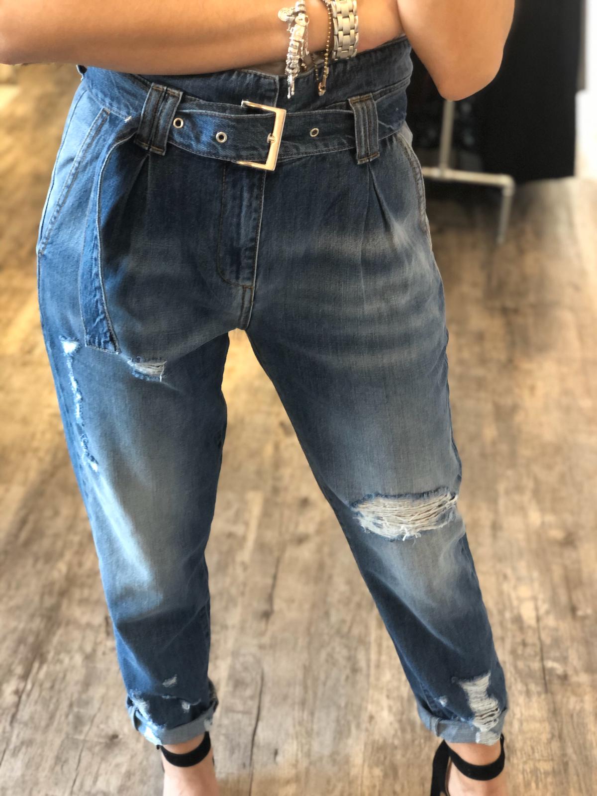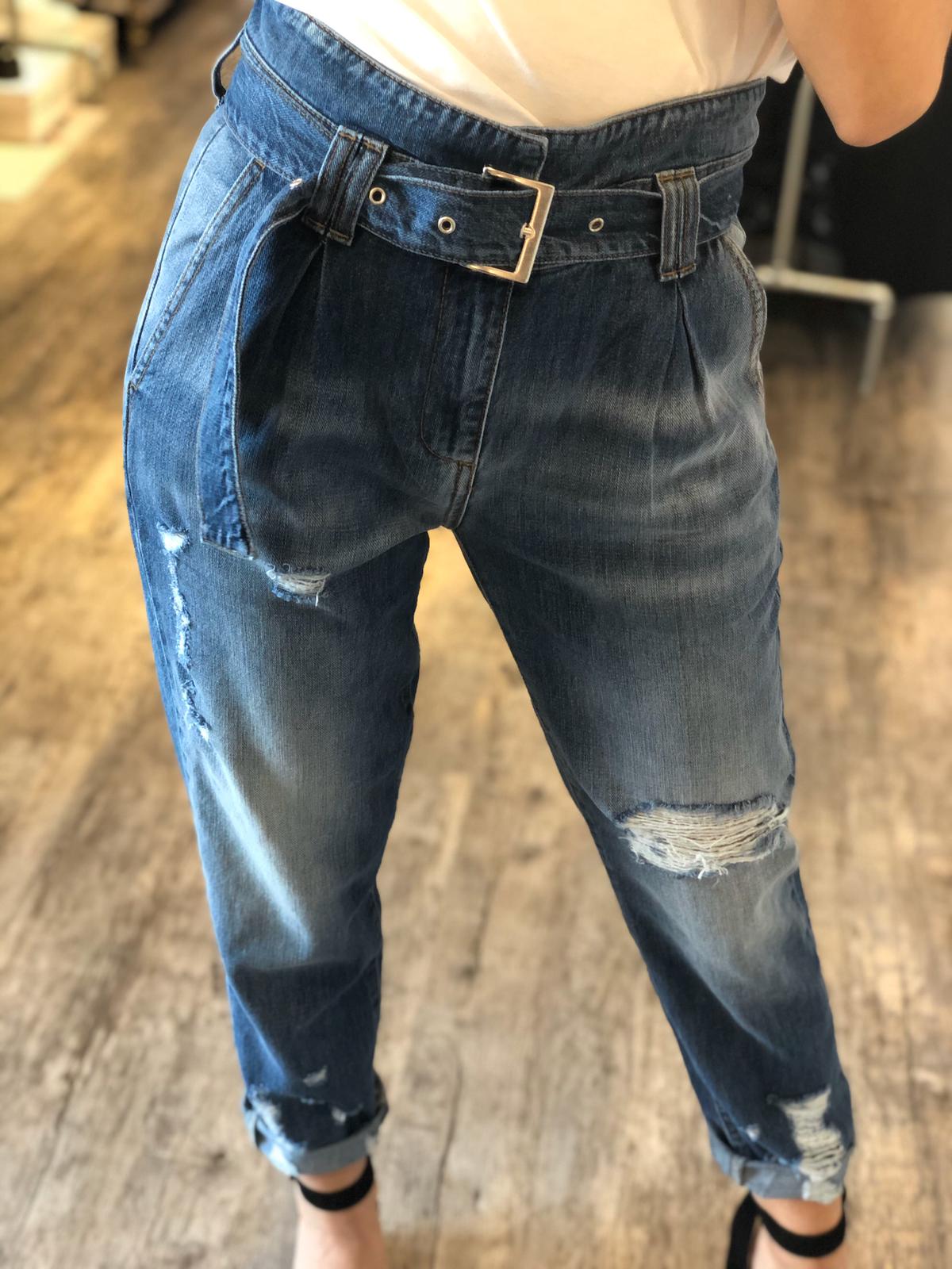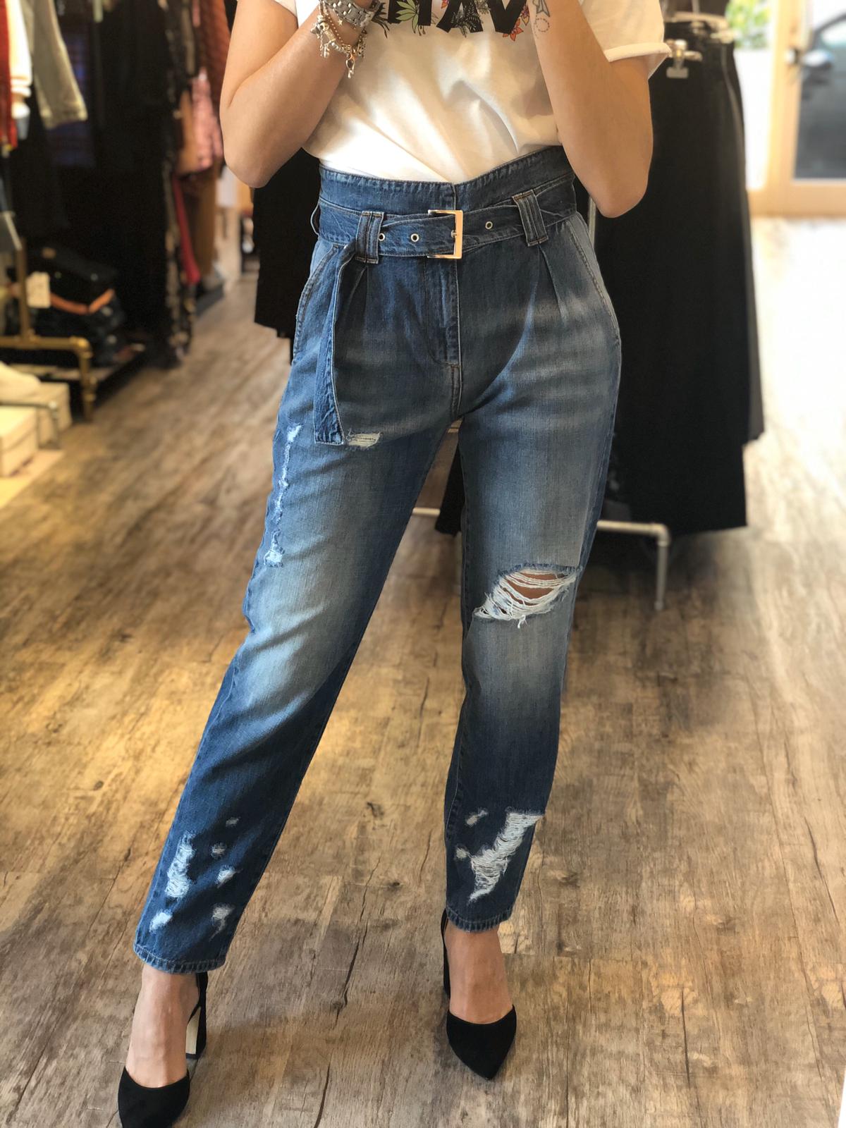Jeans in 100% cotone taglio morbido e gamba dritta, vita molto alta con cinta in denim su denim bassa per effetto vita leggermente avvitata, vestibilità regolare