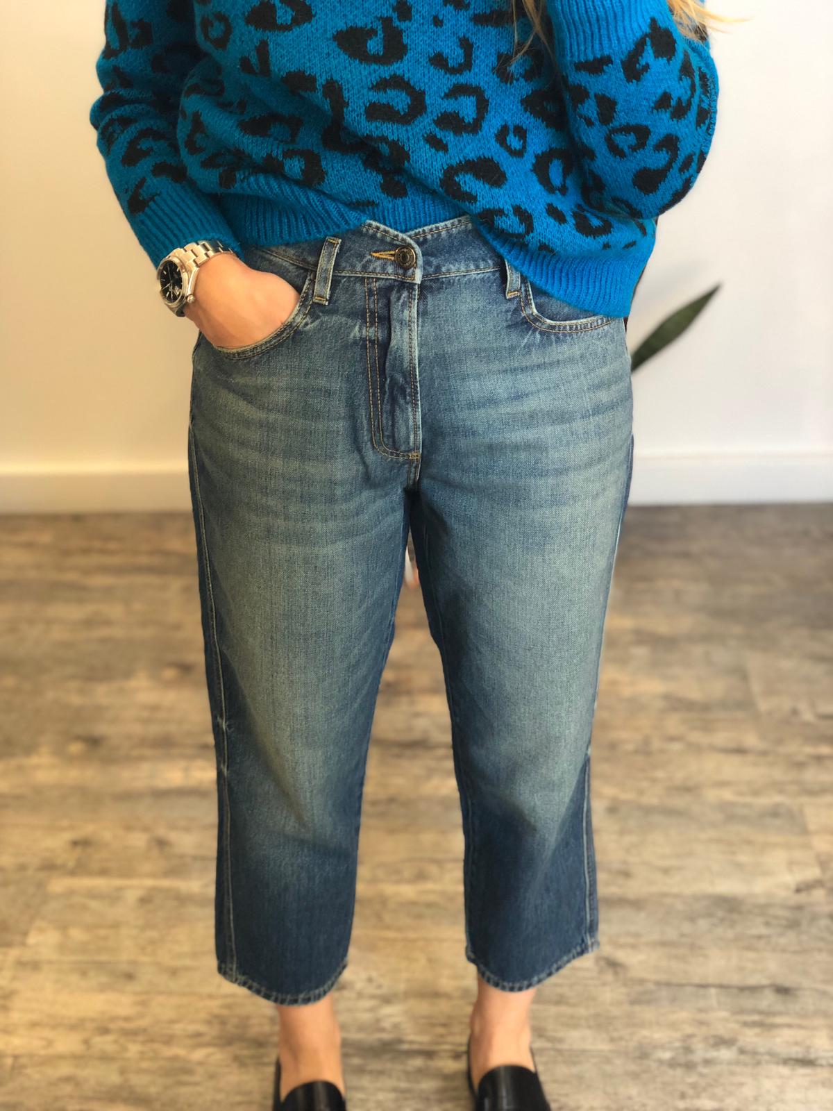 Denim taglio boyfriend lavaggio medio, vestibilità vita alta gamba dritta e morbida lunghezza caviglia