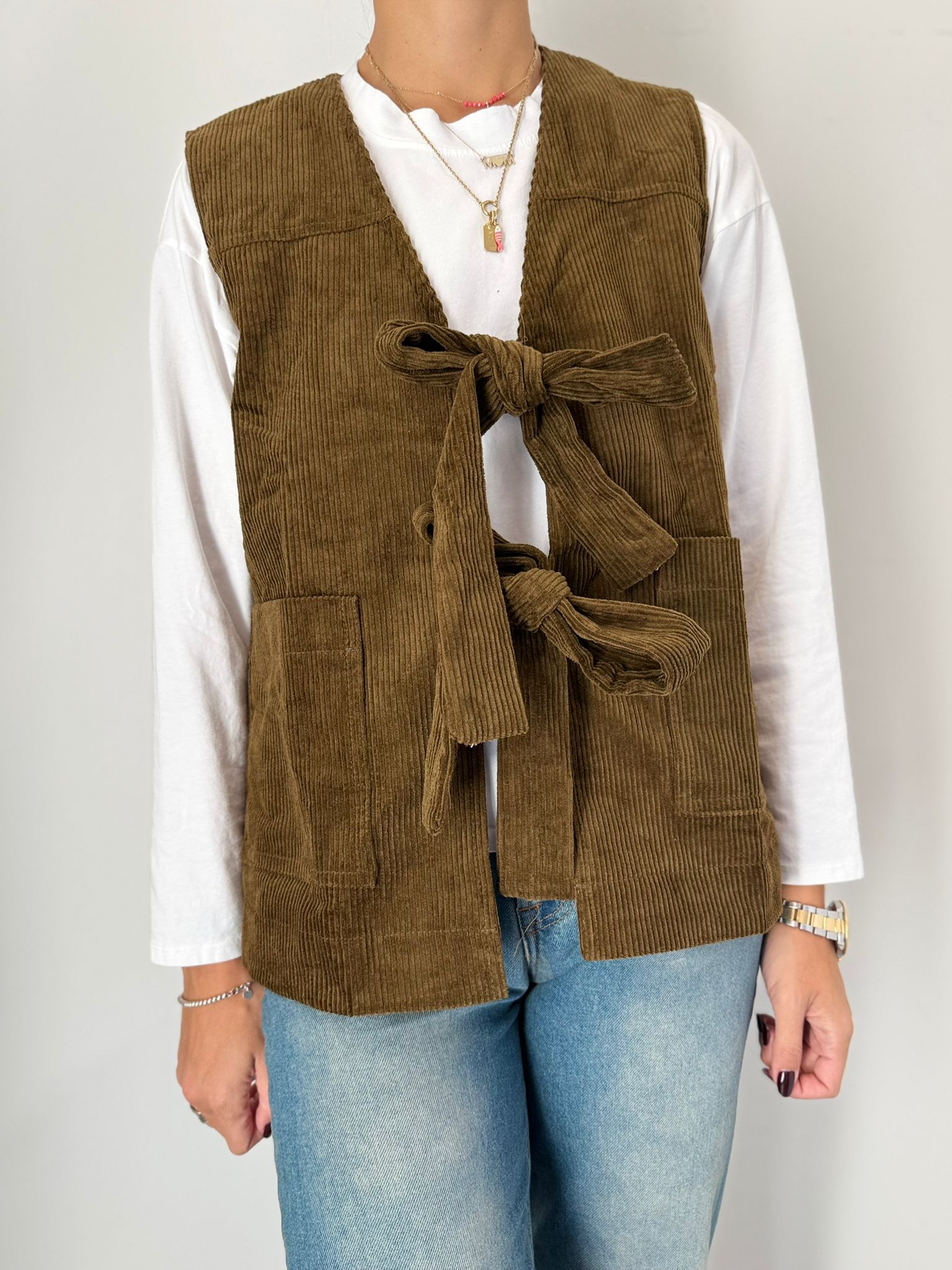 Gilet taglio dritto in velluto a costa larga con fiocco doppiato frontale a chiusura e tasche