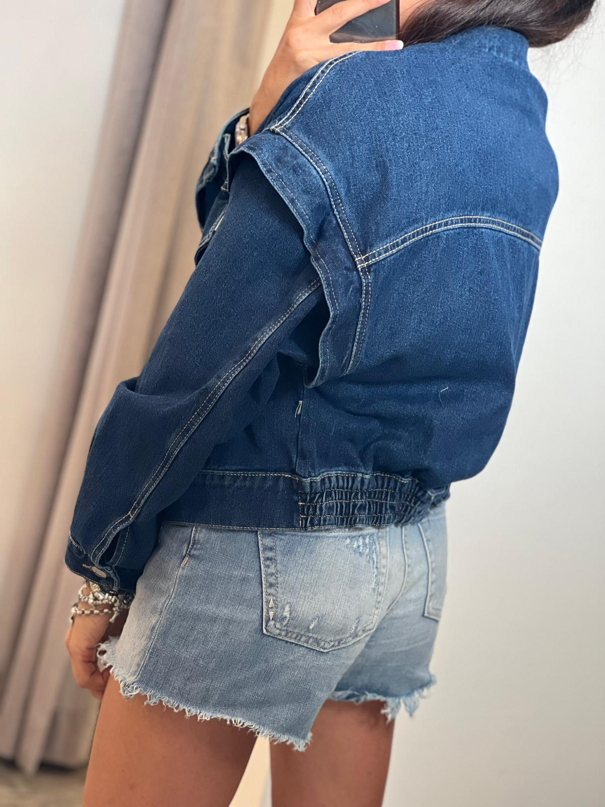 Giubbino in denim con manica aletta effetto bombato, taglio stile bomber con banda arricciata sul retro, tela denim lavaggio scuro
