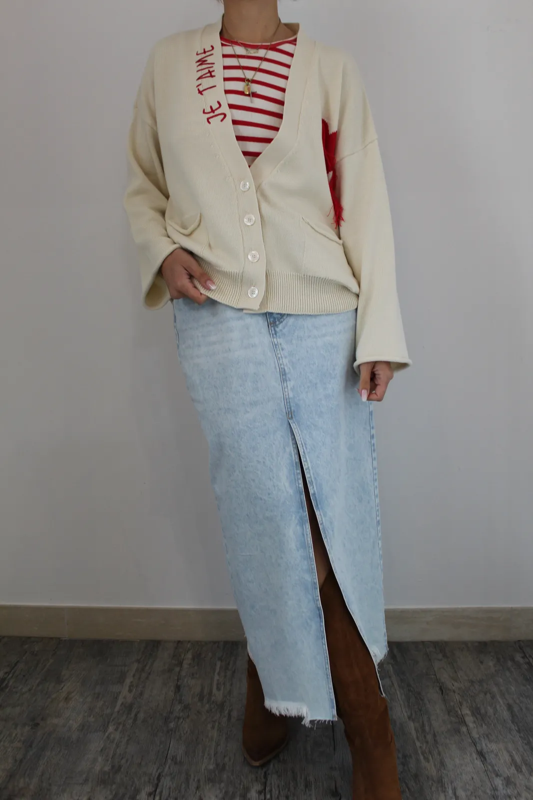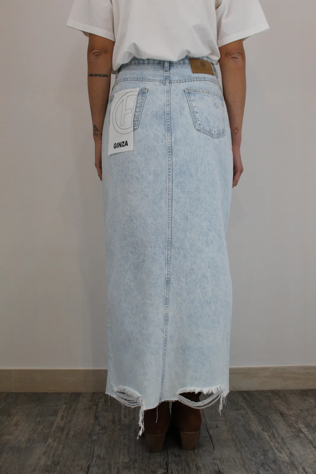 Gonna longuette in 100% cotone tela jeans lavaggio chiaro con spacco frontale e rotture sul fondo, vita alta