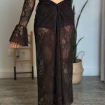 Crop top in pizzo con mezzo colletto a cratere, fit aderente con nodo centrale sul seno e manica svasata a campana su fondo