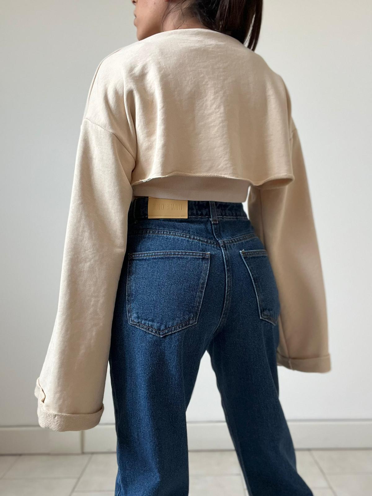 Felpa cropped combinata con canotta a costine (cucita all’interno), girocollo con vestibilità dritta a scatolina e corta, manica lunga a trapezio. In foto si indossa taglia S (altezza 1,63 – 38/40)