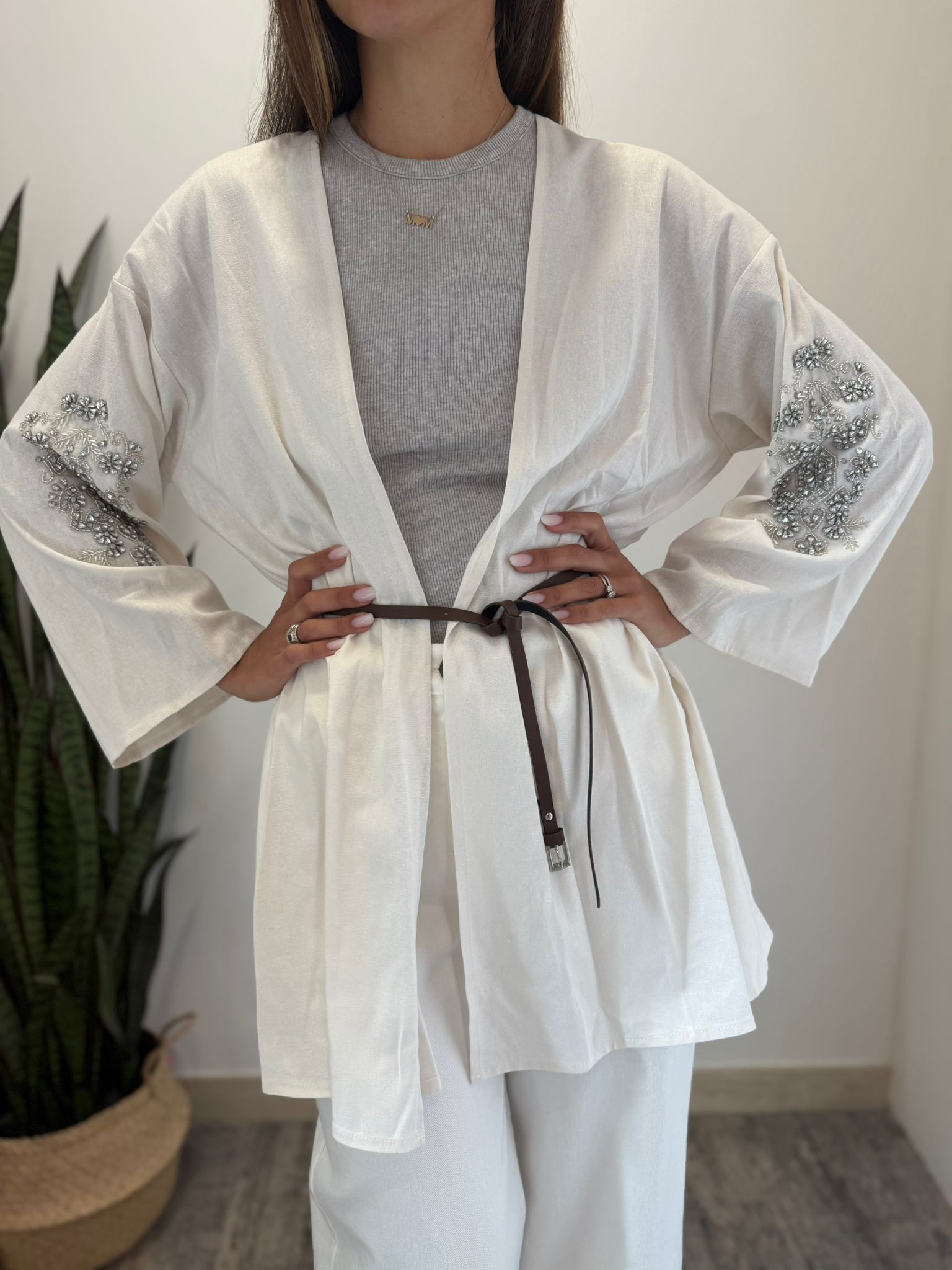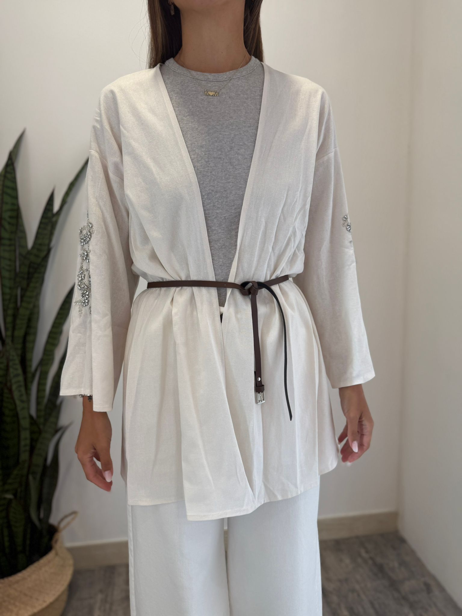 Kimono taglio dritto senza chiusure con applicazione cabochon ricamati a mano sulle maniche a trombetta, cinturina in ecopelle inclusa