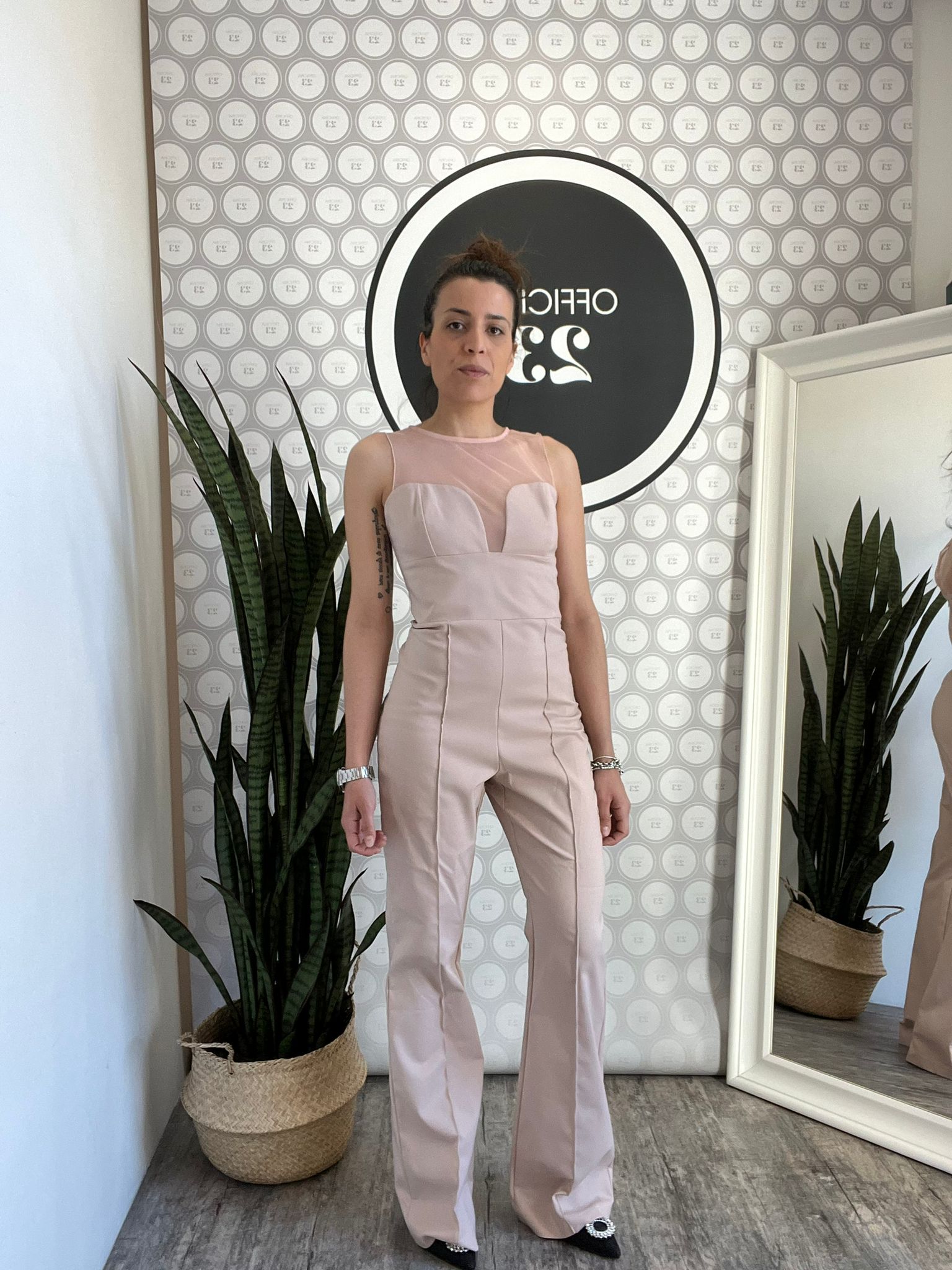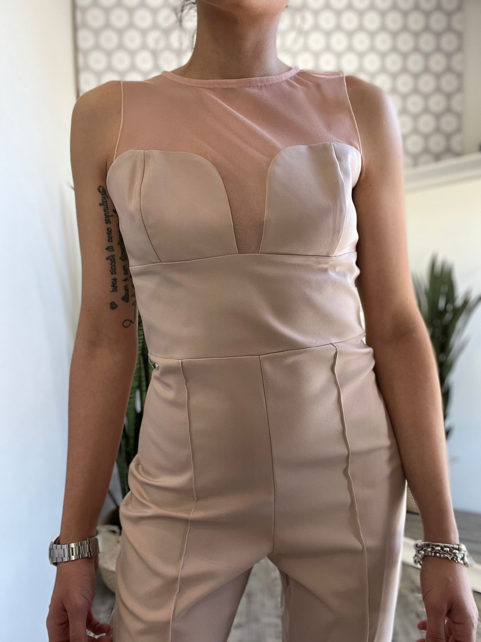 Maxi tuta girocollo con contrasto tessuto a cuore su decolletè in microrete trasparente fronte/retro, taglio in vita e pantalone simil palazzo