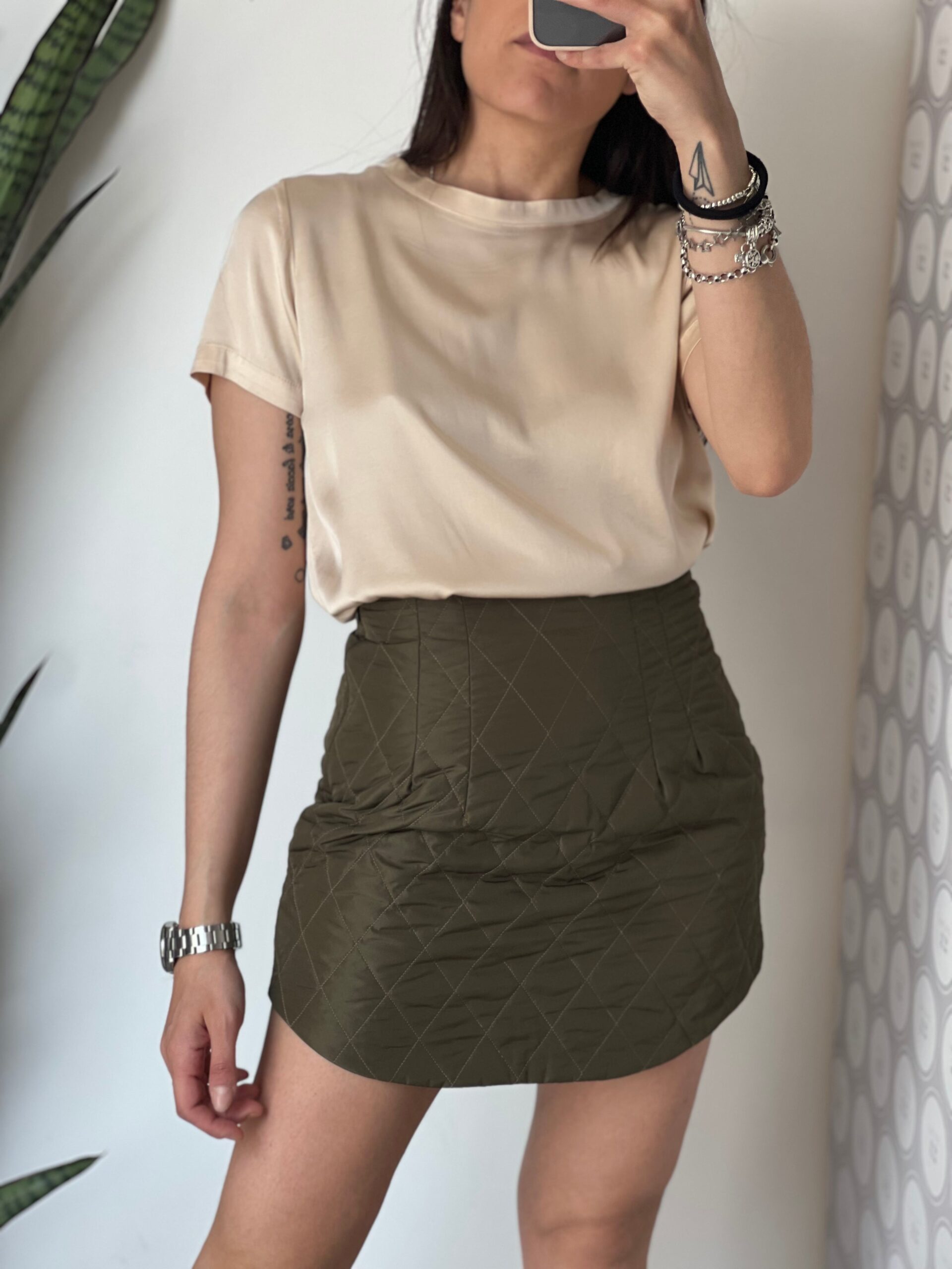 Minigonna trapuntata con finale stondato, vita alta, zip laterale a chiusura