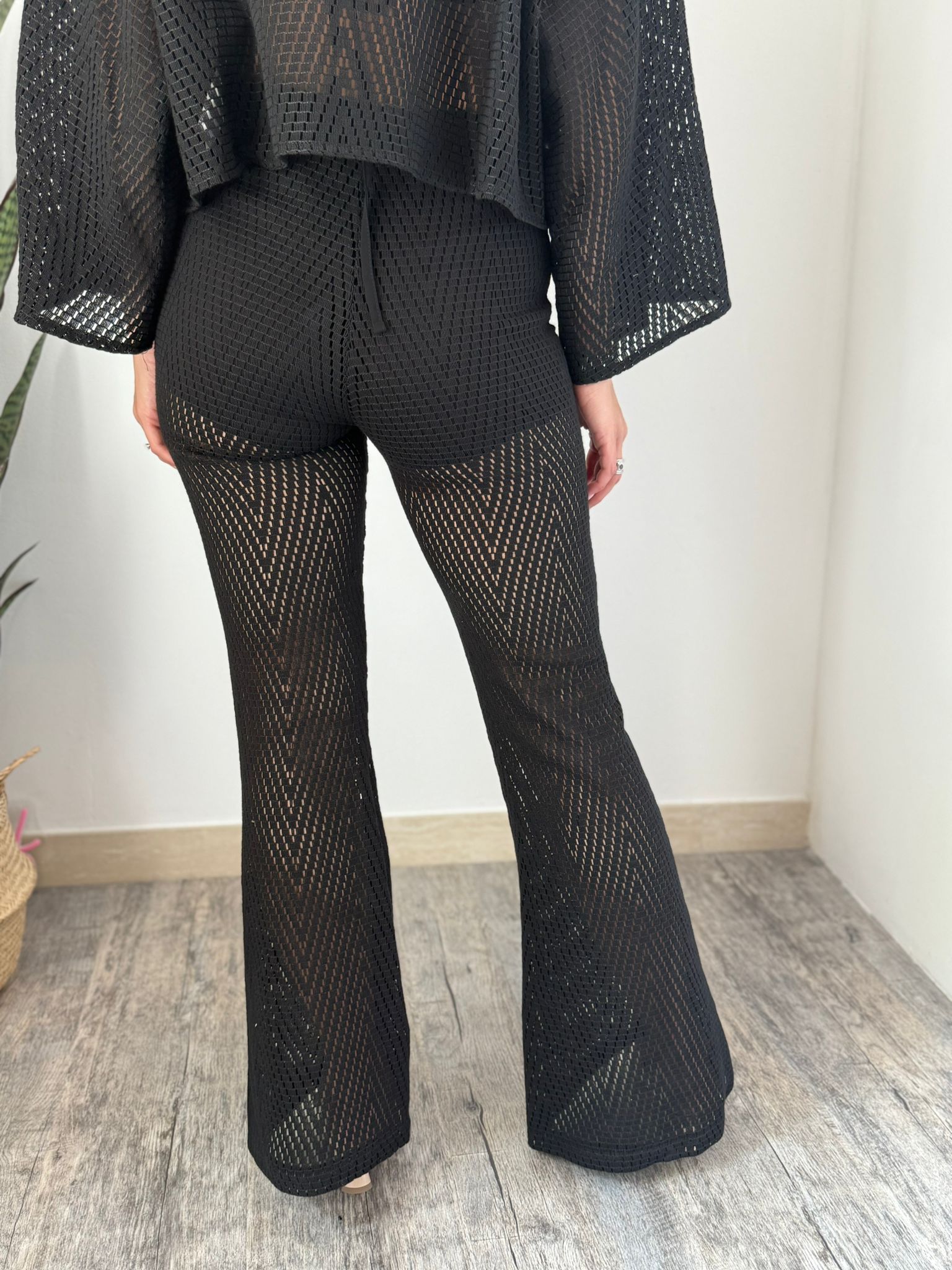 Pantalone a zampa in lavorazione crochet a nido d’ape con banda elastica giro vita nascosta e culotte interna anti trasparenza, slim su coscia e zampa finale