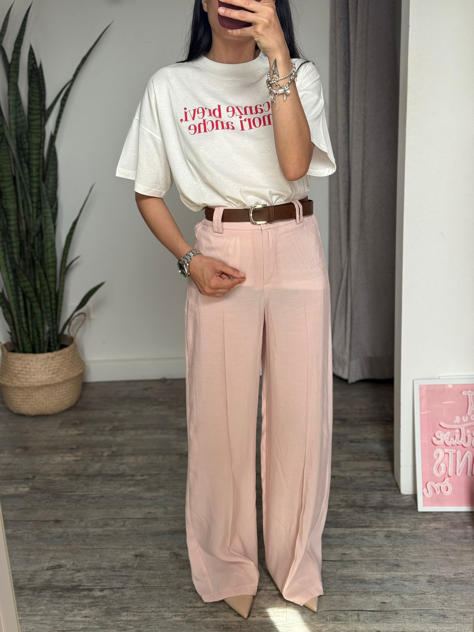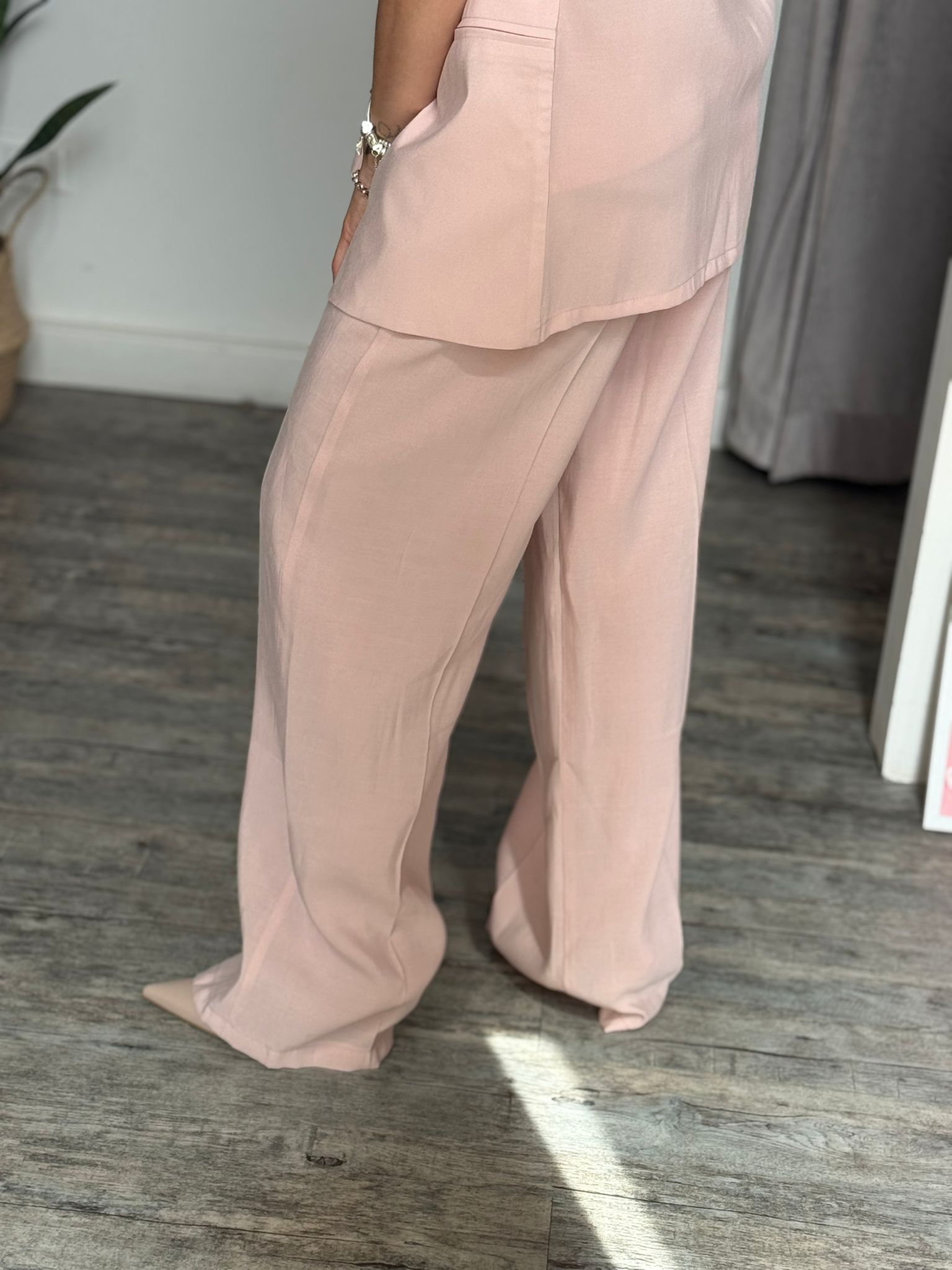 Pantalone palazzo morbido con banda elastica arricciata sul retro e cinta inclusa