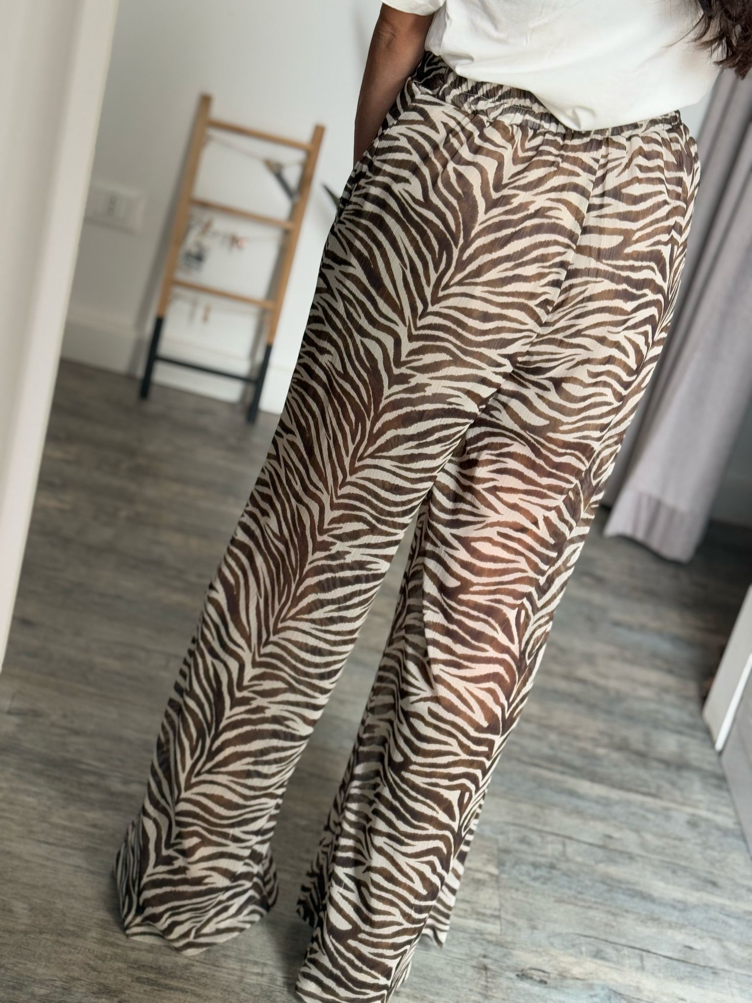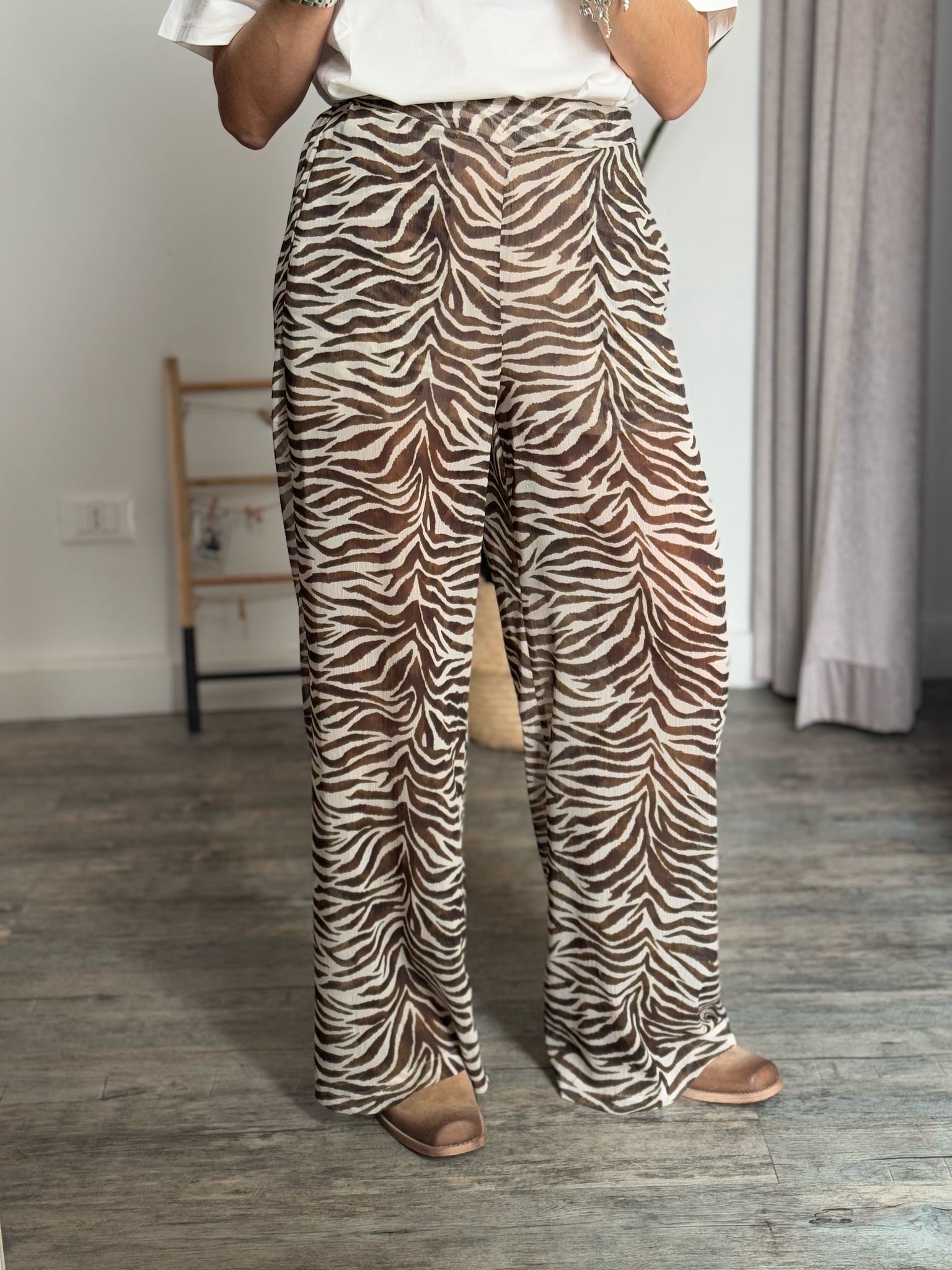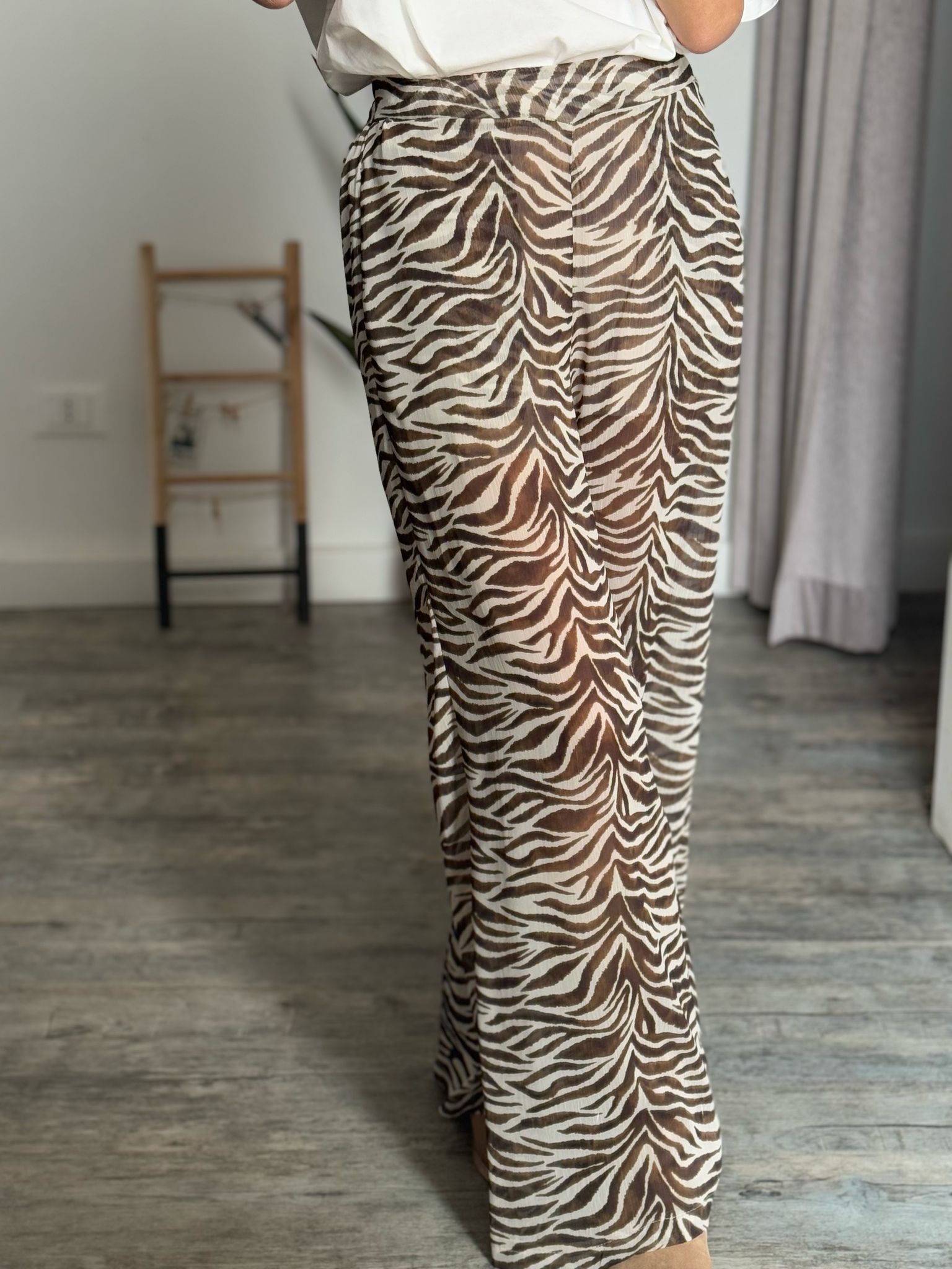 Pantalone palazzo morbido vita alta con arriccio elastico sul retro e doppia tasca filetto, in effetto simil georgette fantasia zebrata, fodera short interna cucita
