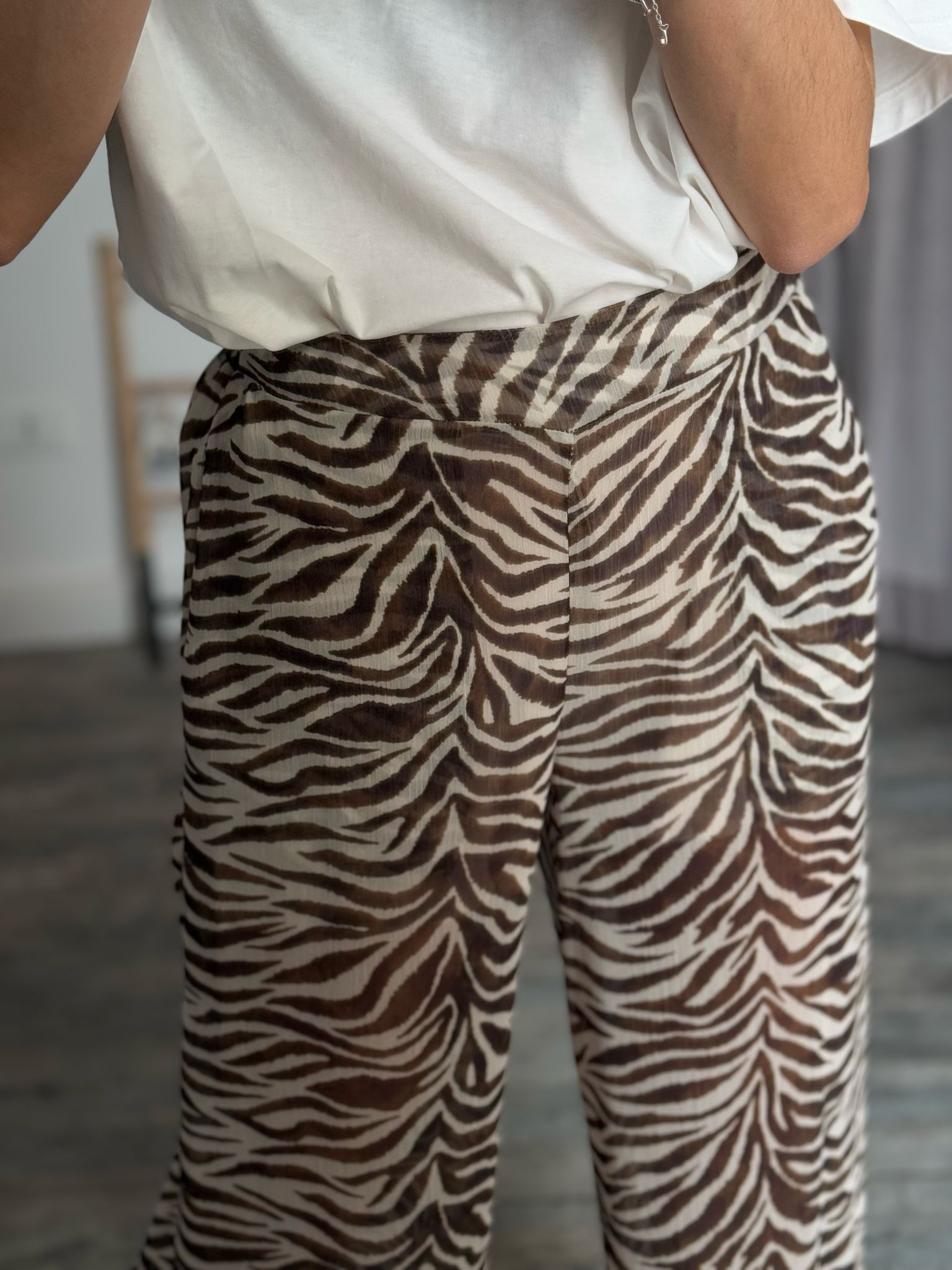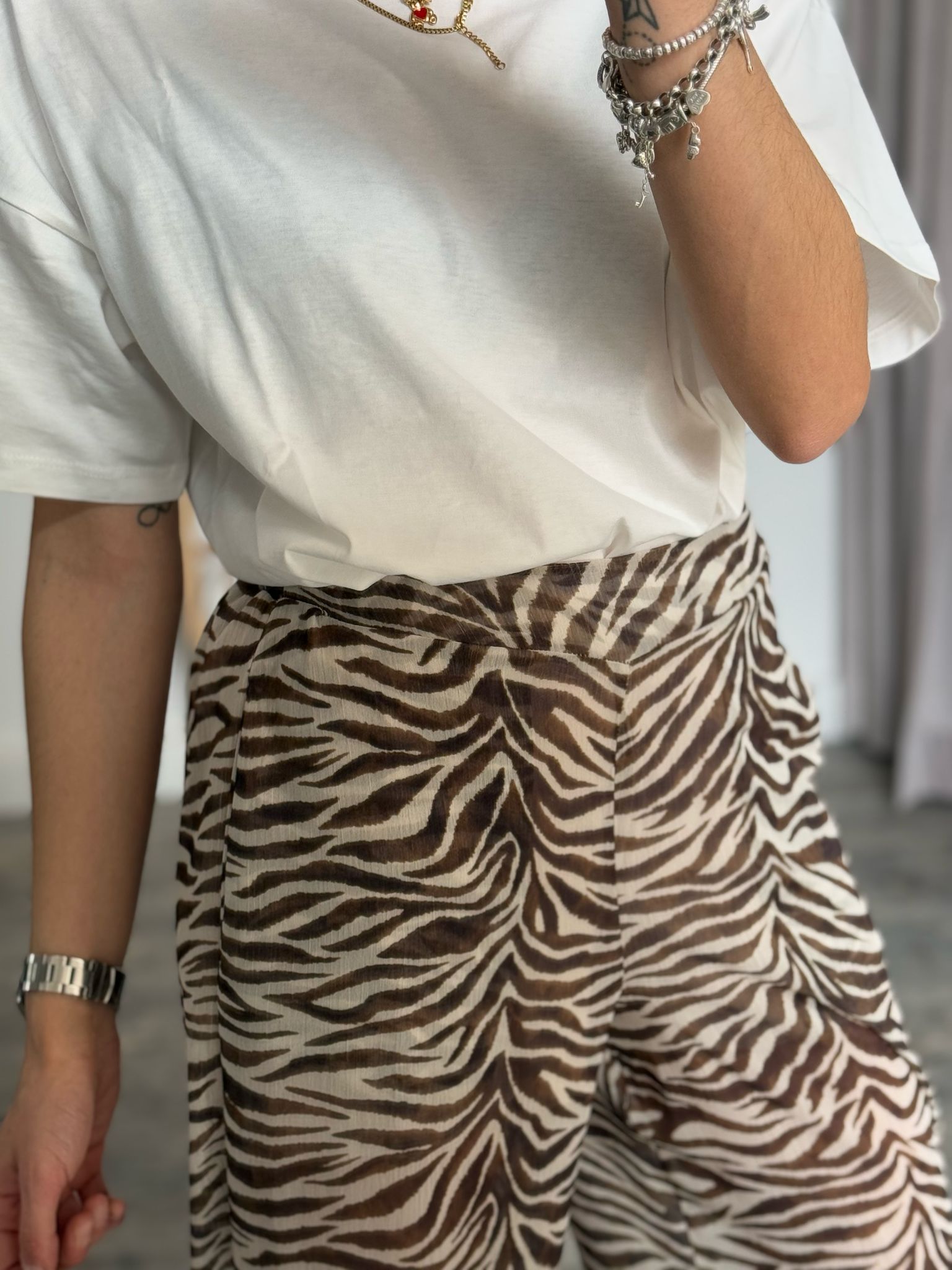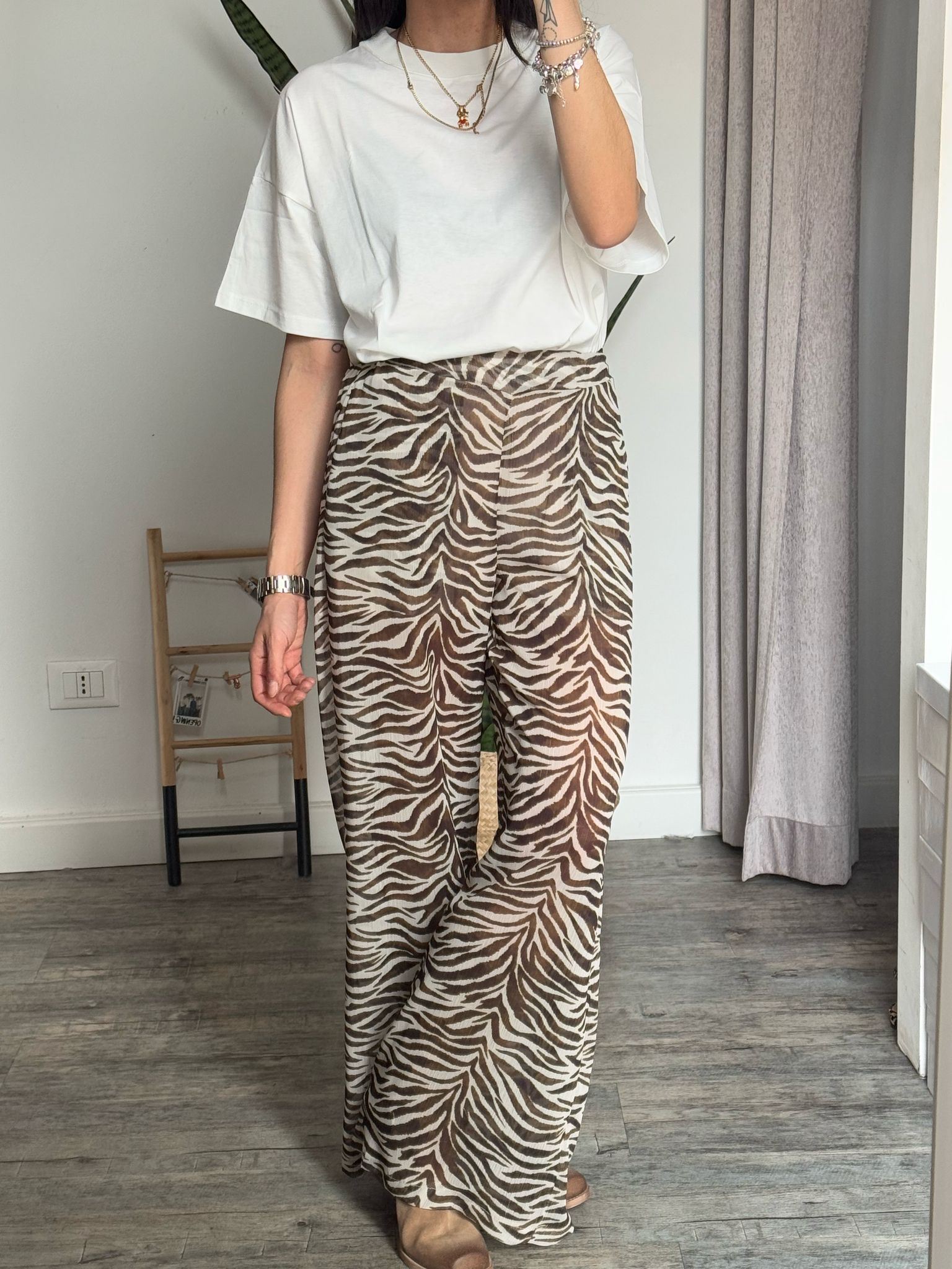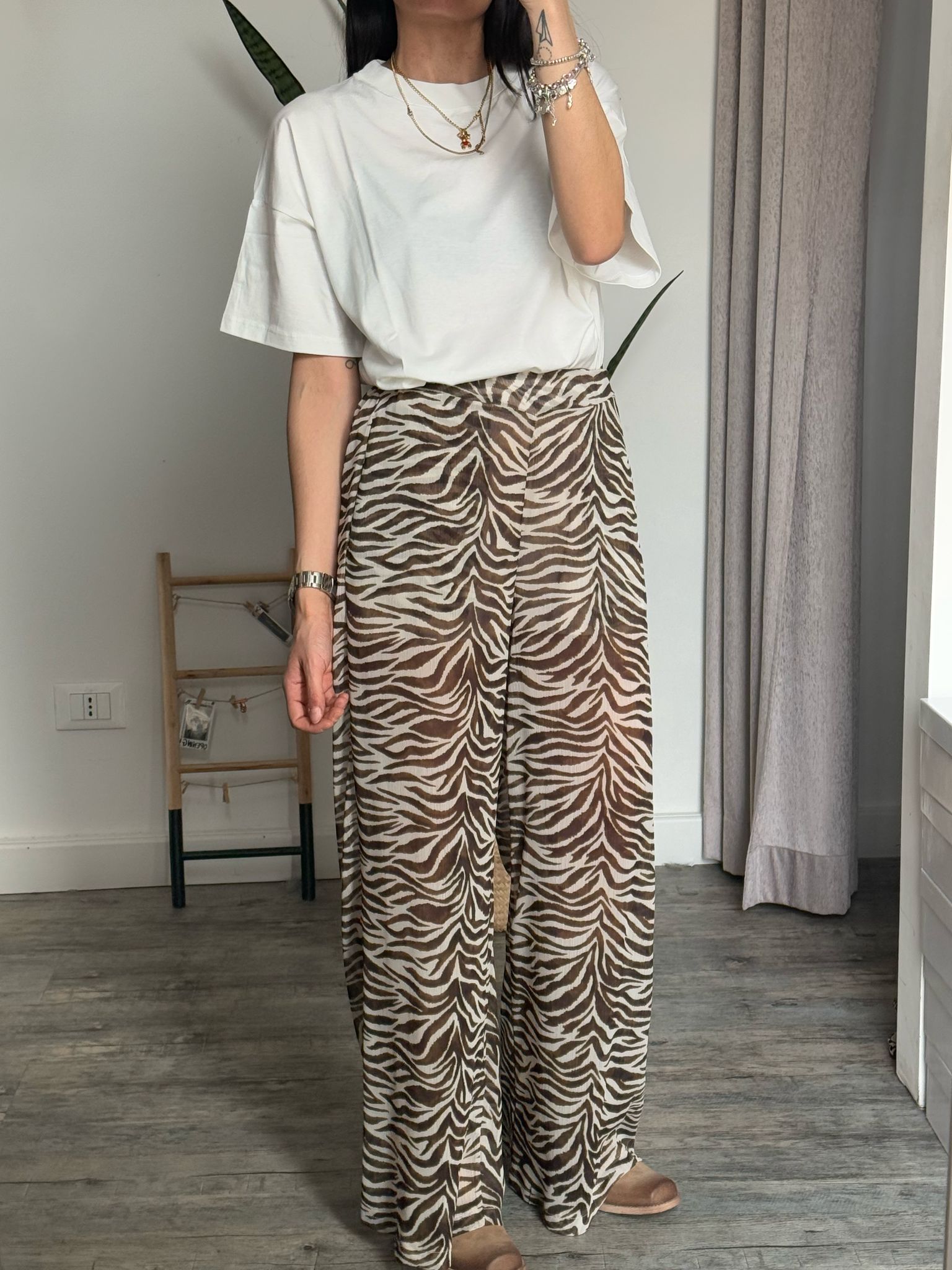 Pantalone palazzo morbido vita alta con arriccio elastico sul retro e doppia tasca filetto, in effetto simil georgette fantasia zebrata, fodera short interna cucita