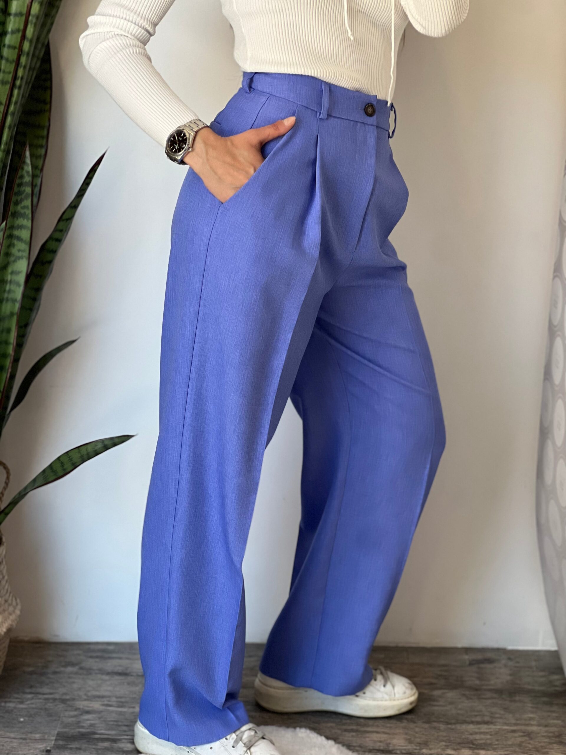 Pantalone palazzo vita alta con tasche laterali, zip e bottone a chiusura