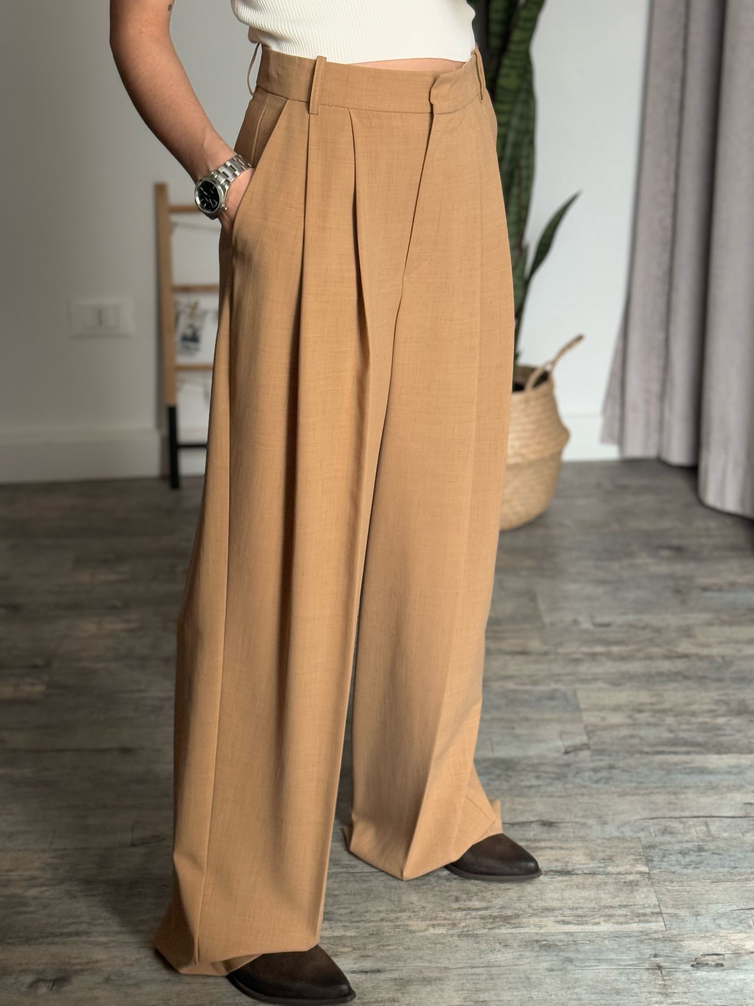 Pantalone vita bassa taglio palazzo con doppia pinces e tasche filetto