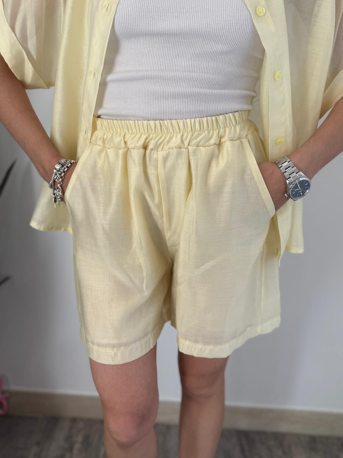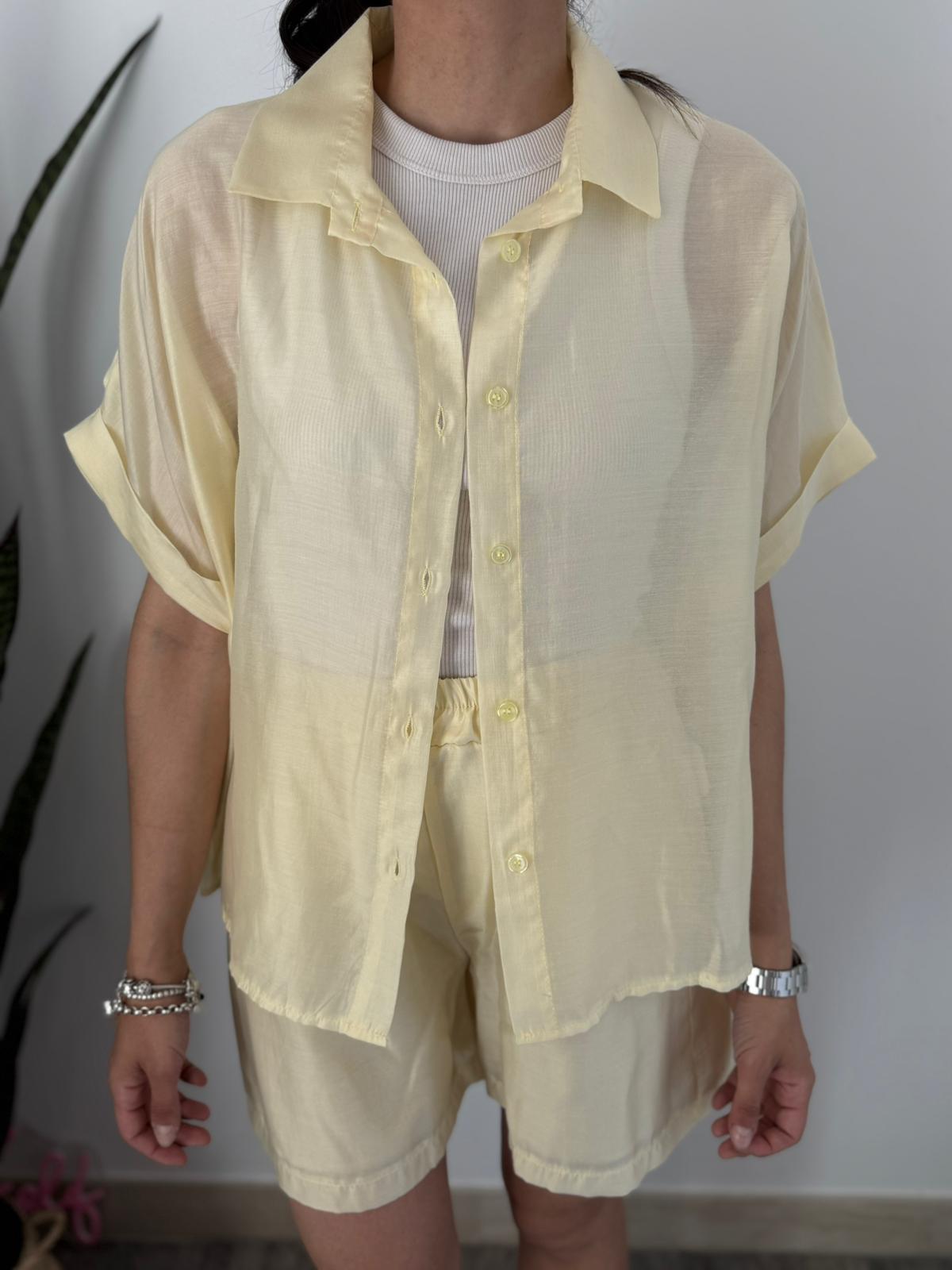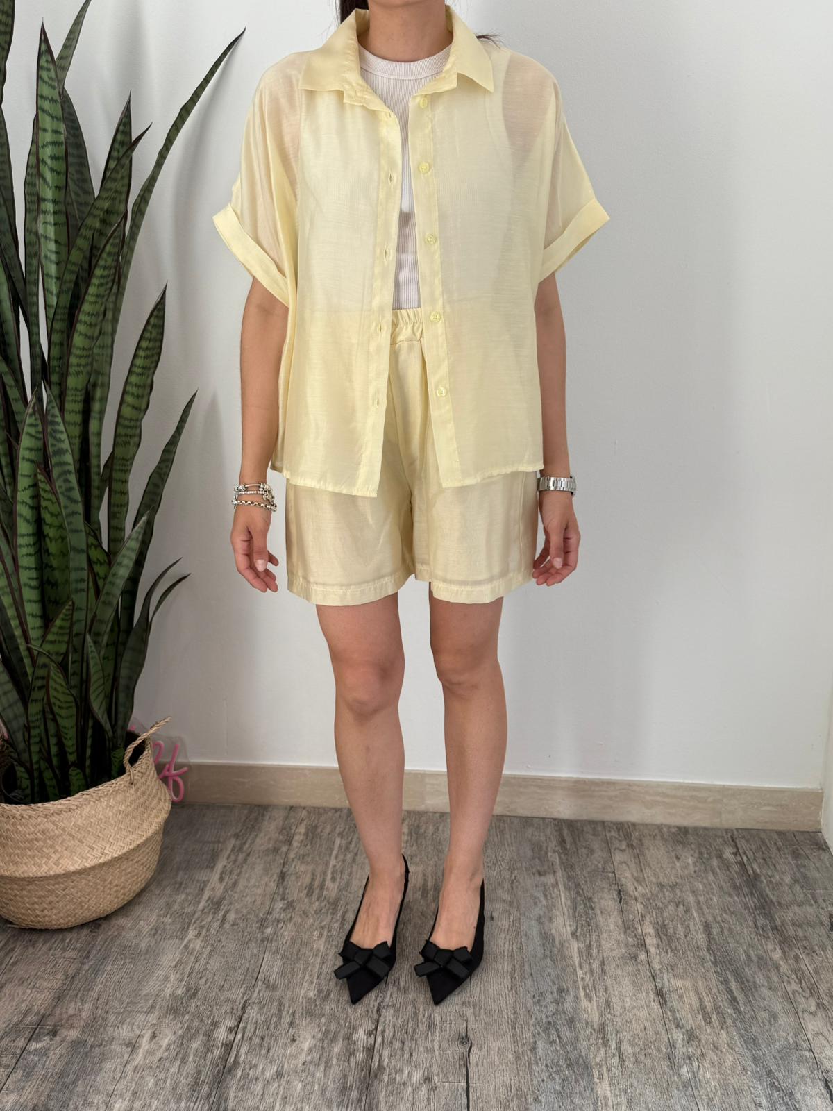 Set completo composto da camicia taglio scatoletta con risvolto su mezza manica e short vita alta con banda arricciata giro vita, doppia tasca filetto