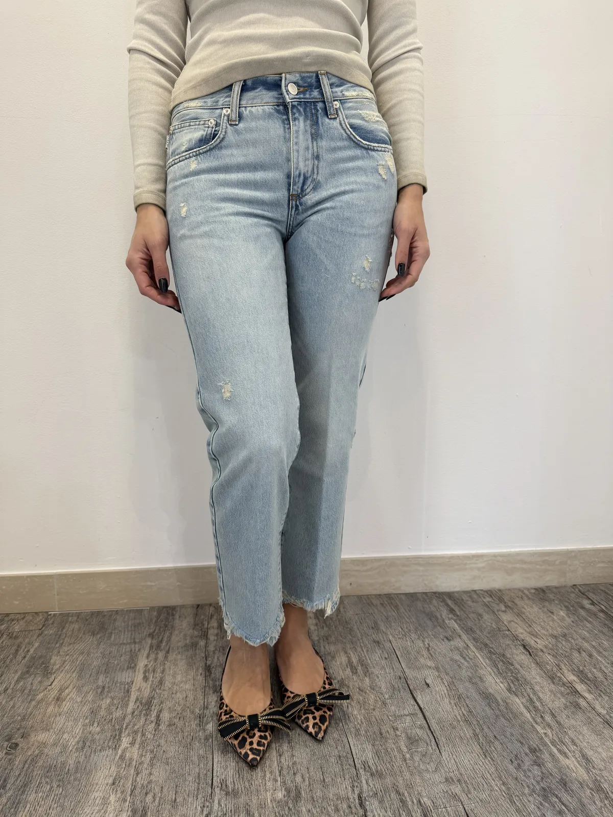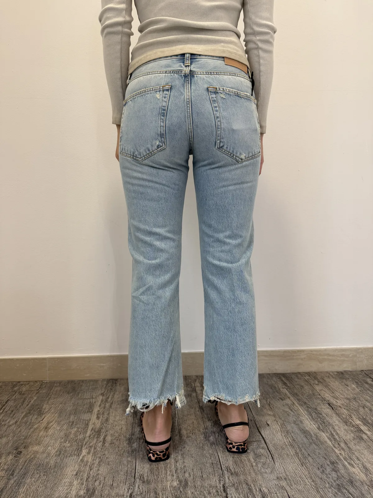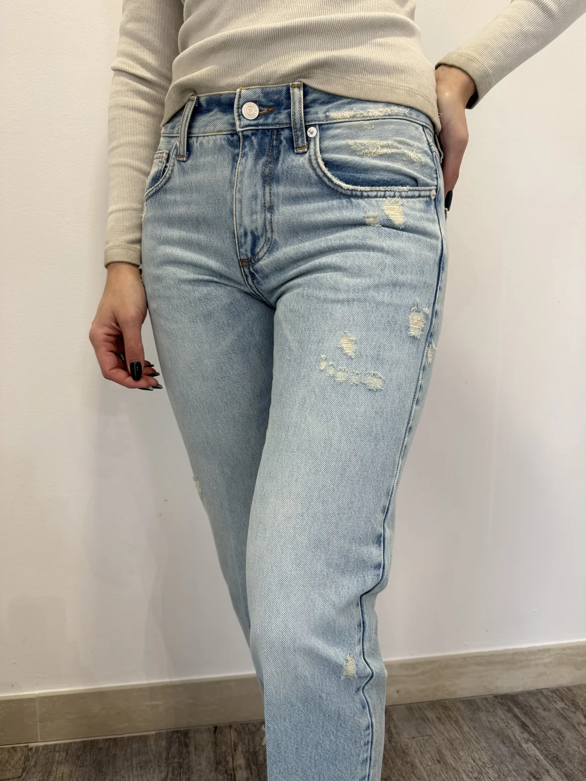 Jeans Zeke con gamba dritta e vita bassa. Relaxed Fit. Modello cinque tasche. Lavaggio blu chiaro con schiariture vintage. Dettaglio fondo con rotture.