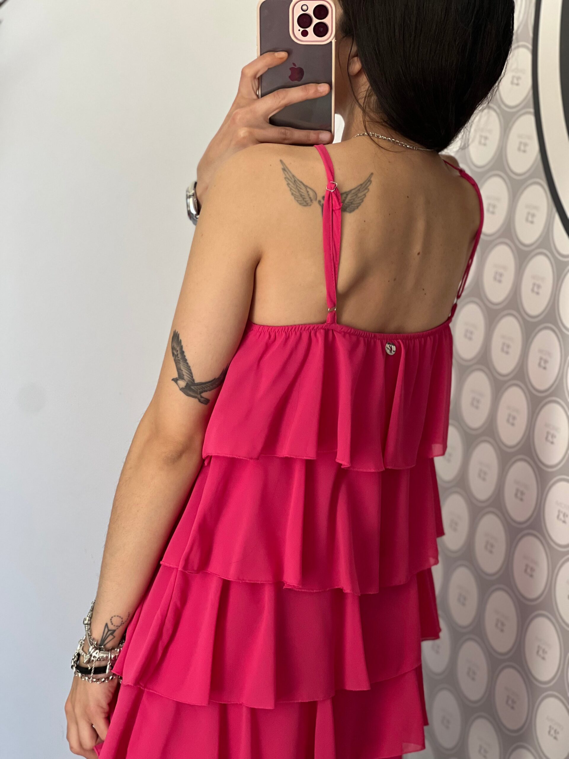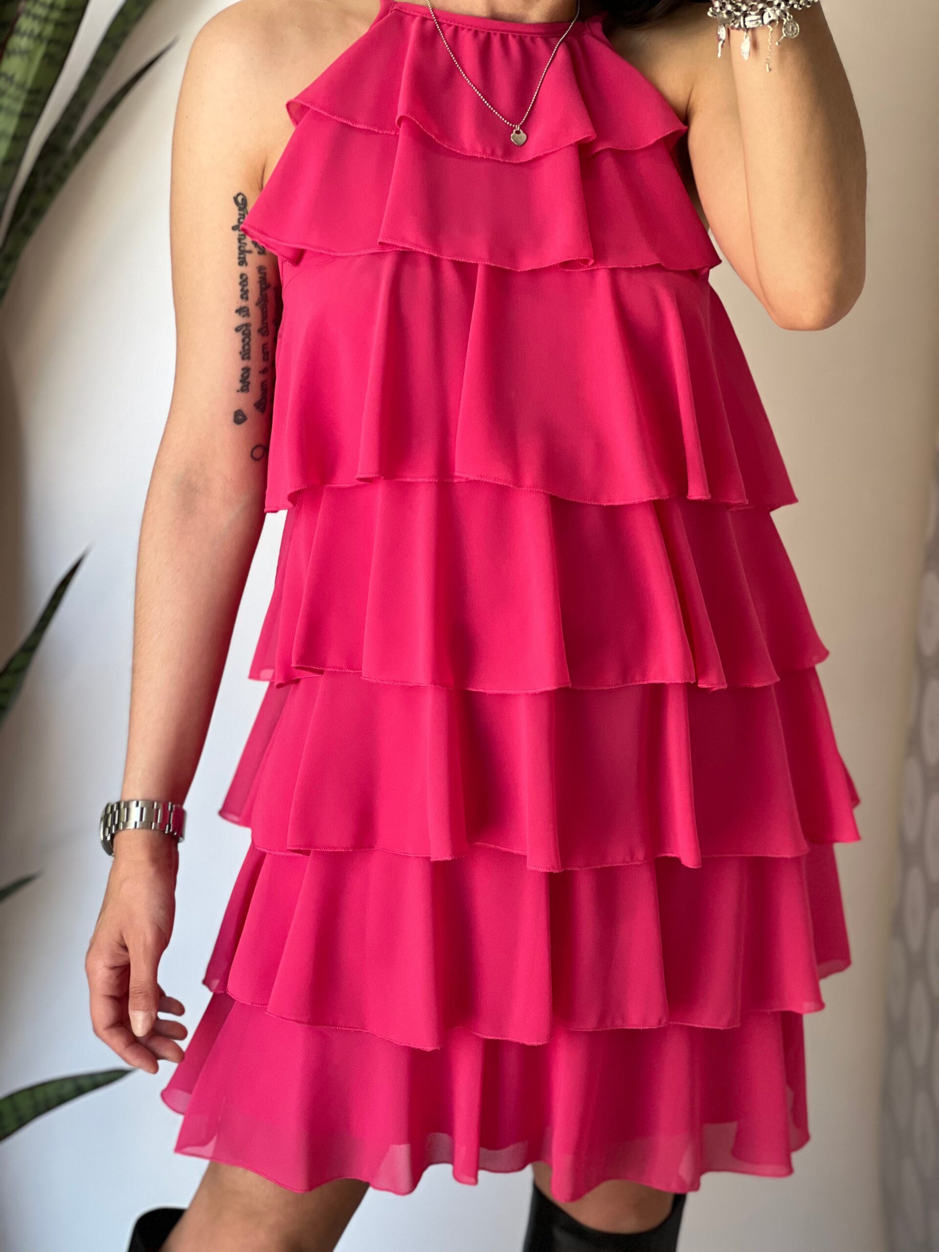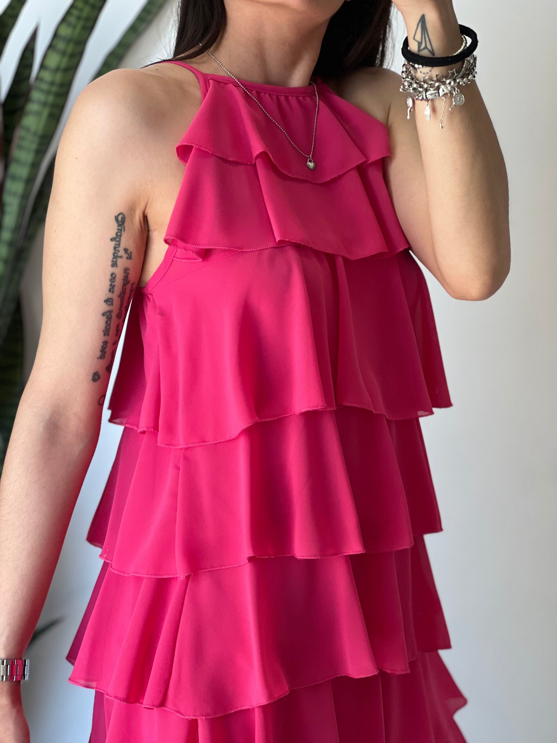 Abito in struttura di volant sovrapposti, spalline sottili regolabili, vestibilità morbida, fodera interna