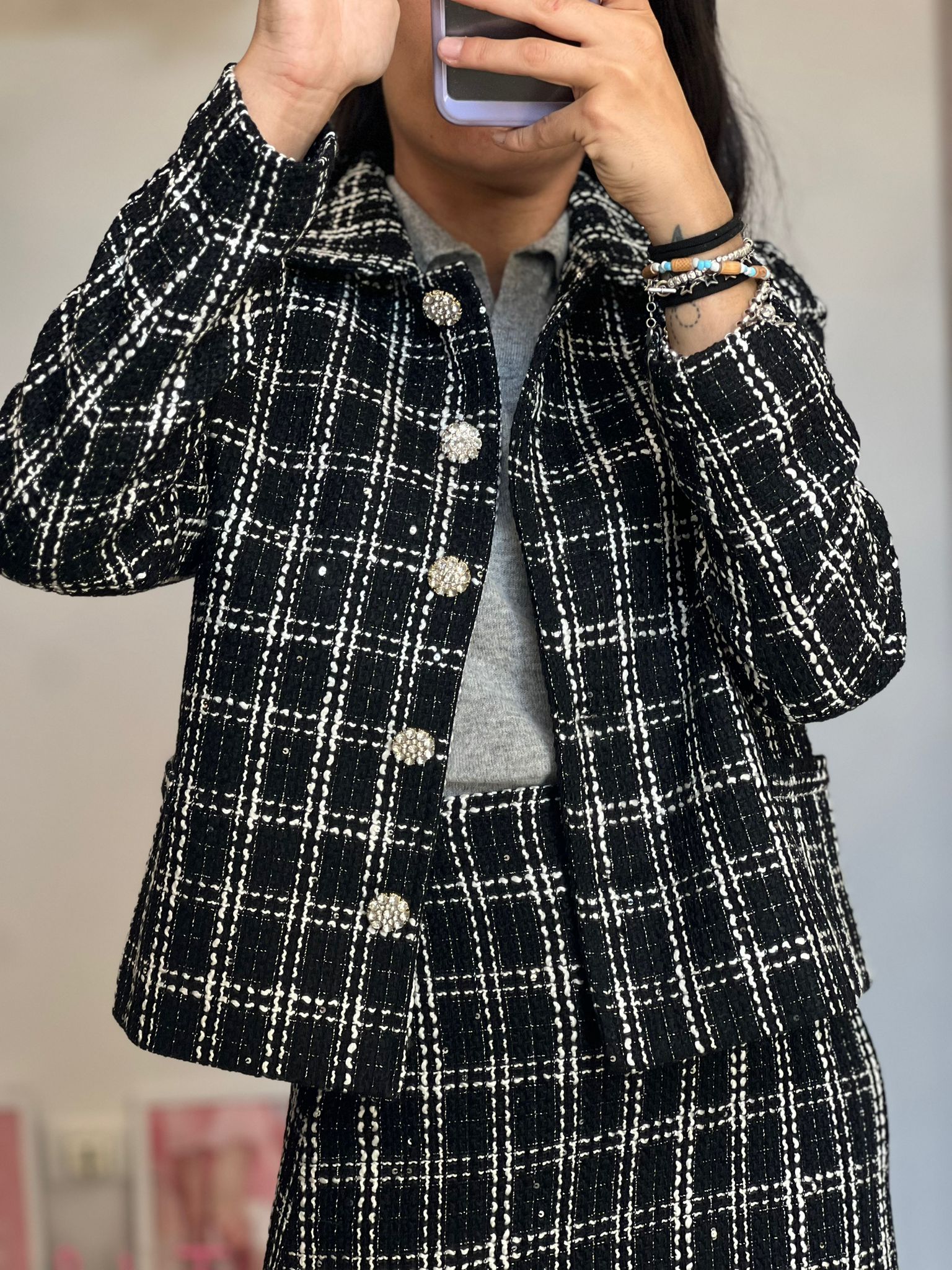 Giacchina taglio chanel in lavorazione tweed con chiusura monopetto a 4 bottoni gioiello, fit dritto, fodera interna, leggerissima spalla rinforzata, micro paillette sparse all over, dettagli filo lurex argento, doppia taschina frontale