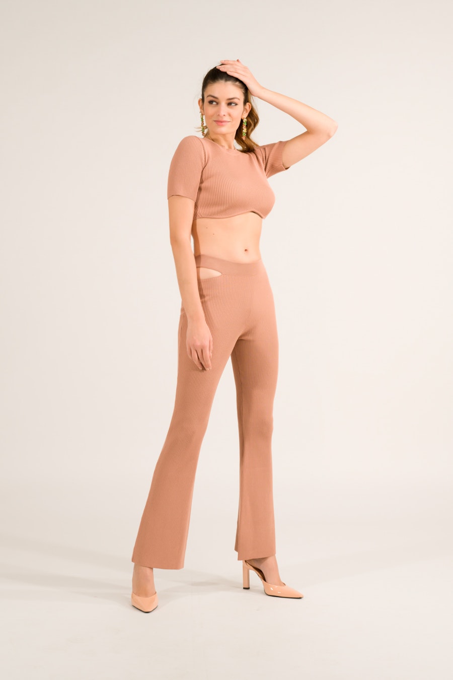 Pantalone flared cut out in vita, vita alta elasticizzato, struttura micro costina