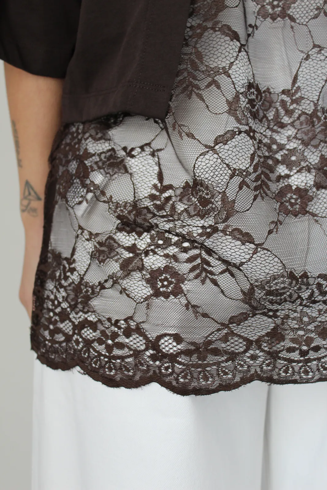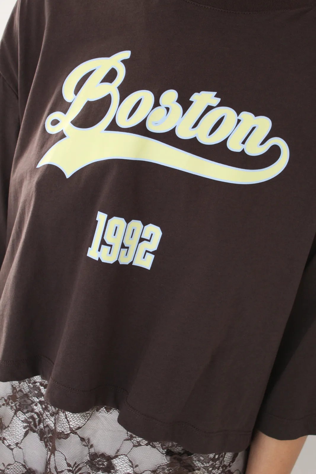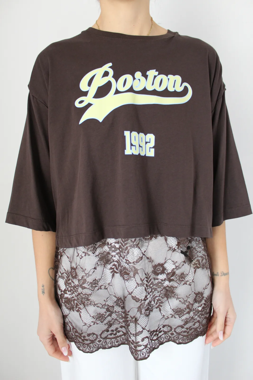 Maglia t-shirt cropped a scatola in stampa con inserto pizzo, spacco a V sulla schiena