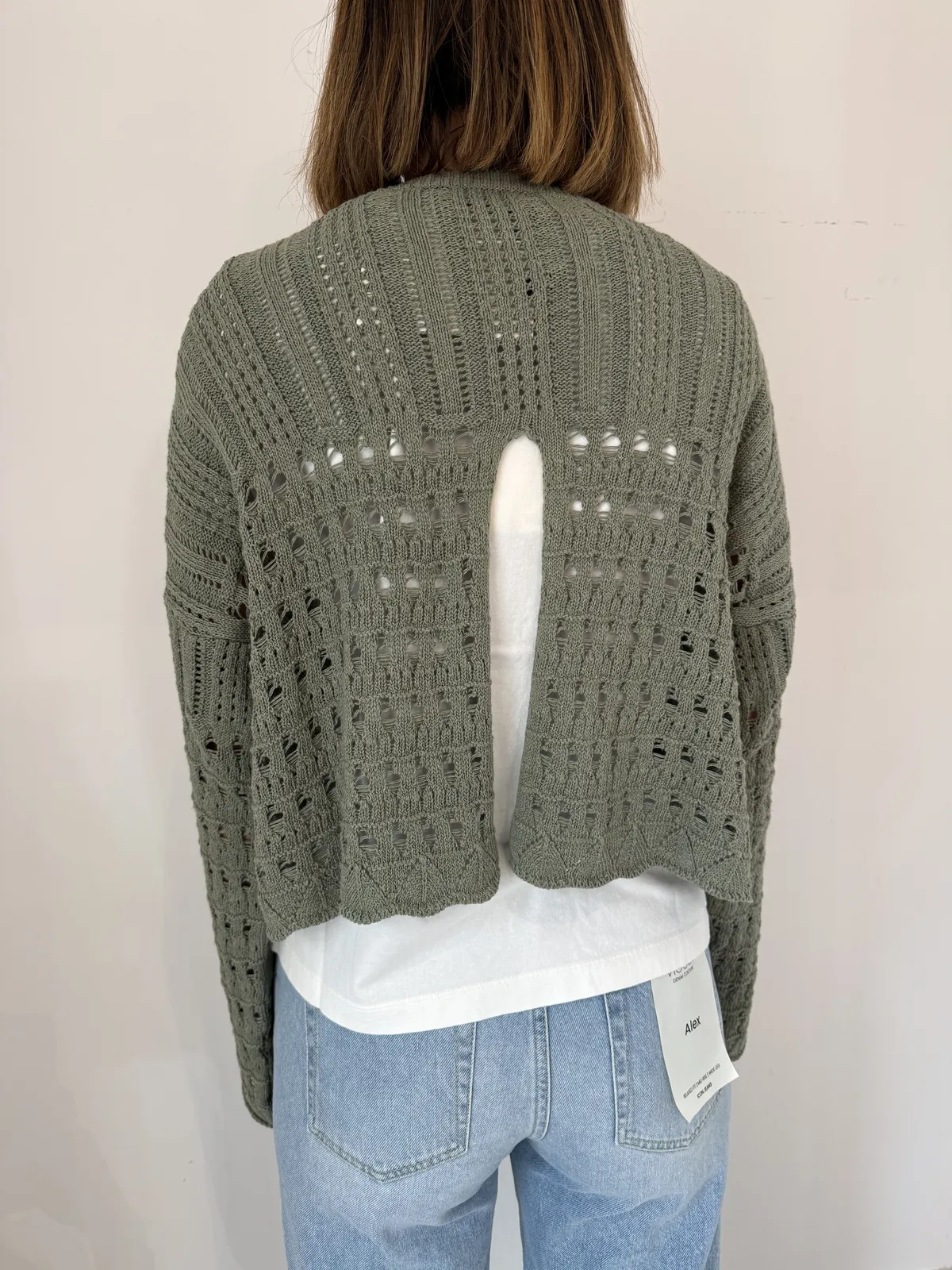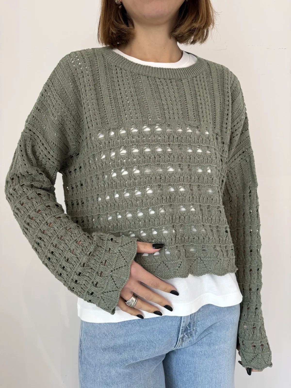 Maglia girocollo crochet con manica a trombetta e spacco dietro, fit scatola cropped