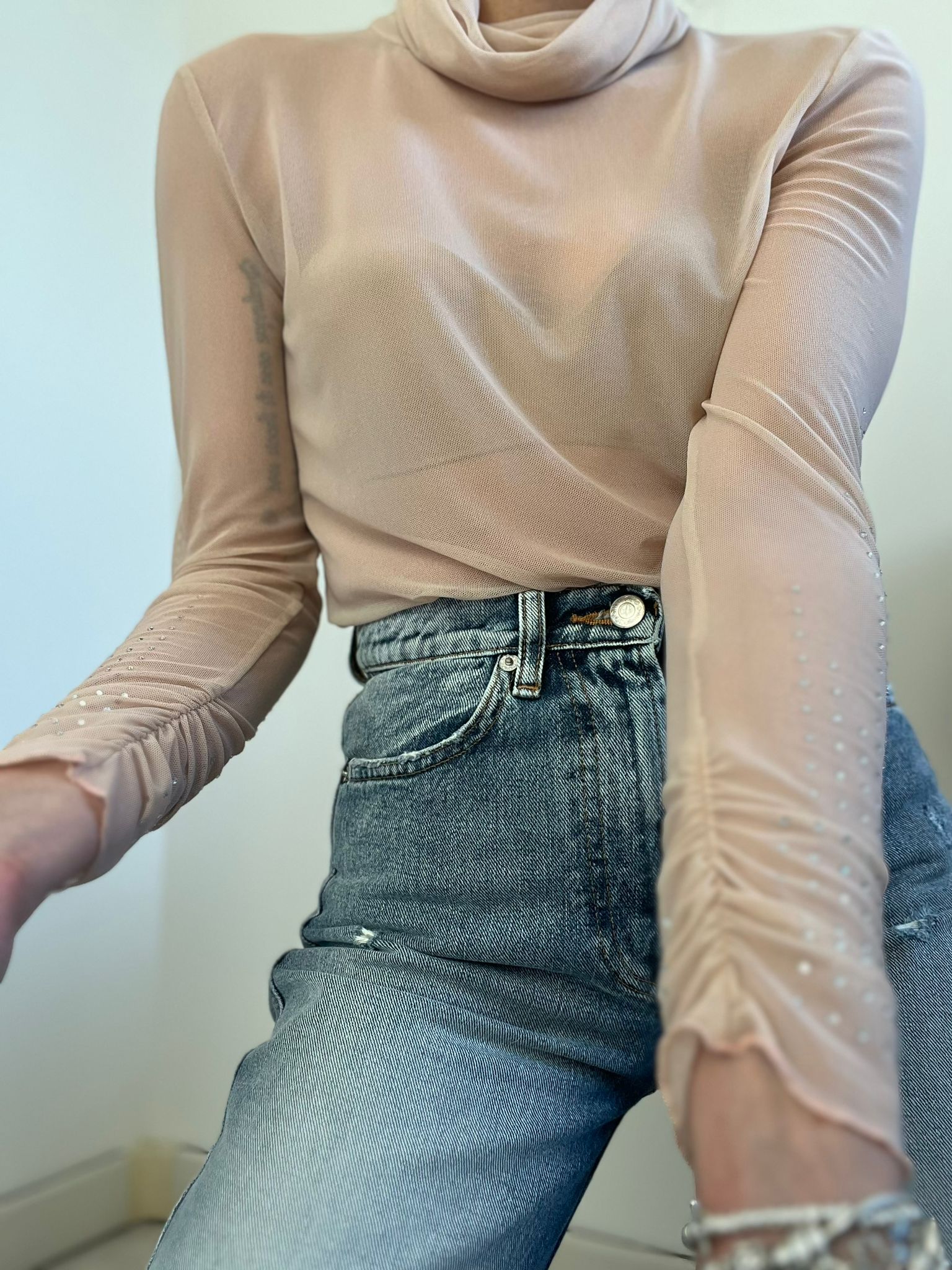 Maglia in georgette con collo morbido e applicazione strass su manica con dettaglio arriccio