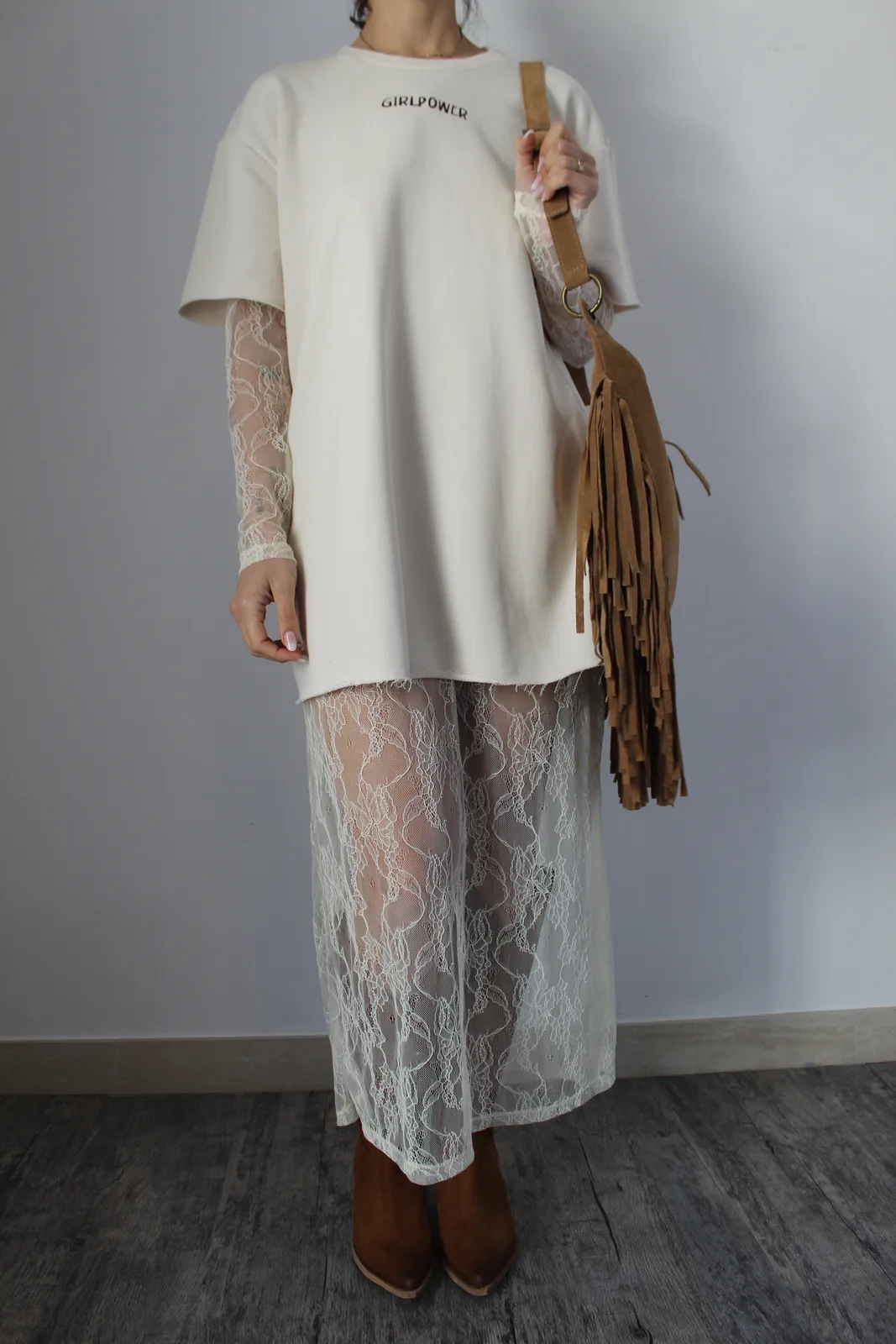 Maxi abito in felpa garzata con stampa GIRL POWER e inserto pizzo su maniche e sul fondo